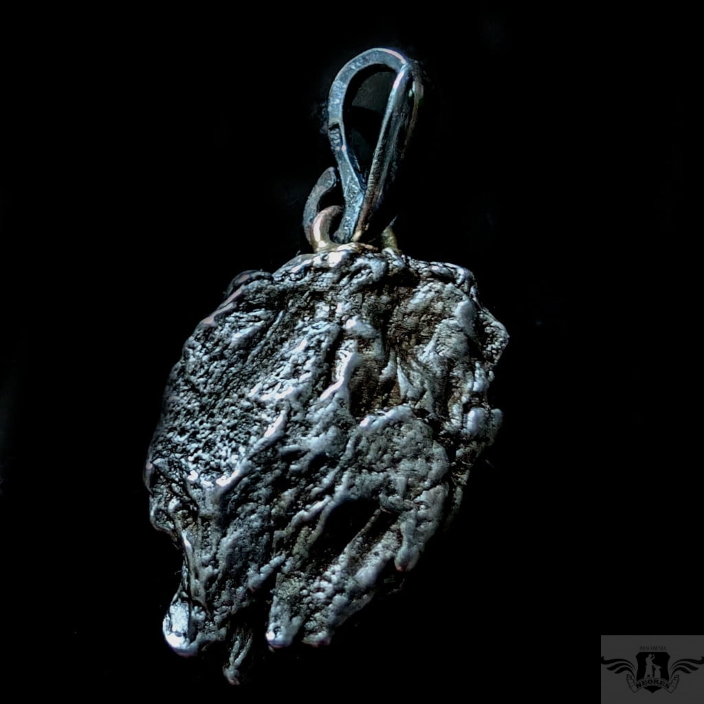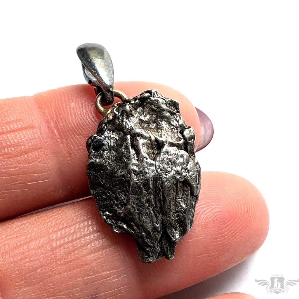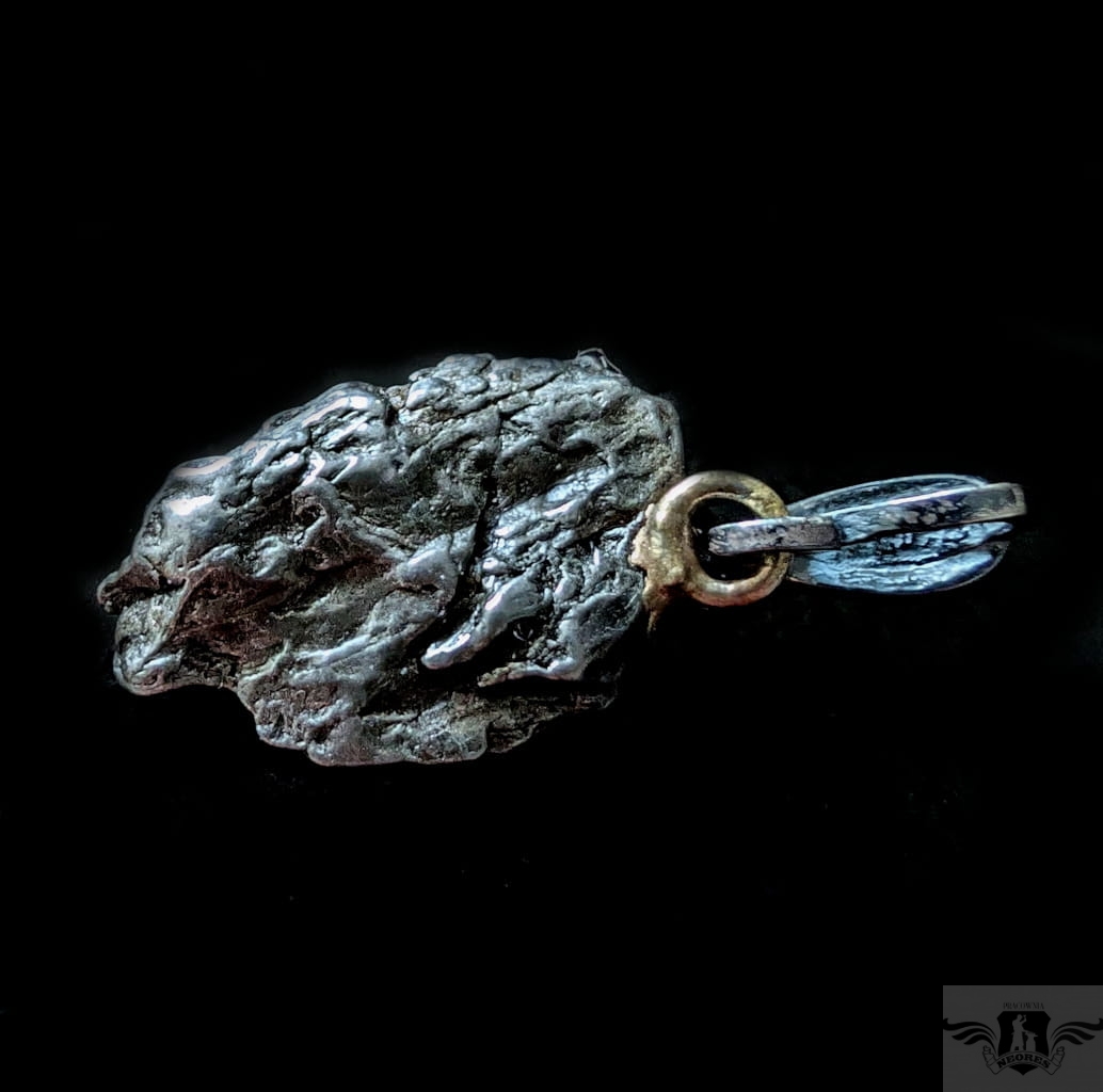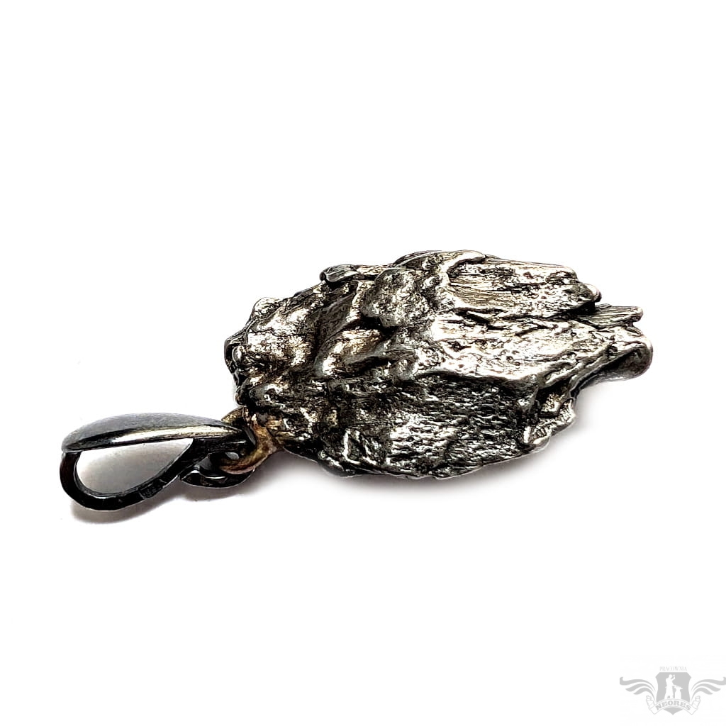 Wyjątkowy wisior z okazałym, meteorytem żelaznym Campo del Cielo, który znaleziono w 1576 roku w Argentynie. Meteorytom przypisywane są magiczne właściwości talizmanów. Z pewnością jest to niebanalny materiał jubilerski w ciekawy sposób zakomponowany w srebro.Uniwersalny,dla niego lub dla niej. Do meteorytu dołączona jest jego metryka. Wymiaty 22 x 16 mm, z krawatką z oksydowanego srebra długosć 33 mm, Waga wisiora 6,5 g. Wisior zostanie zapakowany w ozdobne pudełeczko.