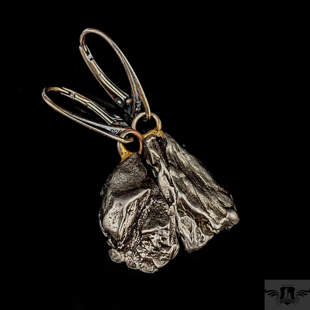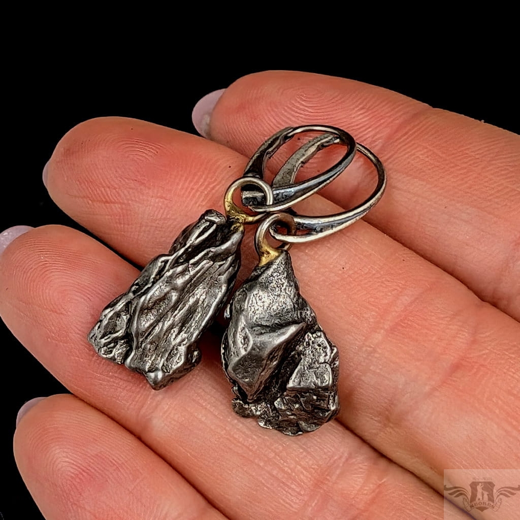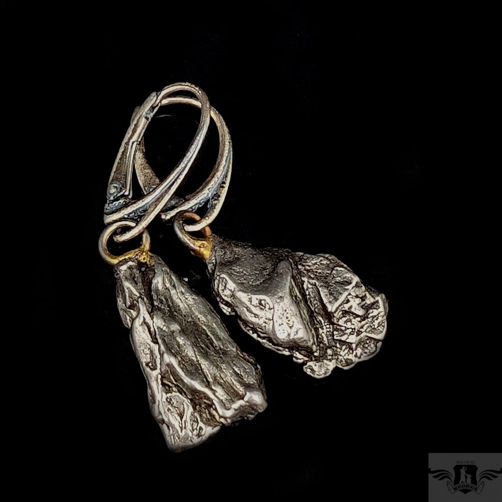 Kosmiczne kolczyki z meteorytami Campo Del Cielo (Argentyna) o kształcie nieregularnych bryłek na biglach angielskich z oksydowanego srebra próby 925. Wymiary elementów 18 x 6 mm. Długość z biglami angielskimi 36 mm. Lekkie, komfortowe i bardzo efektowne. Waga jednego kolczyka 3,5 grama. Kolczyki zostaną wysłane w ozdobnym pudełeczku.