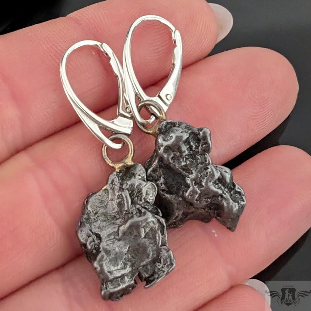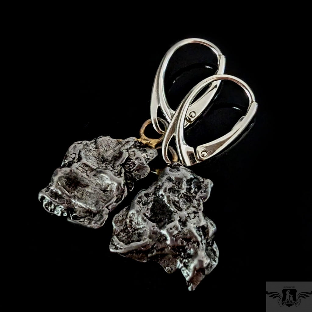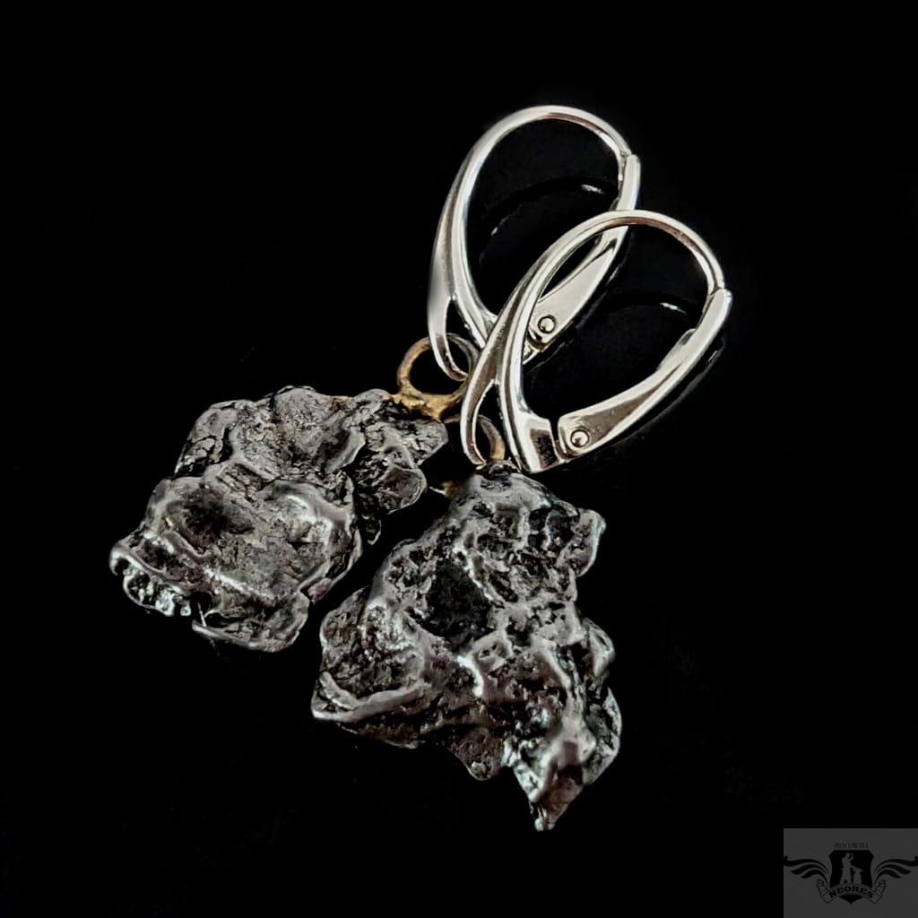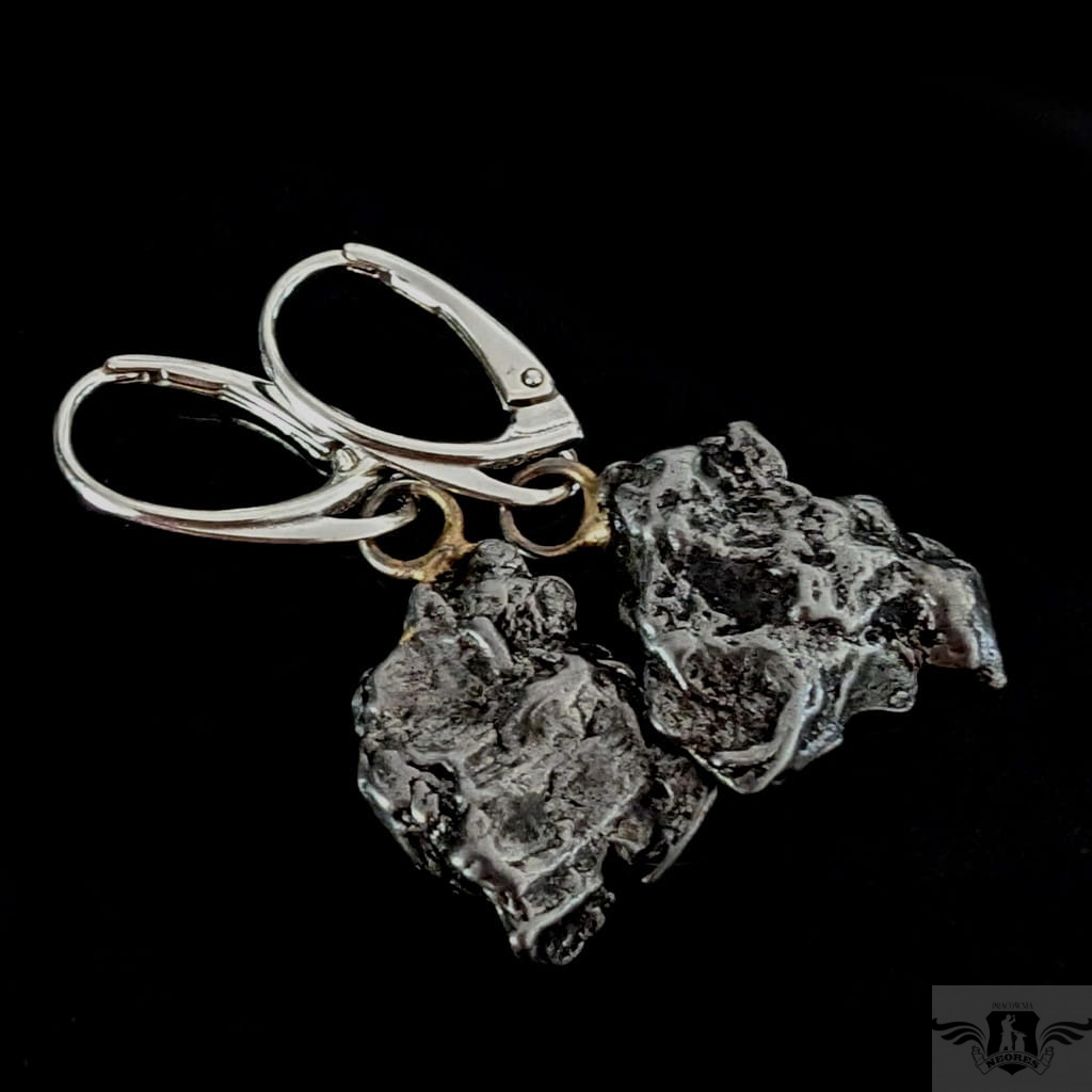 Kosmiczne kolczyki z meteorytami Campo Del Cielo (Argentyna) o kształcie nieregularnych bryłek na biglach angielskich z oksydowanego srebra próby 925. Wymiary elementów 20 x 17 mm. Długość z biglami angielskimi 40 mm. Lekkie, komfortowe i bardzo efektowne. Waga jednego kolczyka 4,5 grama. Kolczyki zostaną wysłane w ozdobnym pudełeczku.