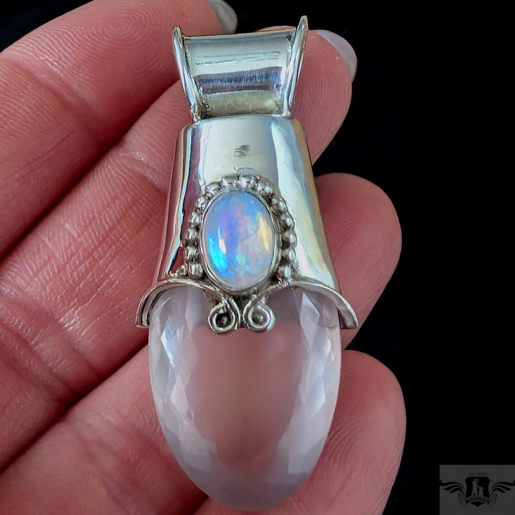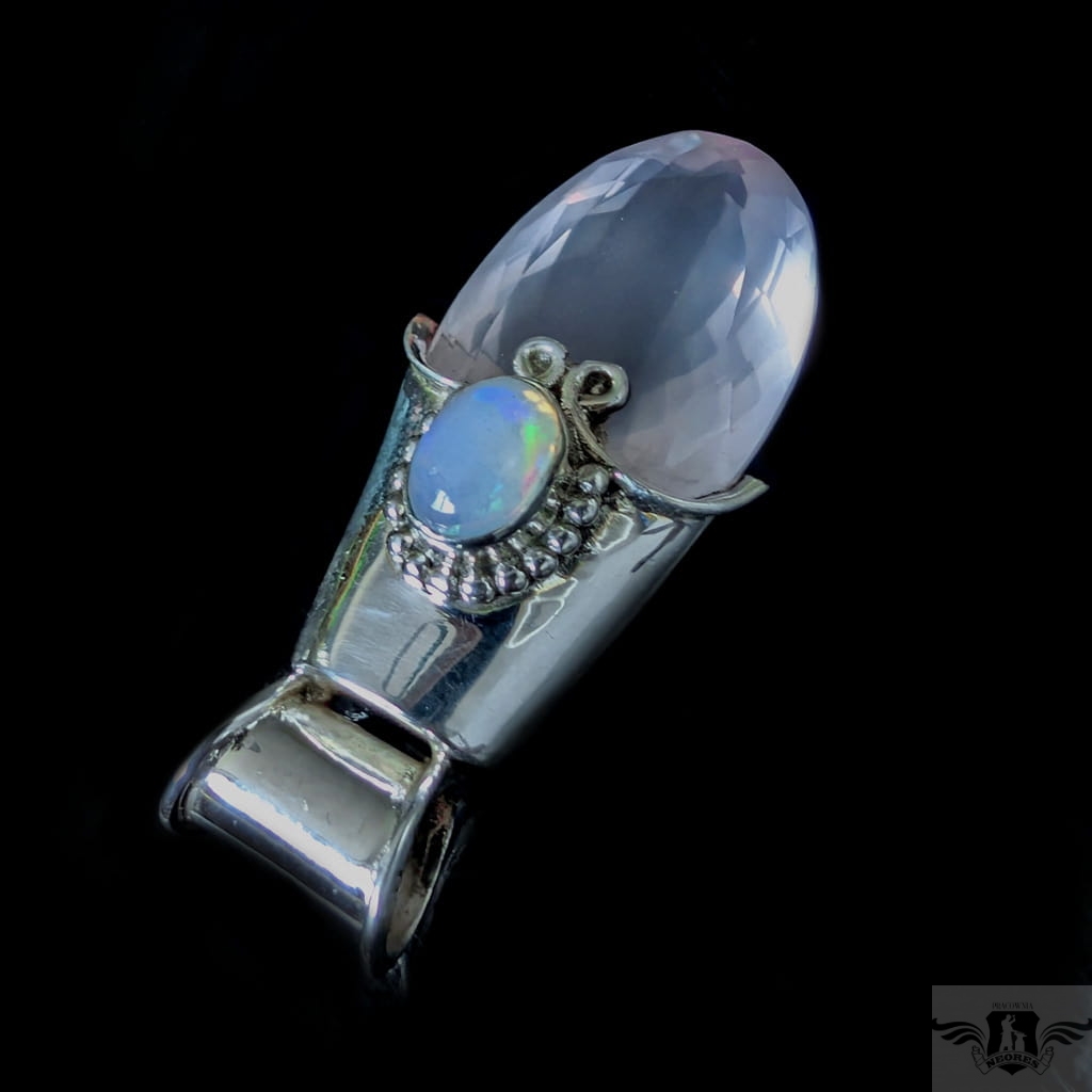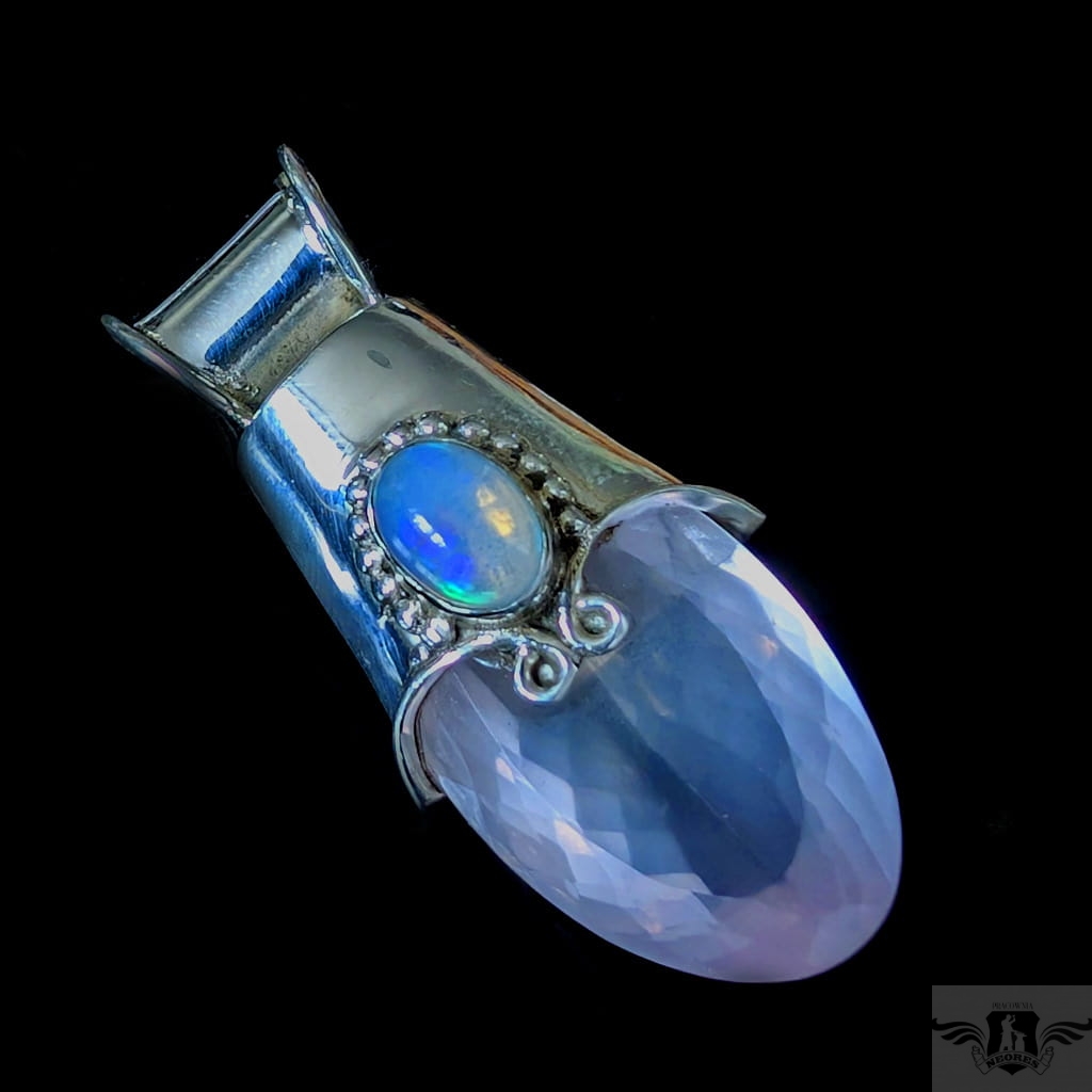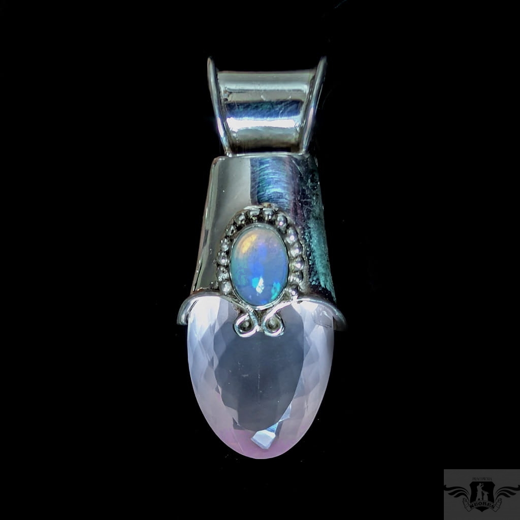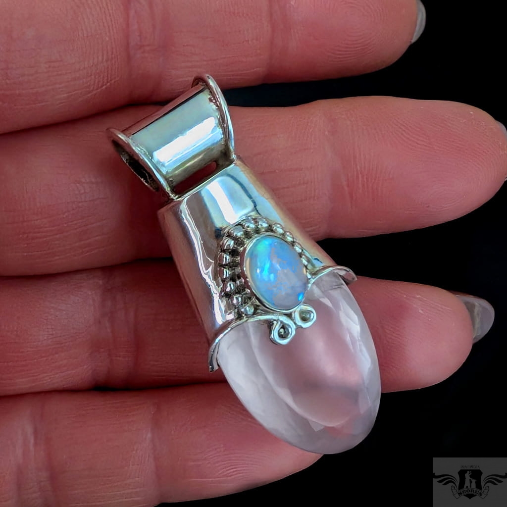 Oryginalny wisior wykonany ze srebra próby 925 oraz pięknego, fasetowanego kwarcu różowego. Koronę wisiora wienczy opal z Etiopii. Wymiary całego wisiora 45 x 20 mm, oprawa opalu 8 x 6 mm. Wisior waży 13,7 g. Wisior zostanie zapakowany w ozdobne pudełeczko. Wykonany przez dostawcę kamieni.