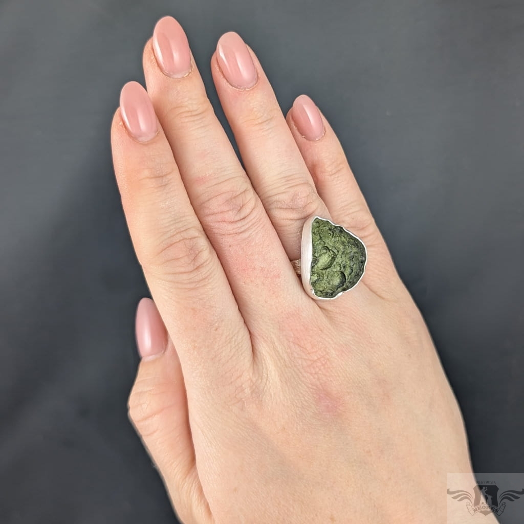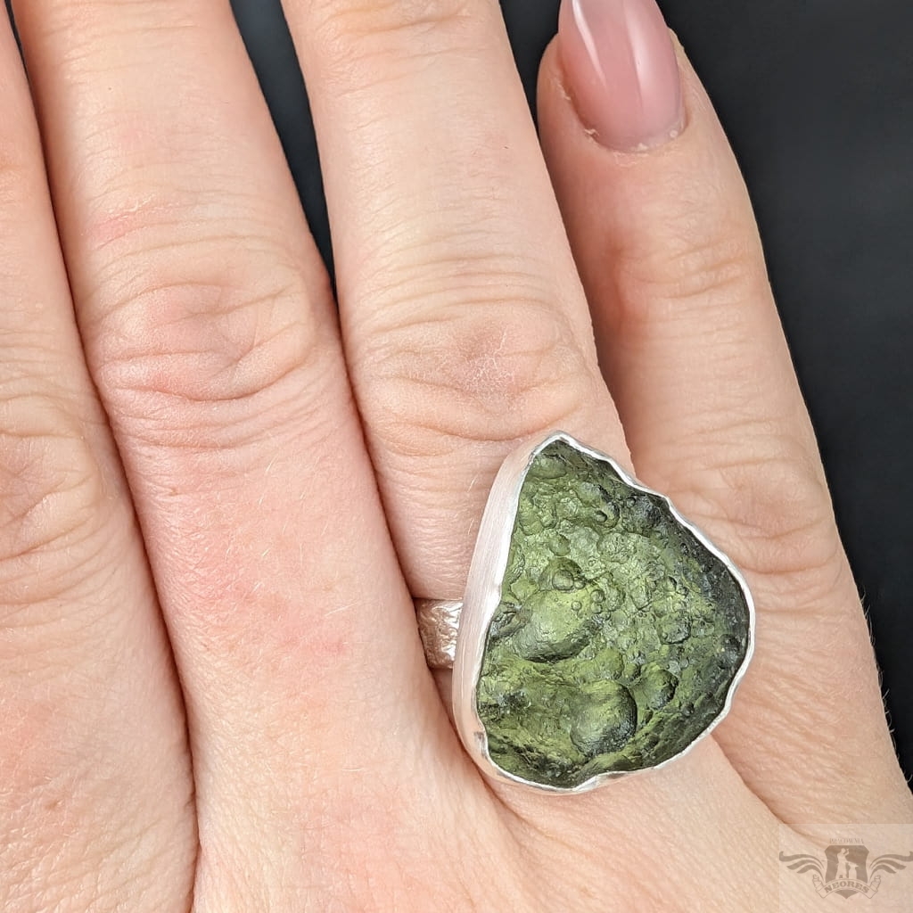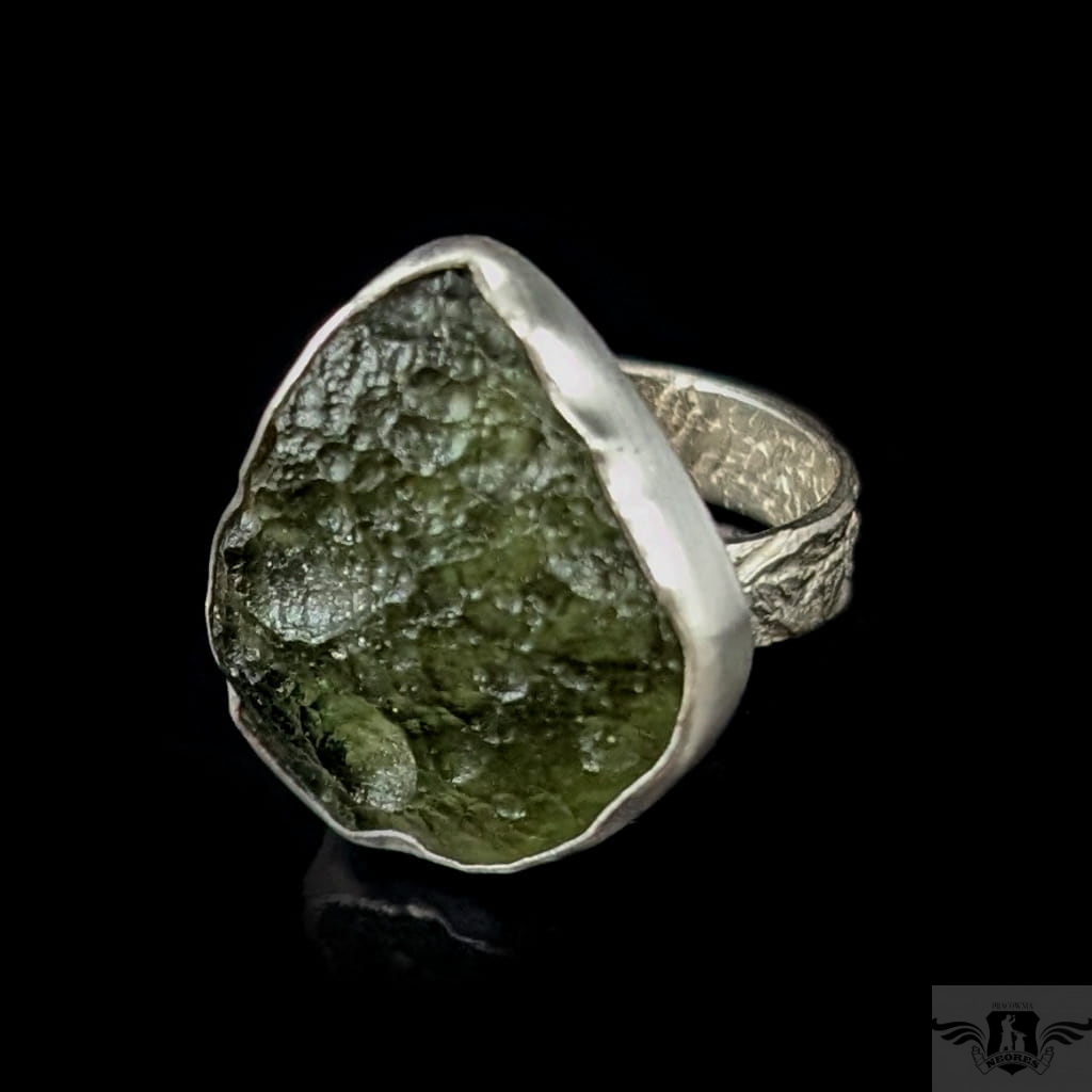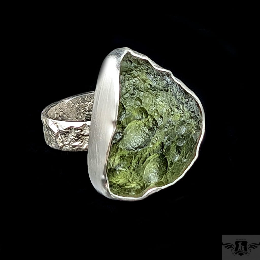 Surowy pierścień z oprawiony w srebro pr. 925 okazem przejrzystego, pięknego mołdawitu, wspaniala jakość kamienia. Mołdawit lub inaczej wełtawit to rodzaj tektytu,który pochodzi z krateru meteorytowego o nazwie Ries na południu Niemiec. Wymiary oprawy 23 x 21 mm. Waga 7,4 g. Rozmiar jubilerski 14, bez zmiany rozmiaru, obrączka ma 5 mm szerokości. Pierścionek zostanie wysłany w ozdobnym pudełeczku.