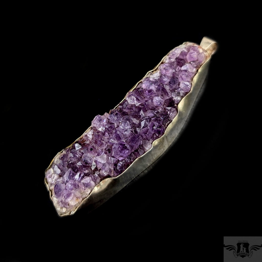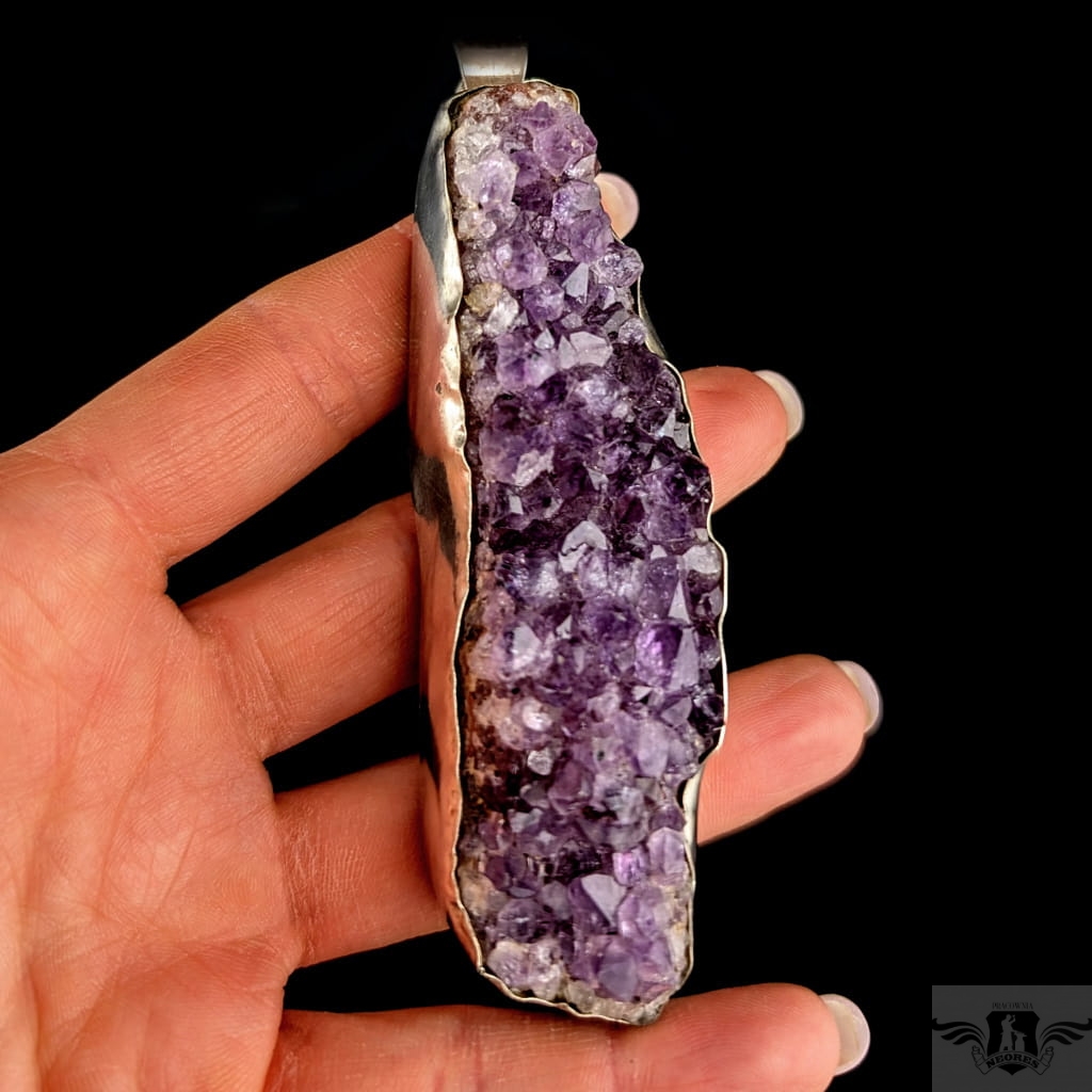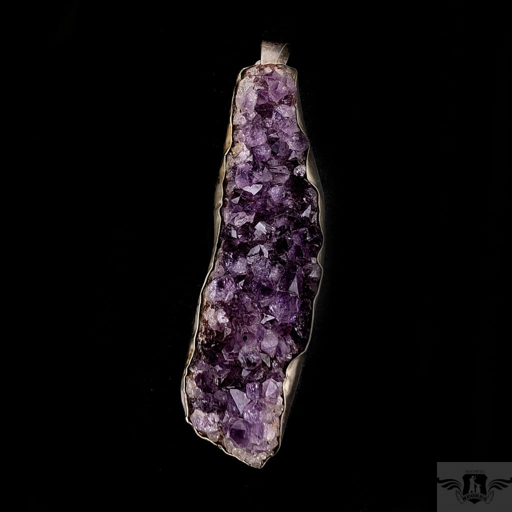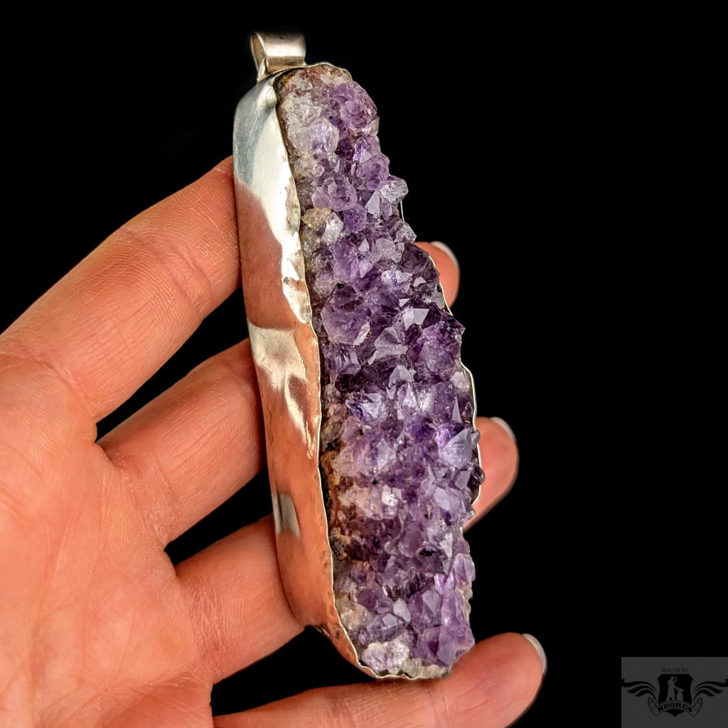 Mineralny wisior wykonany ze srebra próby 925 oraz przepięknego mineralnego ametystu o strukturze kryształów. Wymiary oprawy ametystu 9,7 x 3 cm. Długość z krawatką 11 cm. Waga 101 g. Wisior zostanie zapakowany w ozdobne pudełeczko.
