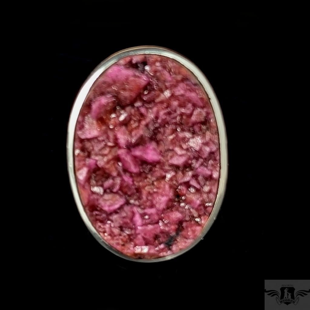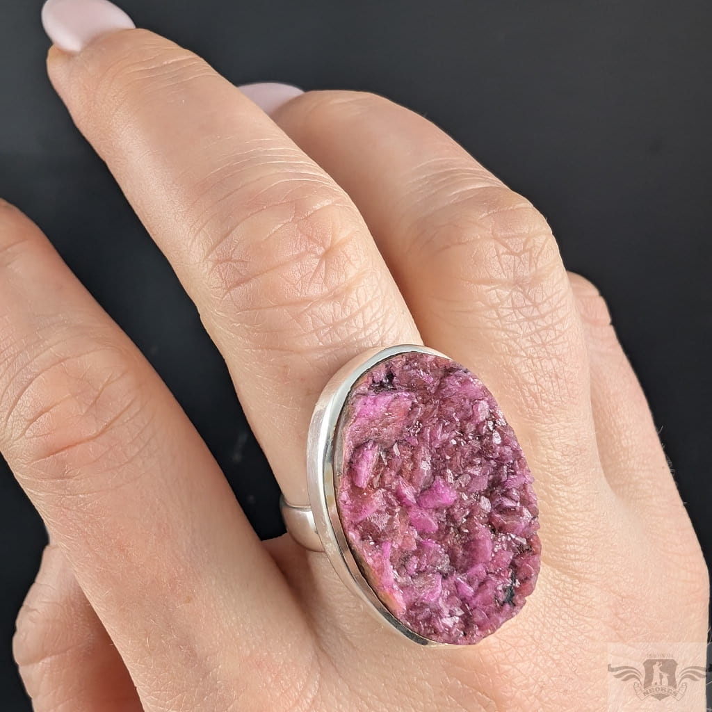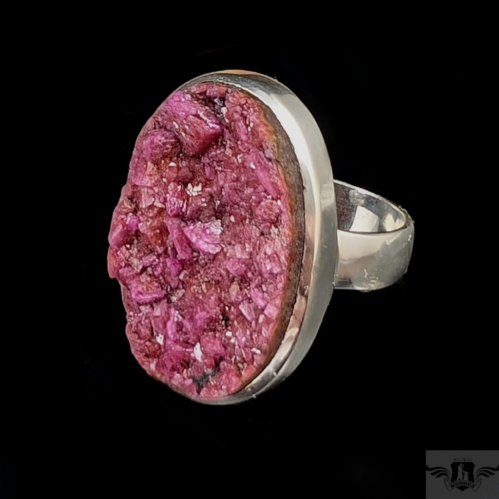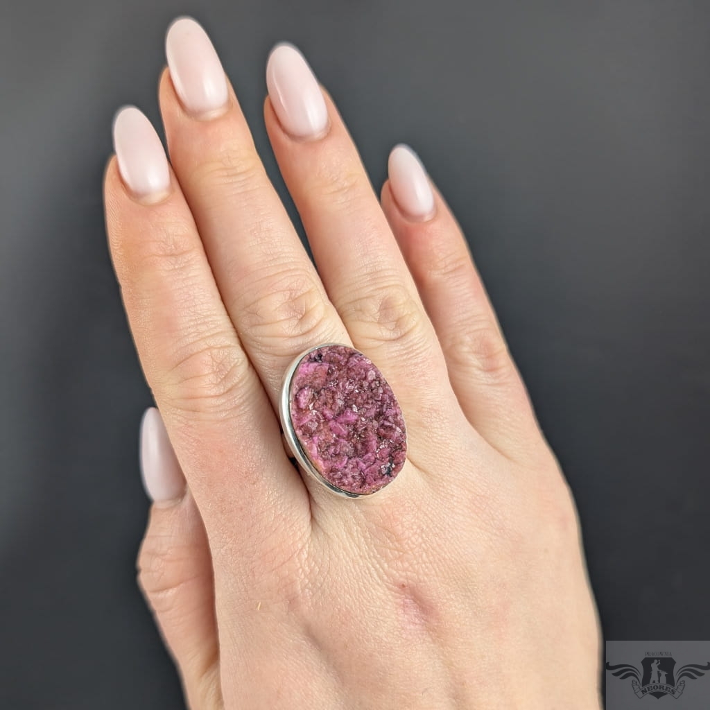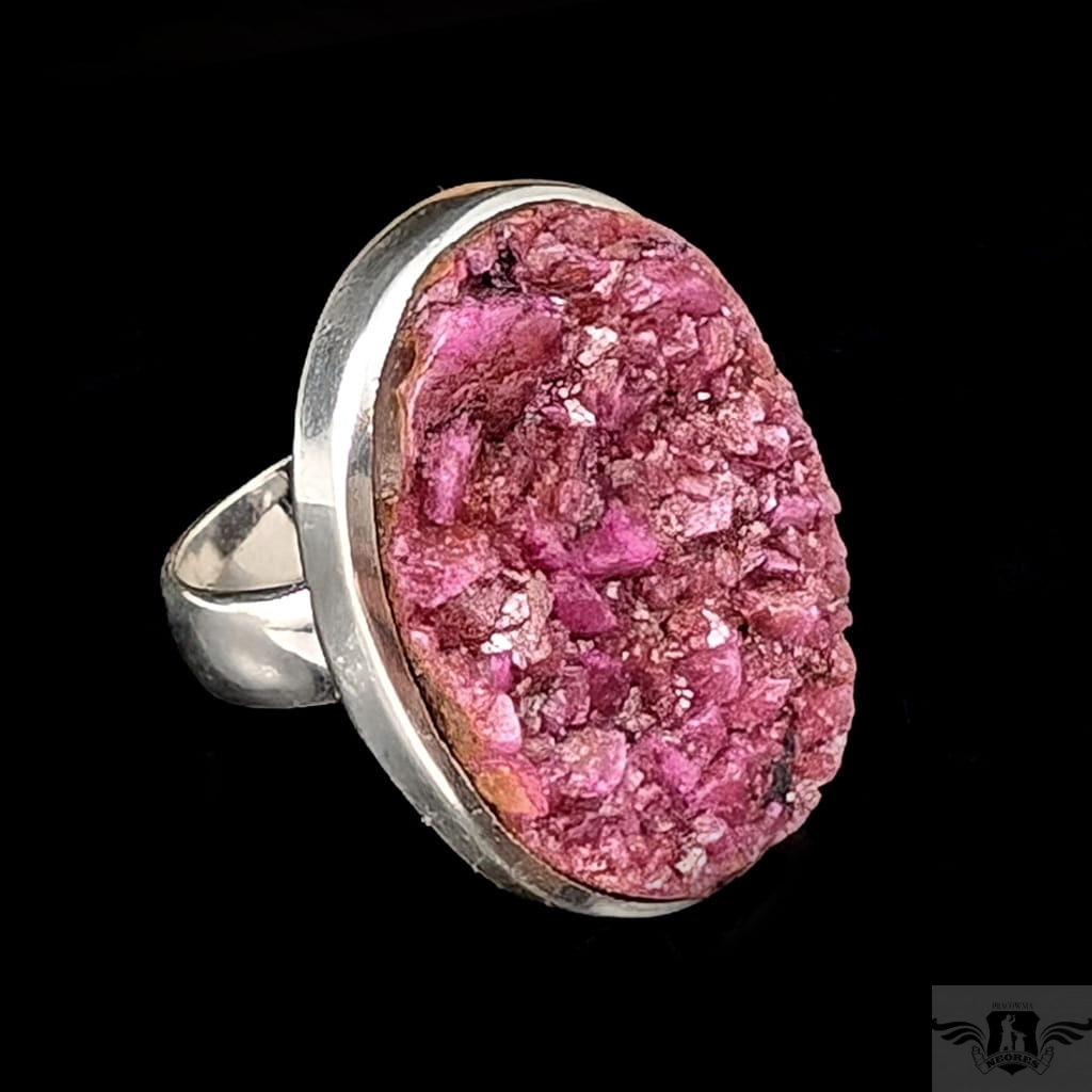 Pierścień z oprawionym w srebro próby 925 pięknym intensywnie różowym kobaltokalcytem o pięknie wykształconych kryształach. Szerokość obrączki 5 mm. Kamień ma oprawę 30 x 21 mm. Rozmiar jubilerski regulowany w wąskim zakresie,15-20 proszę napisać na jaki ustawić. Waga 11,84grama. Wykonany przez dostawcę kamieni. Pierścień zapakowany zostanie w ozdobne pudełeczko.