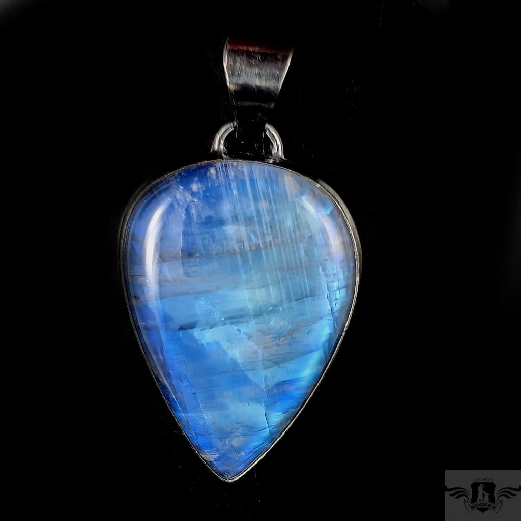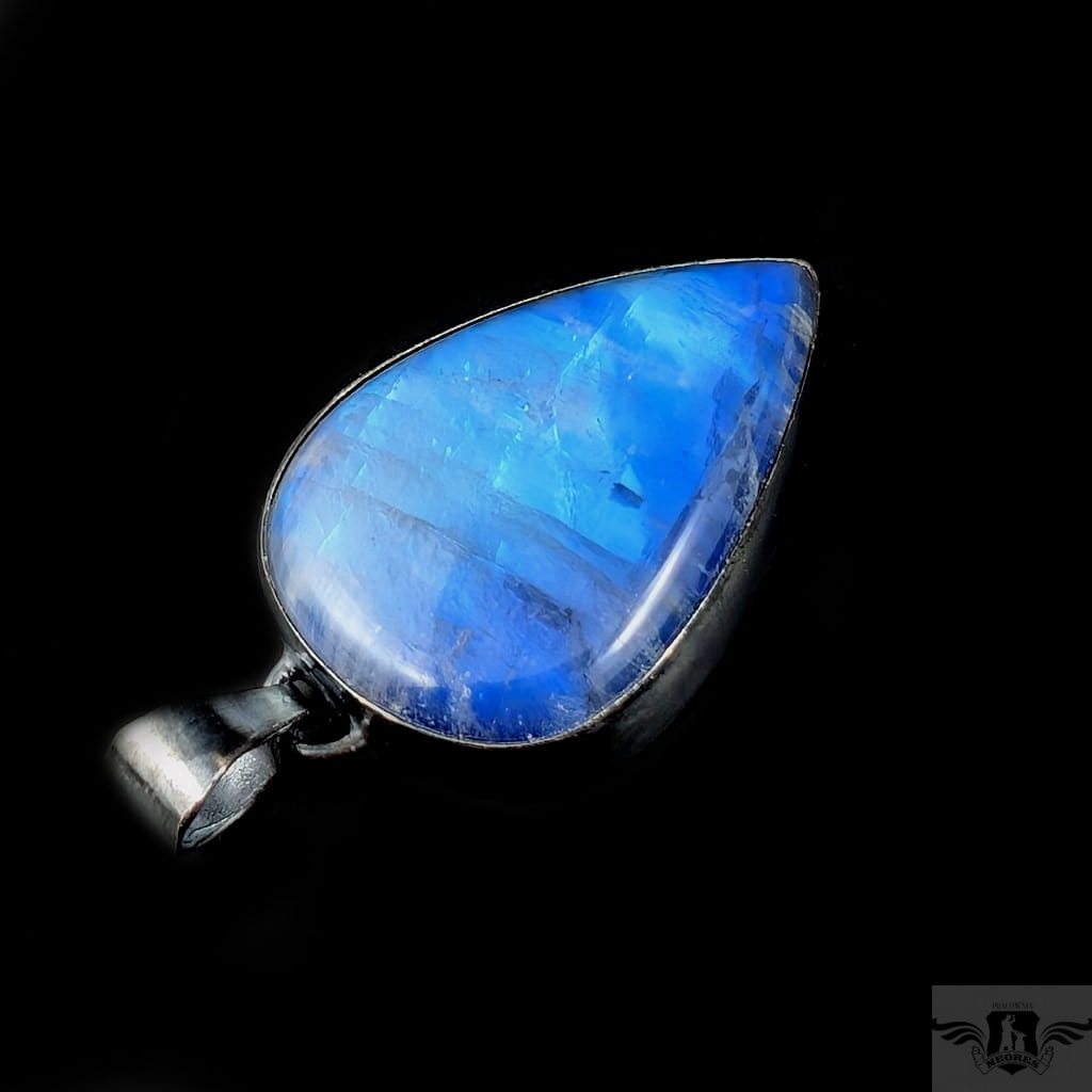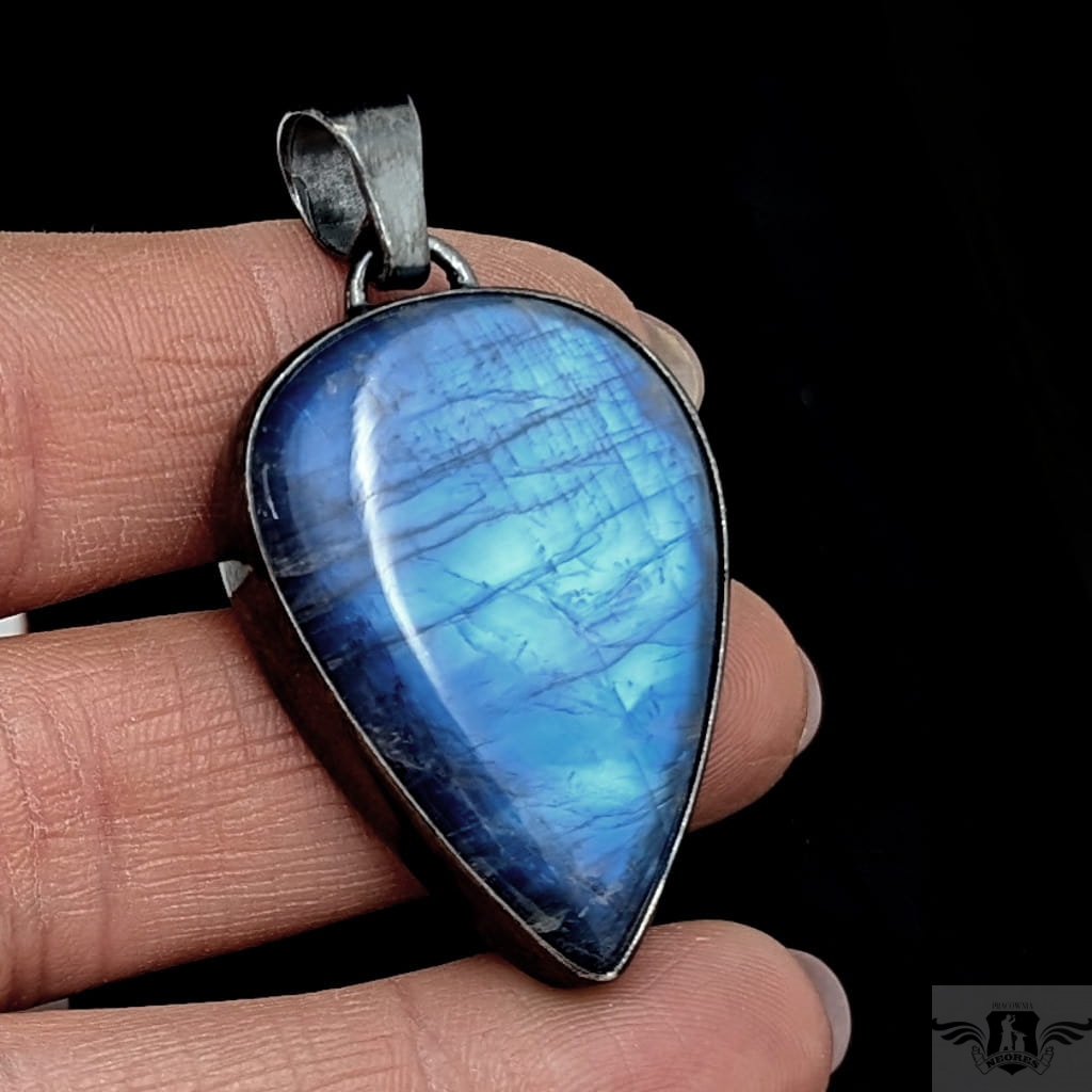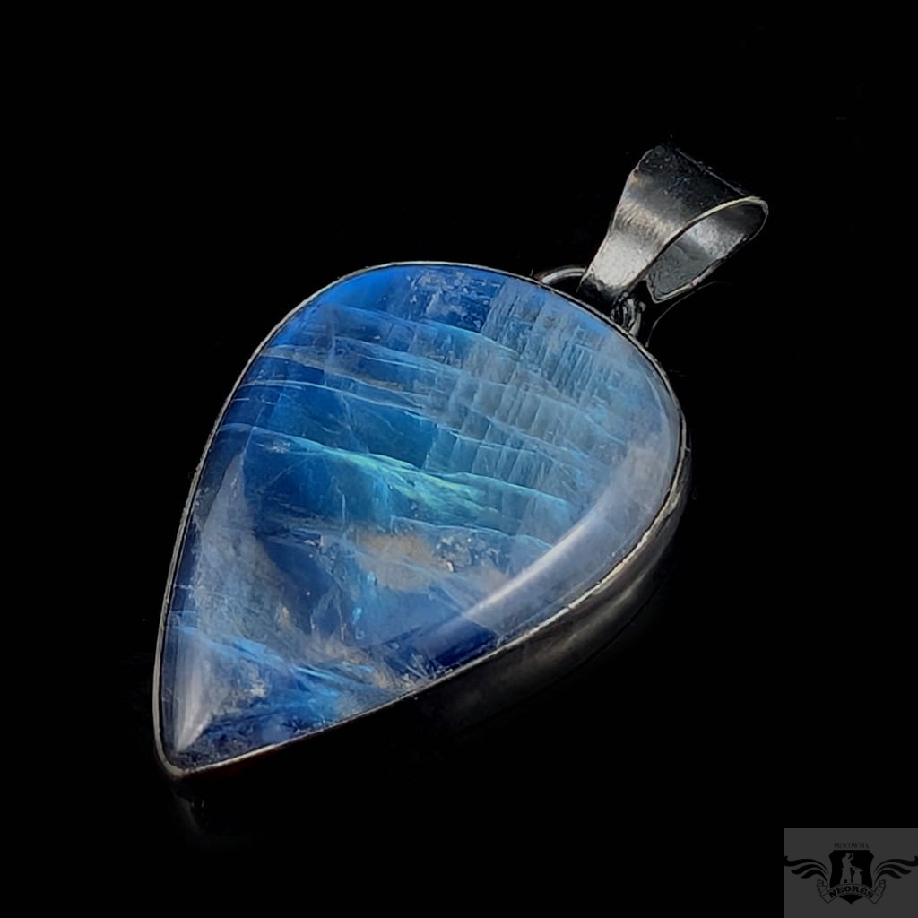 Uroczy wisior wykonany z oksydowanego srebra próby 925 oraz wspaniałego naturalnego kamienia księżycowego. Srebro oksydowane. Długość całkowita 50 mm, wymiary oprawy kamienia 36 x 26 mm. Waga 19 gramów. Zapakowany w ozdobne pudełeczko.