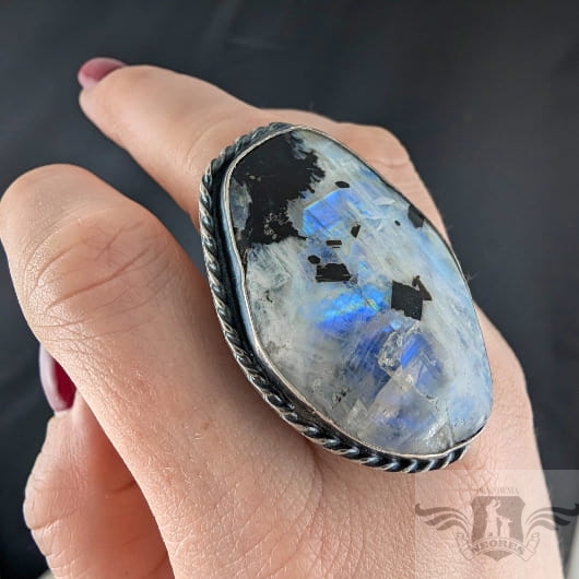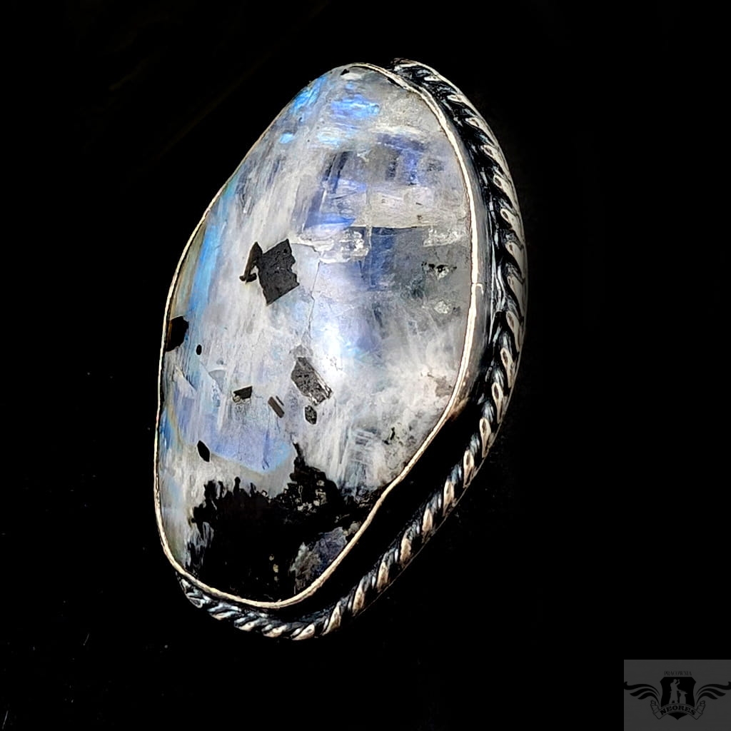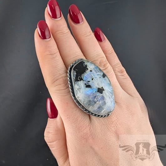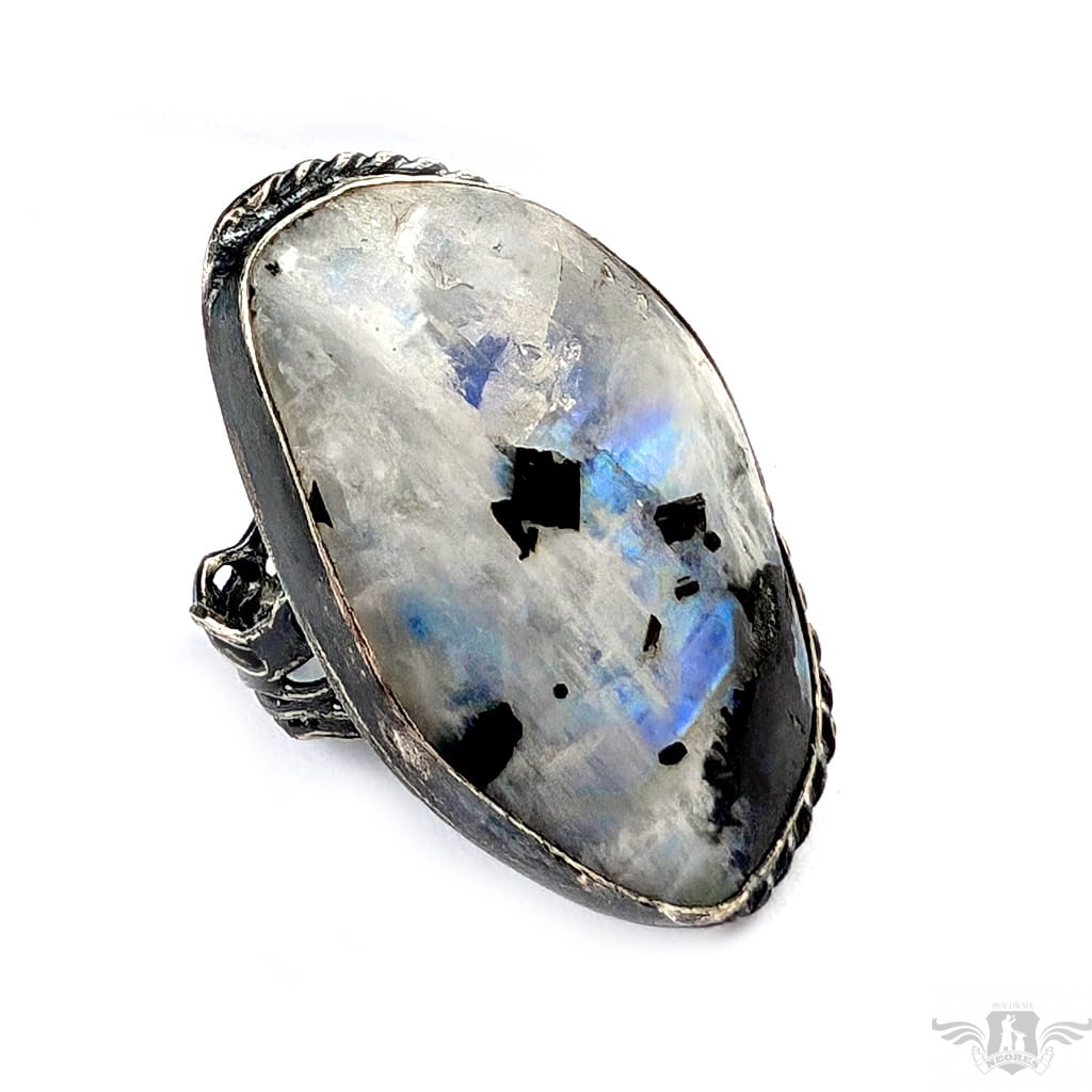 Zjawiskowy, bardzo okazały pierścień z oprawionym w oksydowaną ramę srebra próby 925 pięknym, naturalnym kamieniem księżycowym. Obrączka szerokość 13 mm. Wymiary oprawy pierścionka 47 x 32 mm. Rozmiar jubilerski 17, mogę powiększyć na max 19, Waga 23.6 g. Pierścień zapakowany zostanie w ozdobne pudełeczko.