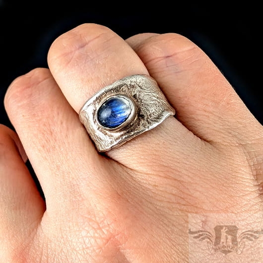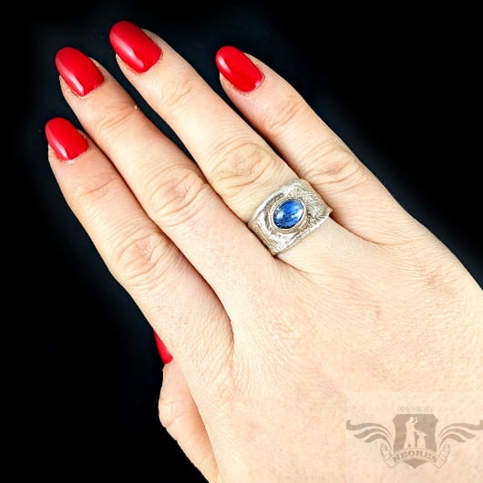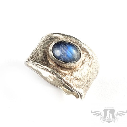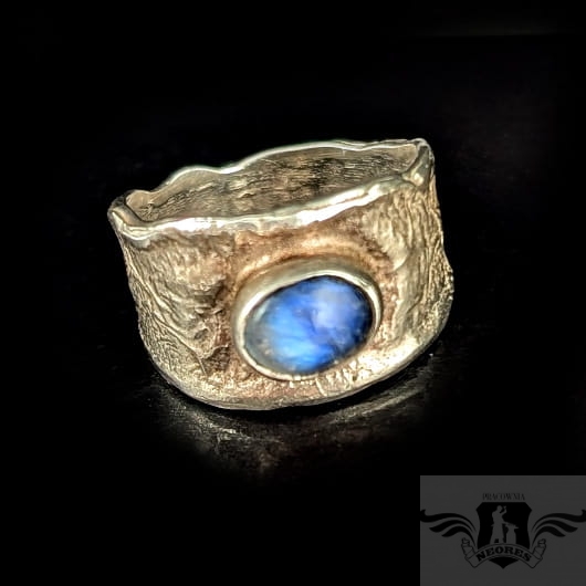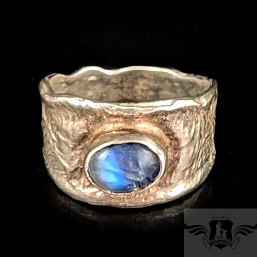 Bardzo kobiecy pierścionek z oprawionym w srebro próby 925 pięknym, naturalnym kamieniem księżycowym o błękitnej i poświecie. Wymiary oprawy pierścionka 9 x 7 mm. Rozmiar jubilerski 15, mogę powiększyć na max. 16. Waga 5 g.