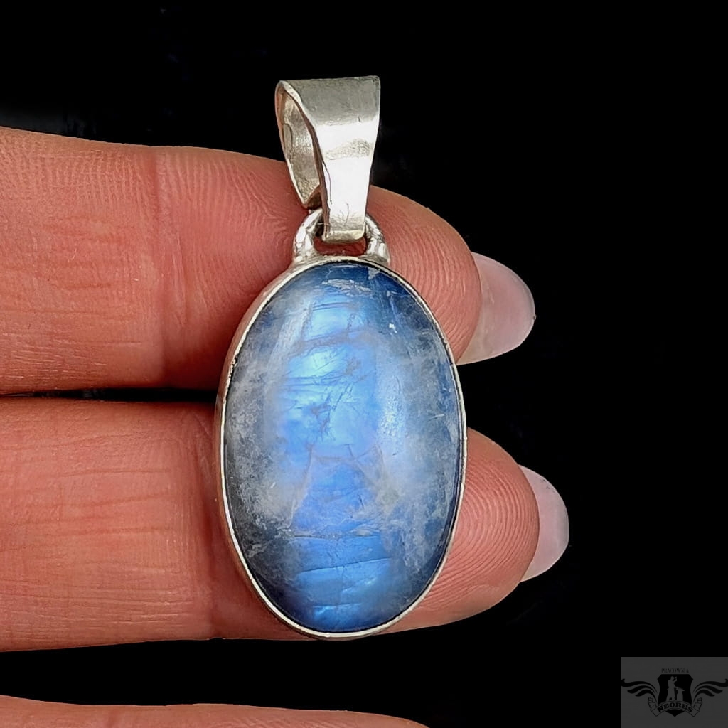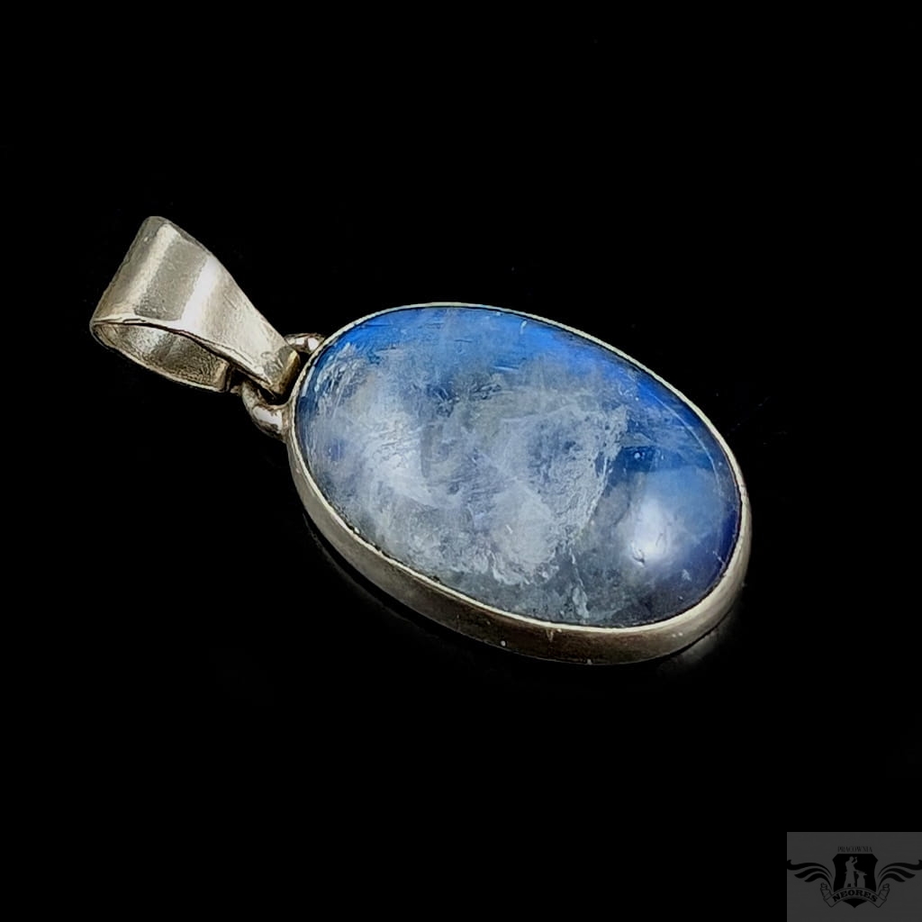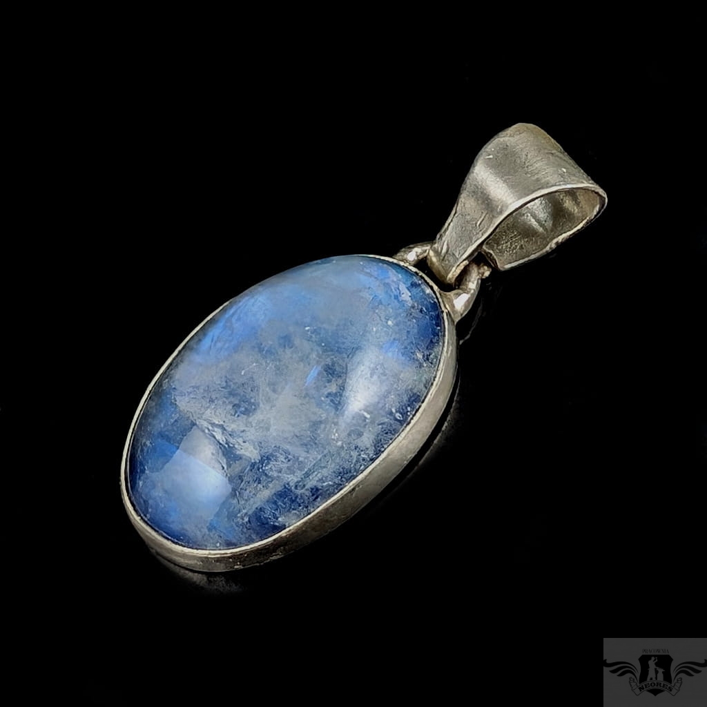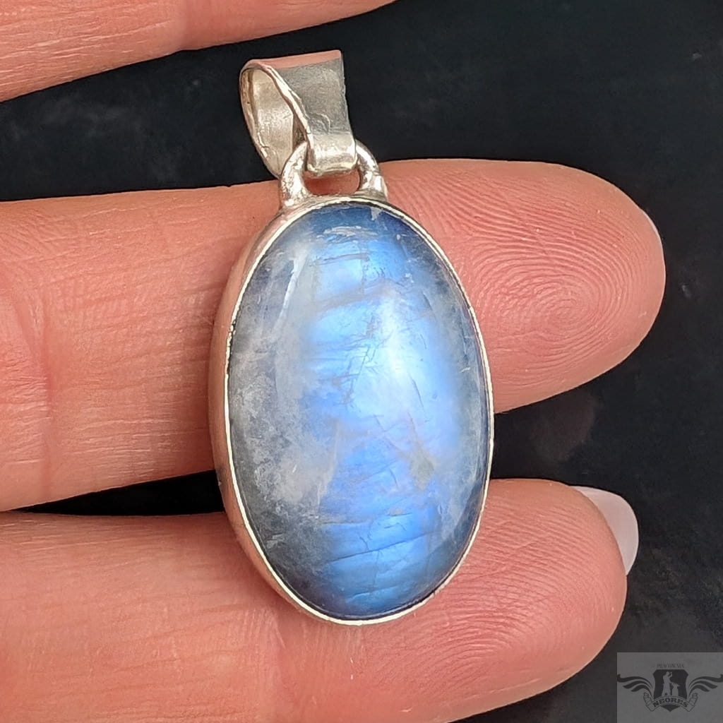 Uroczy wisiorek własnoręcznie wykonany ze srebra próby 925 oraz kamienia księżycowego. Długość całkowita 38mm, wymiary oprawy kamienia 28 x 16 mm. Waga 7 gramów. Zapakowany w ozdobne pudełeczko.
