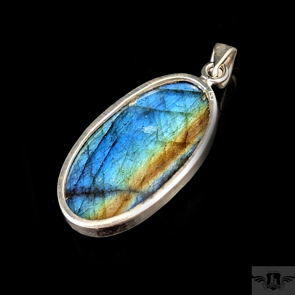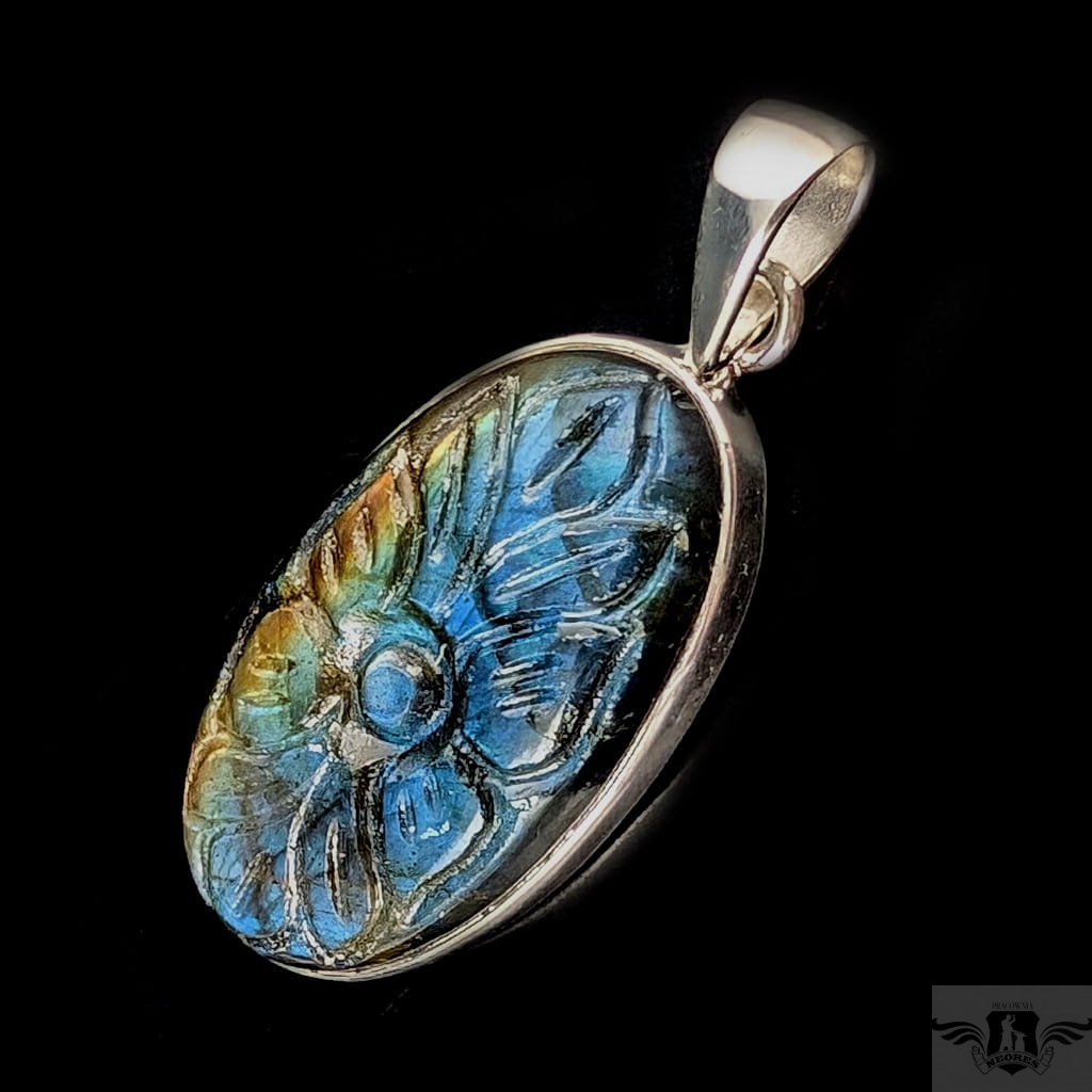 Elegancki wisiorek ze srebra próby 925 oraz labradorytu z wyrzeźbionym wzorem kwiatowym. Długość 42 mm. Wymiary 32 x 18 mm. Waga 9.9 g. Wykonany przez dostawcę kamieni, polecam, piękny kamien