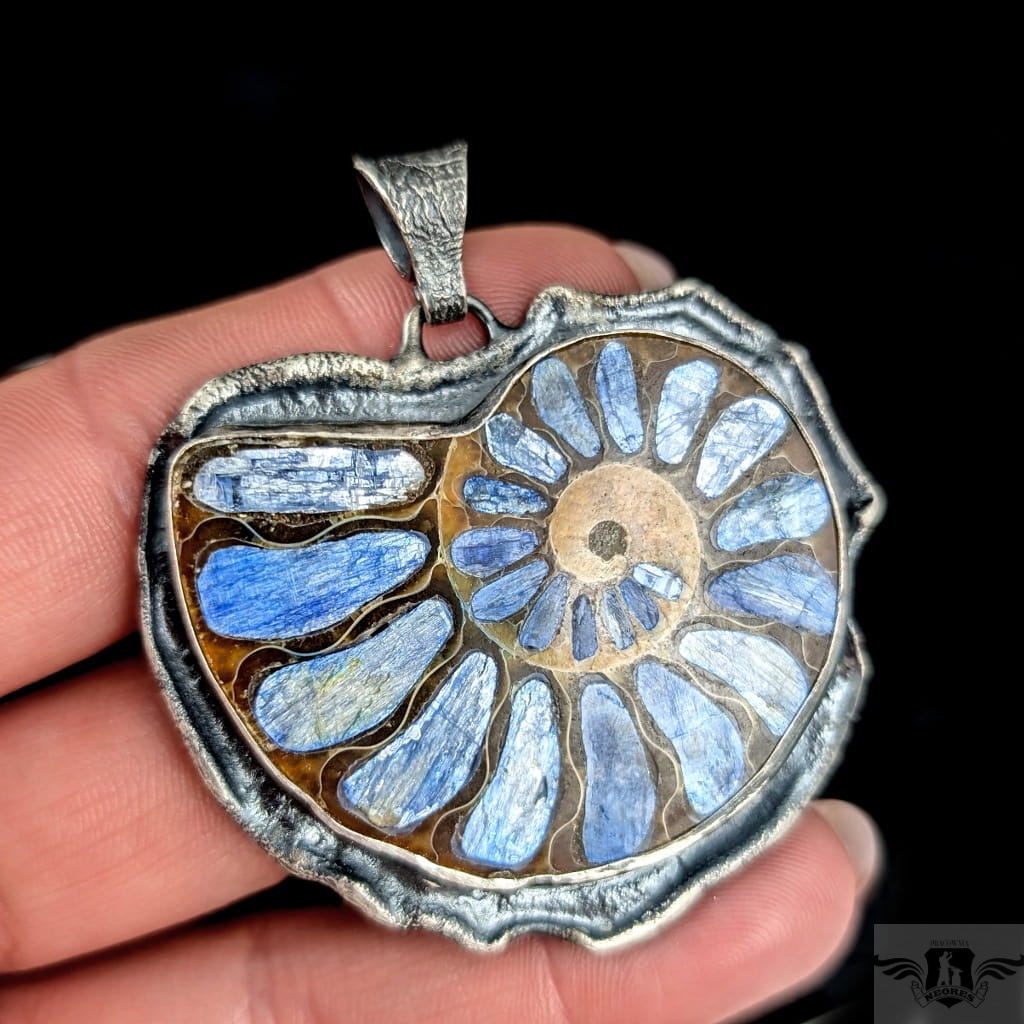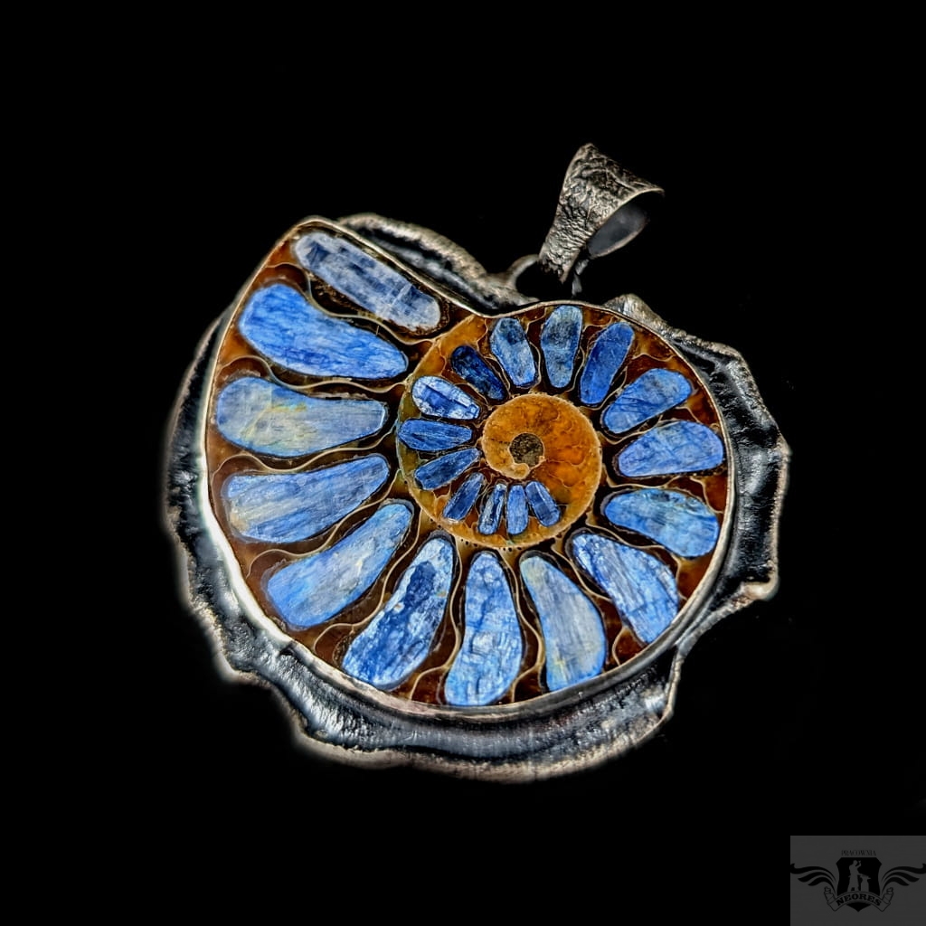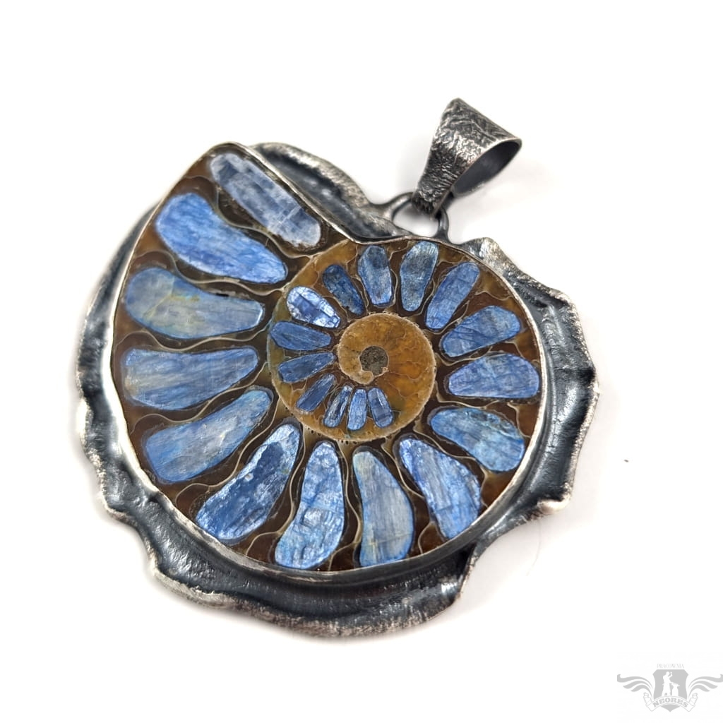 Zjawiskowy wisior z naturalnym amonitem, w którego komorach spoczywa inkrustowany kyanit .Fragmenty kamienia są niezwykle połyskliwe, pięknie się mienią. Amonit oprawiony został w srebro próby 925, oksydowane. Wymiary oprawy 52 x 46 mm, z krawatką 57 mm. Waga 22 g. Zostanie zapokowany w ozdobne pudełeczko.