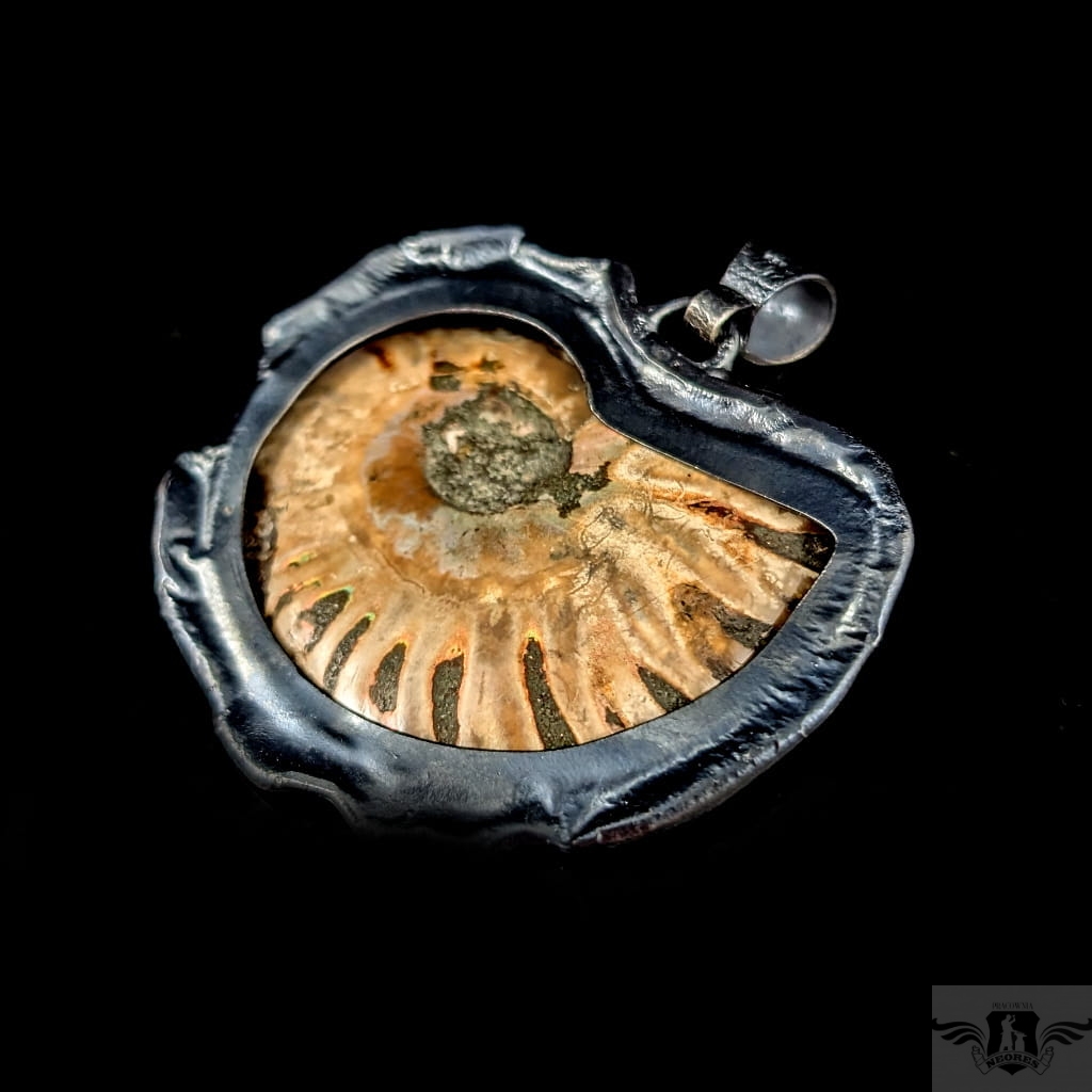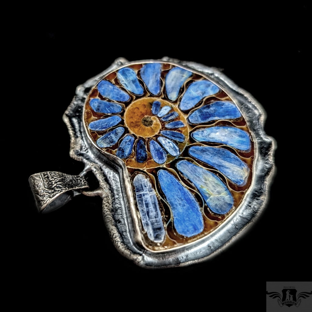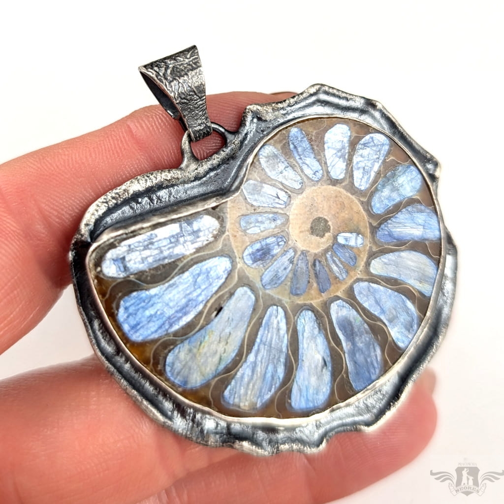 Zjawiskowy wisior z naturalnym amonitem, w którego komorach spoczywa inkrustowany kyanit .Fragmenty kamienia są niezwykle połyskliwe, pięknie się mienią. Amonit oprawiony został w srebro próby 925, oksydowane. Wymiary oprawy 52 x 46 mm, z krawatką 57 mm. Waga 22 g. Zostanie zapokowany w ozdobne pudełeczko.