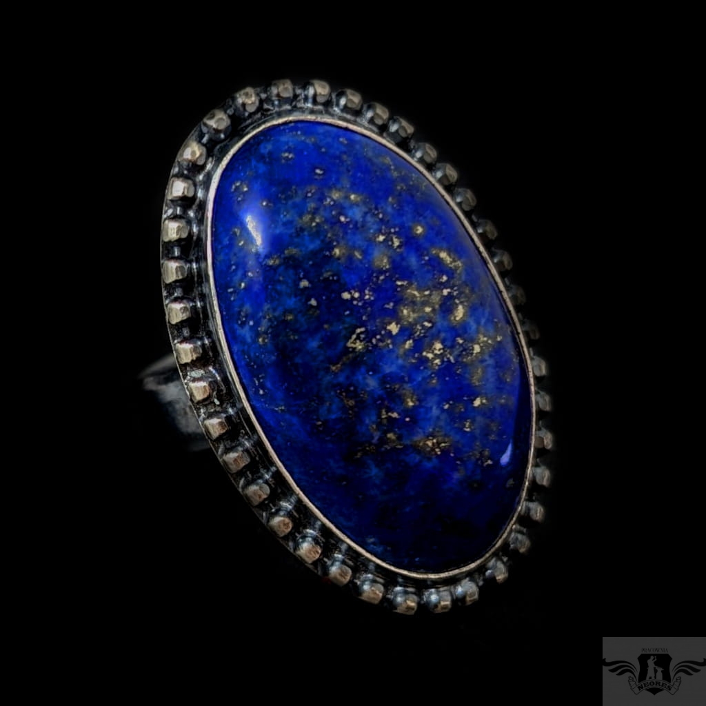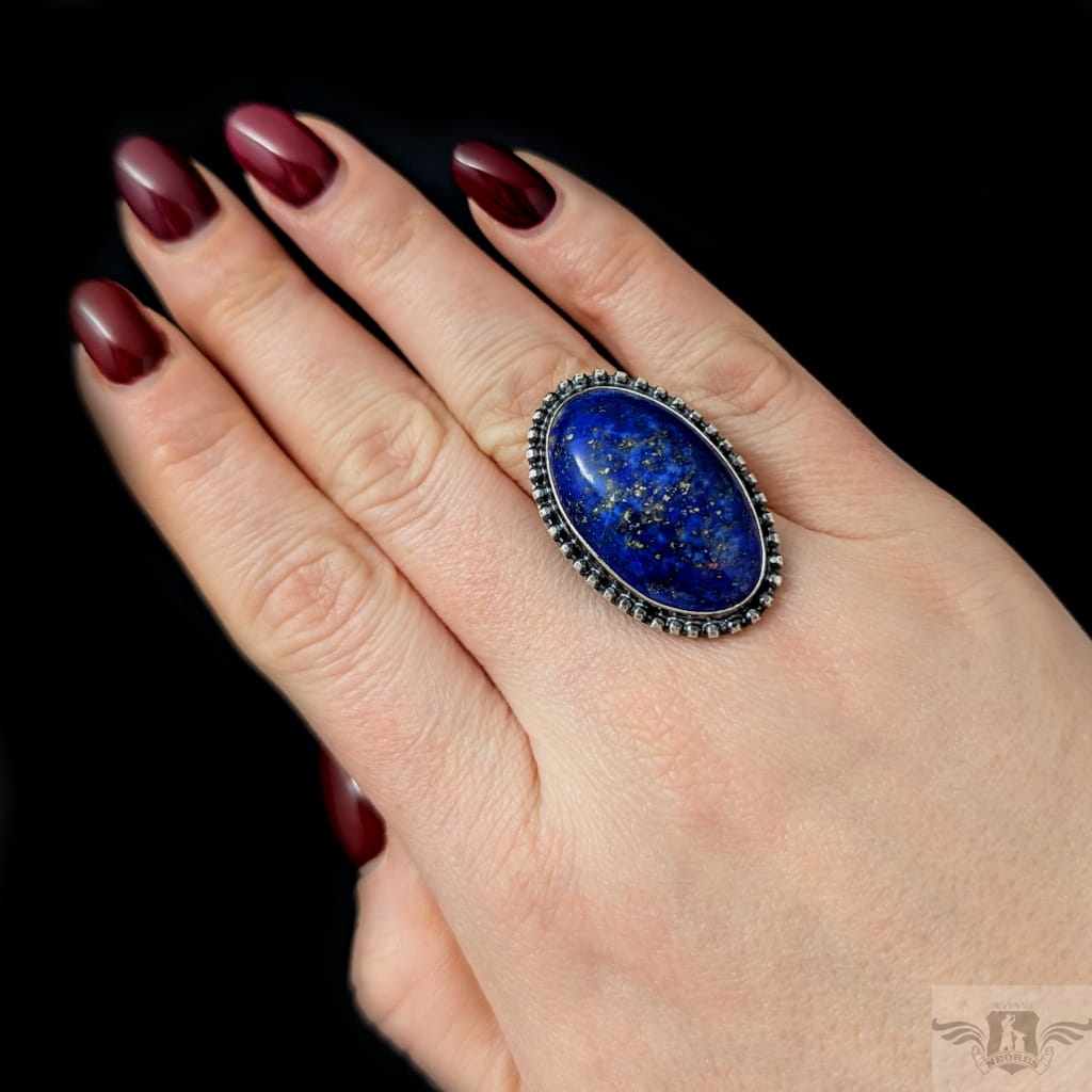 Okazały pierścień z lapisem lazuli oprawionym w oksydowane srebro próby 925. Kamień zawiera liczne inkluzje połyskującego pirytu. Wymiary całej oprawy 35 x 23 mm. Waga 14.8 grama. Obrączka o szerokości 5 mm, rozmiar jubilerski regulowany w szerokim zakresie, proszę napisać na jaki dopasować. Pierścień zostanie zapakowany w ozdobne pudełeczko.
