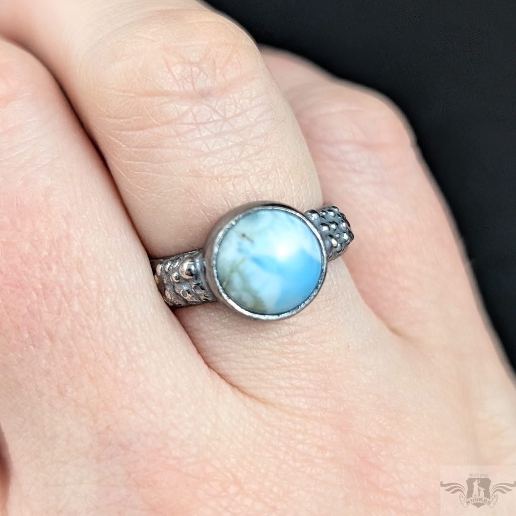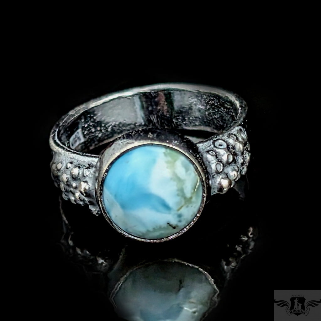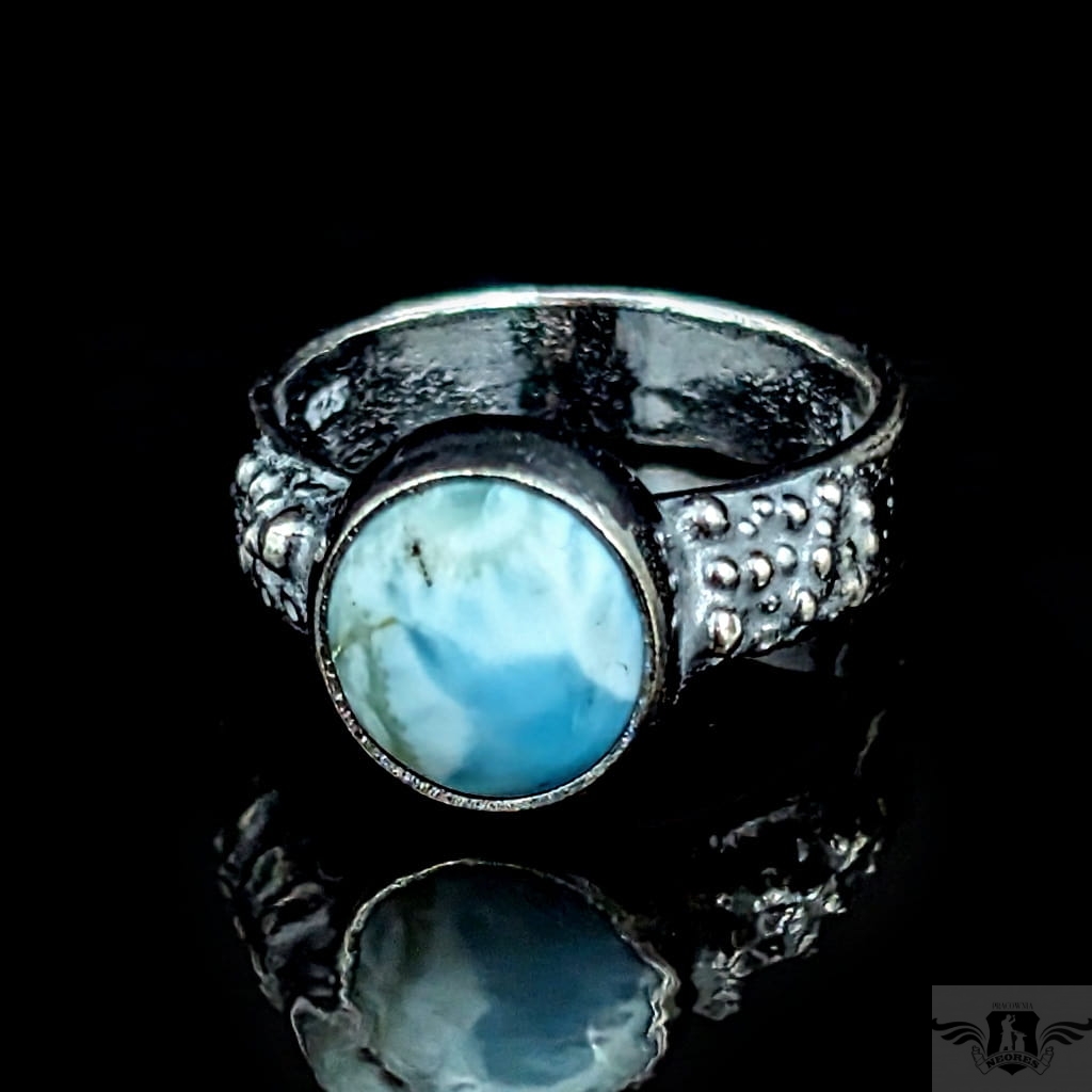 Pierścionek z oprawionym w oksydowane srebro pr.925 labradorytem. Średnica oprawy kamienia 11 mm, rozmiar 16 ,mogę powiększyć obrączkę do max 17. Waga 6 g. Pierścień zapakowany w ozdobne pudełeczko.