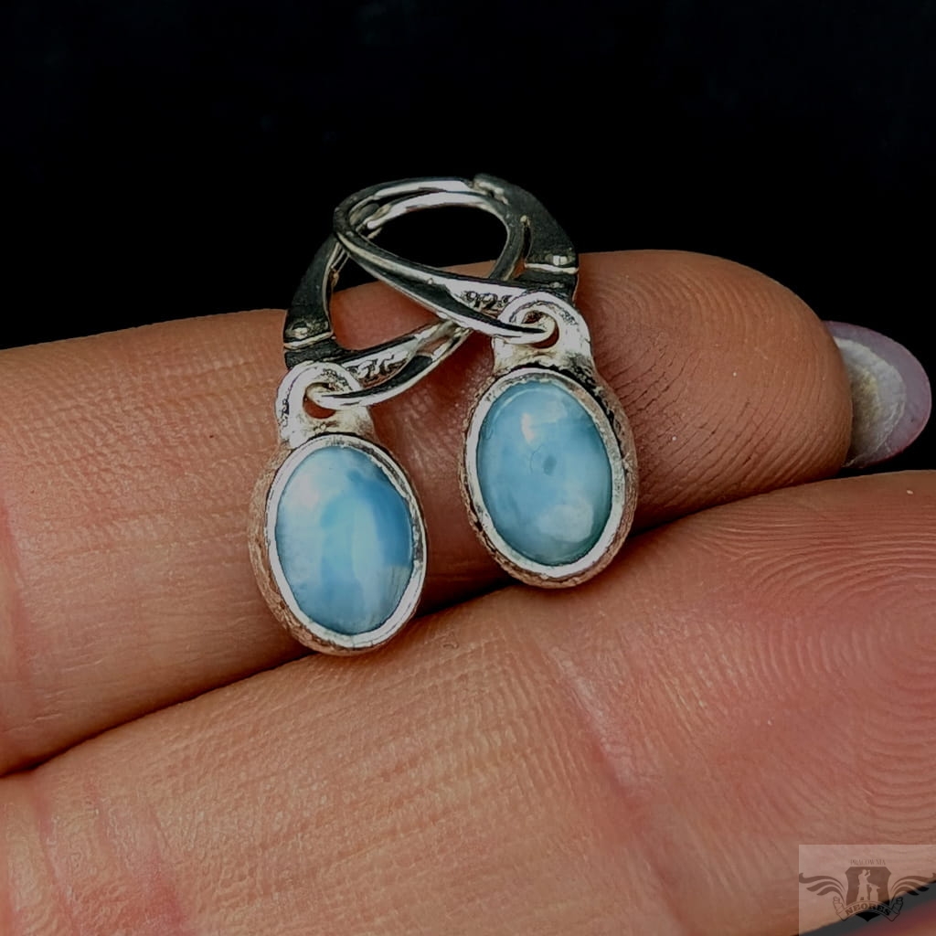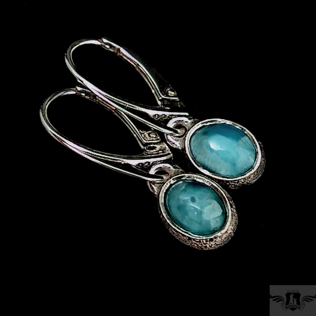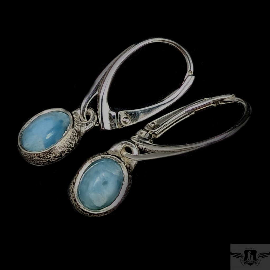 Kolczyki własnoręcznie wykonane ze srebra próby 925 oraz pięknych larimarów. Długość całkowita z biglami 27 mm, wymiary elementów z kamieniami 9 x 7 mm. Waga jednego kolczyka 1,6 grama Kolczyki zostaną zapakowane w ozdobne pudełeczko.