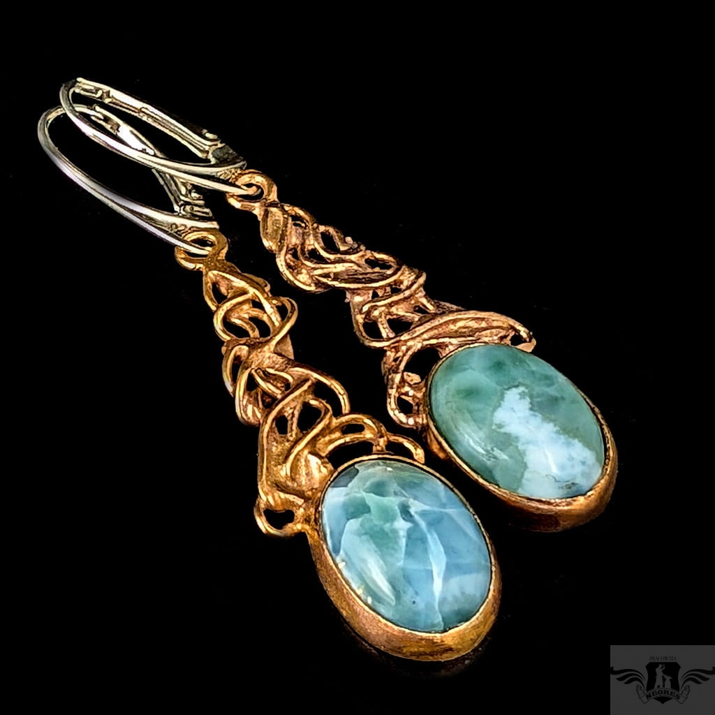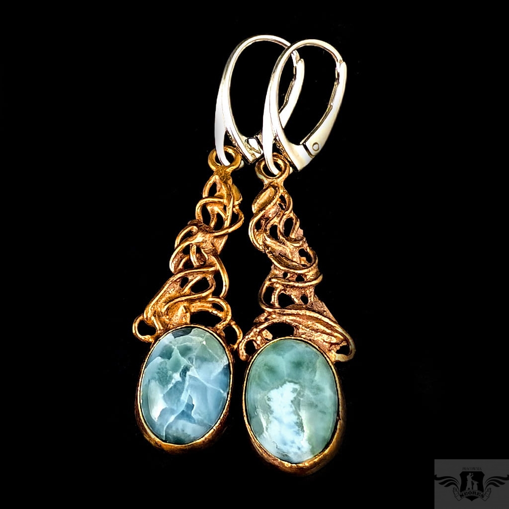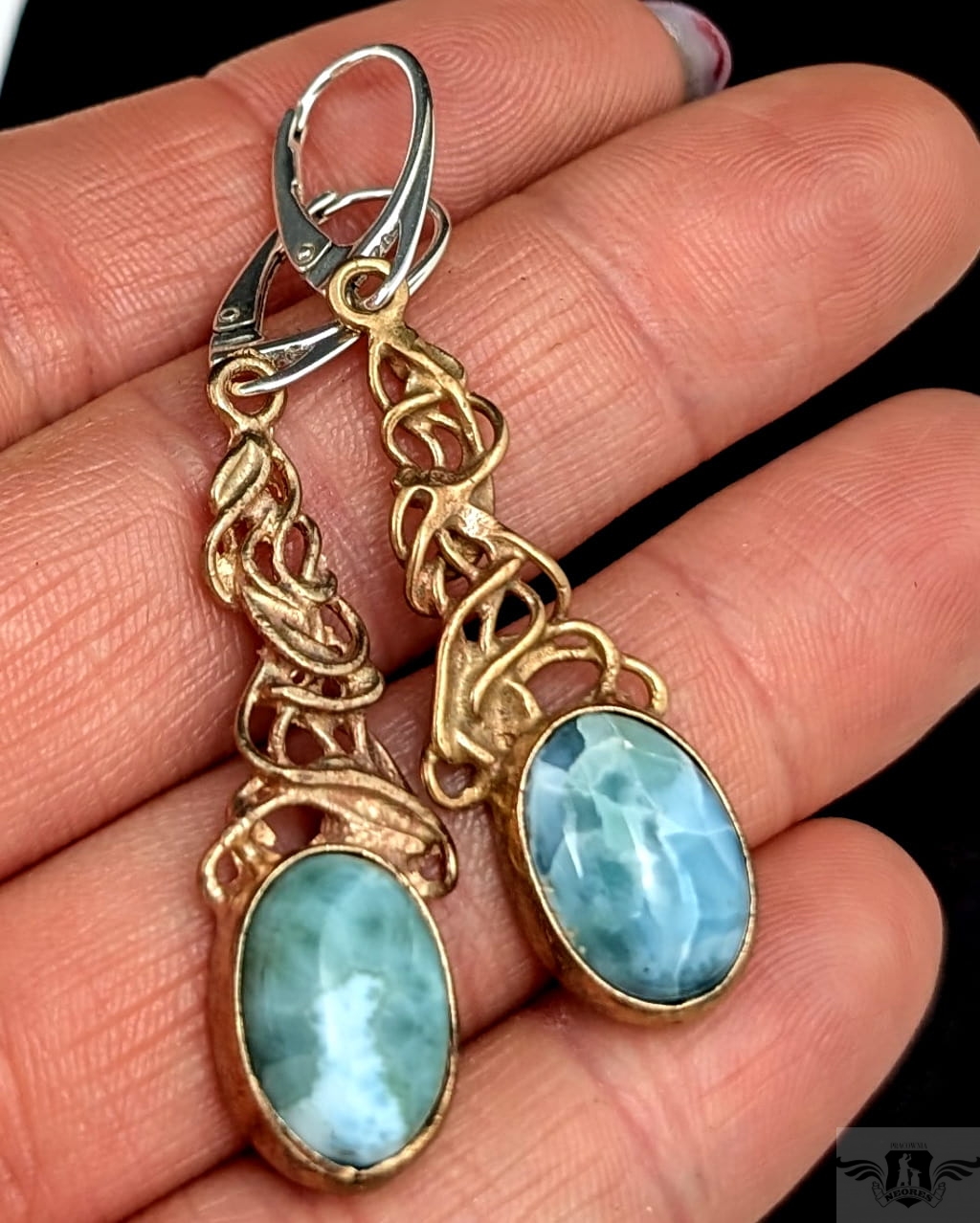 Kolczyki wykonane z brązu oraz wspaniałych larimarów. Bigle srebrne pr 925. Długość całkowita z biglami 57 mm, wymiary elementów z kamieniami 16 x 11 mm. Waga jednego kolczyka 3,8 g. Kolczyki zostaną zapakowane w ozdobne pudełeczko.
