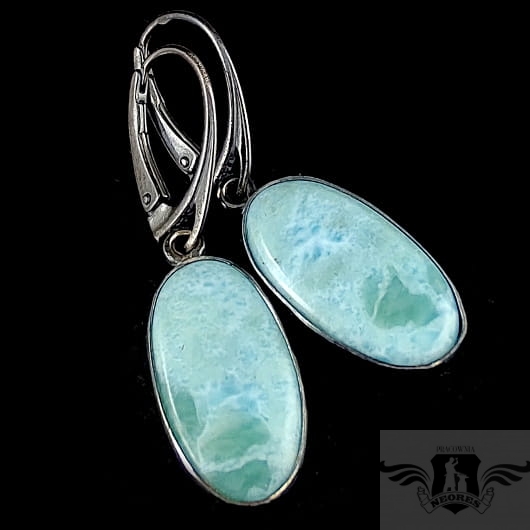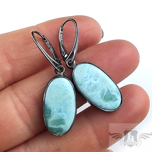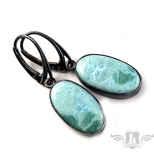 Kolczyki wykonane z oksydowanego srebra próby 925 oraz pięknych larimarów. Długość całkowita z biglami 40 mm, wymiary elementów z kamieniami 20 x 10 mm. Waga jednego kolczyka 3,7 grama Kolczyki zostaną zapakowane w ozdobne pudełeczko.