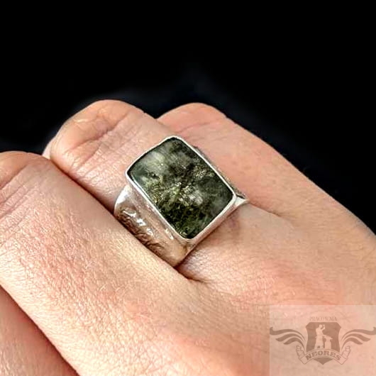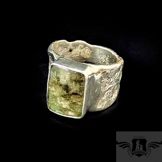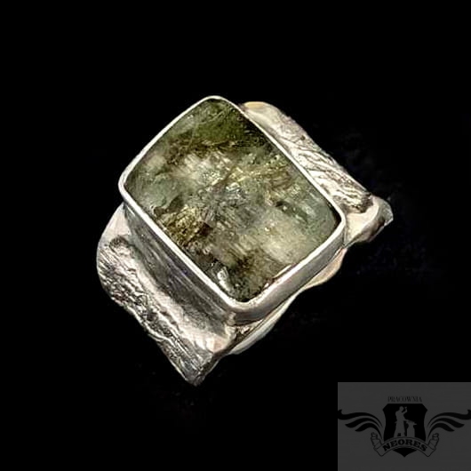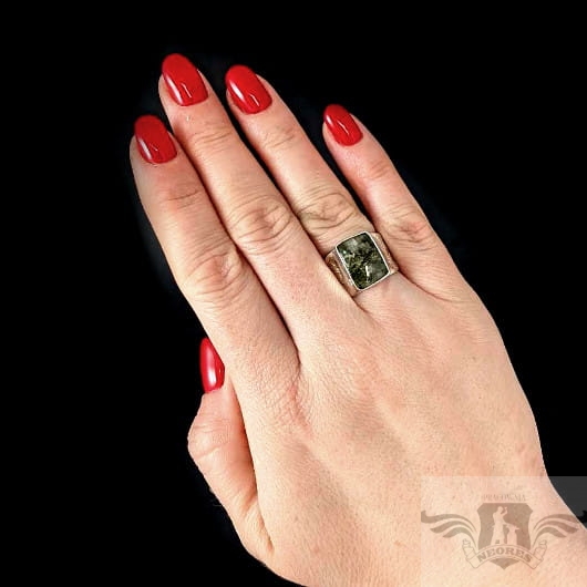 Oryginalny pierścionek w sygnetowej formie wykonany ze srebra próby 925 oraz naturalnego turmalinu. Oprawa ma wymiary 14 x 11 mm. Obrączka max. 13 mm. Pierścień będzie pasował na rozmiar jubilerski 15, możliwe powiększenie do MAX 16. Waga 8,8 gramów. Pierścionek zostanie zapakowany w ozdobne pudełeczko