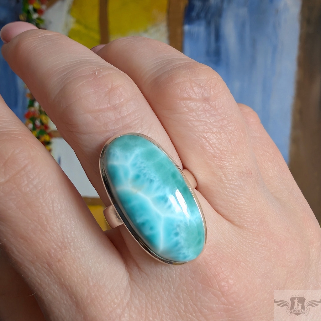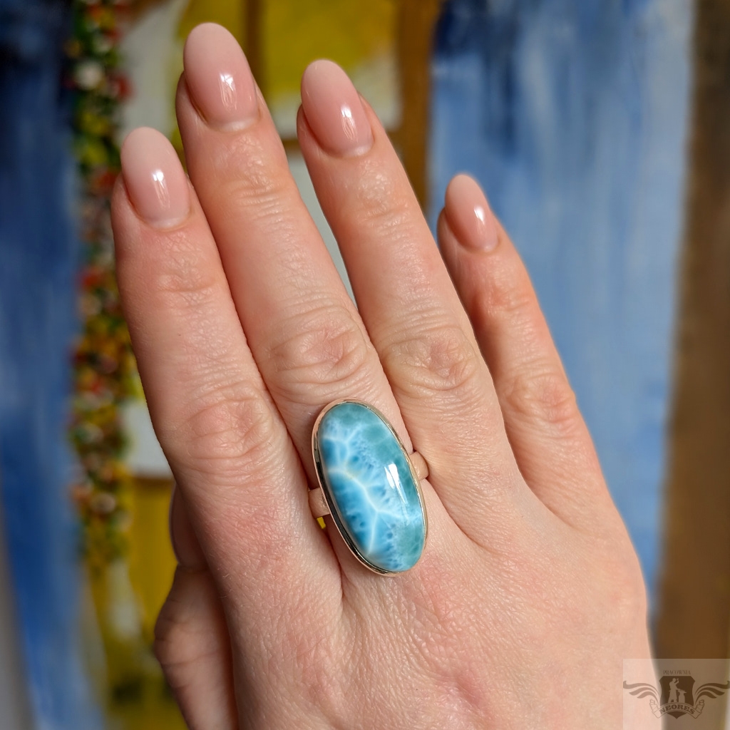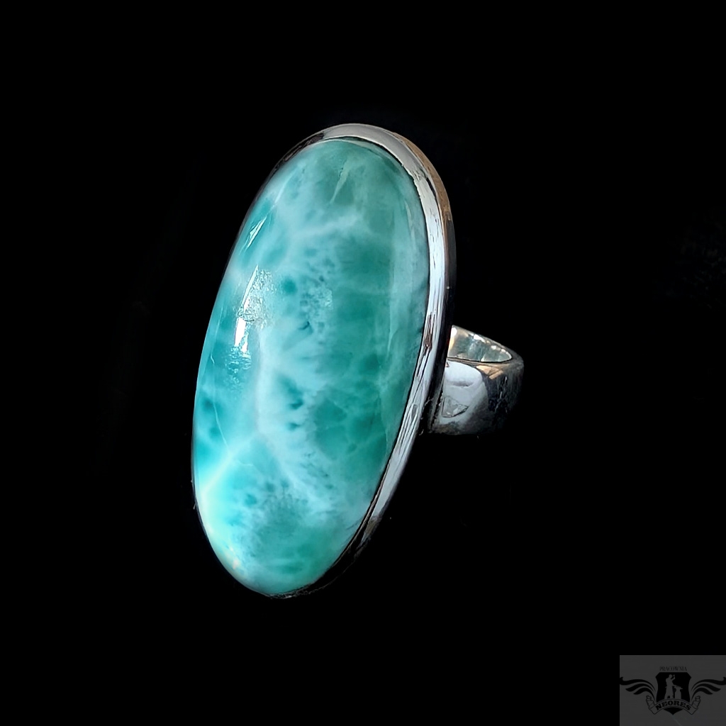 Pierścień wykonany ze srebra próby 925. Rozmiar jubilerski regulowany w wąskim zakresie 16-18 proszę napisać na jaki dopasować. Ozdobą pierścionka jest piekny larimar o pięknej barwie i naturalnym malunku na tafli. Wymiary oprawy kamienia 28 x 15 mm, szerokość obrączki 5 mm. Waga 10 g. Pierścień zostanie zapakowany w ozdobne pudełeczko.