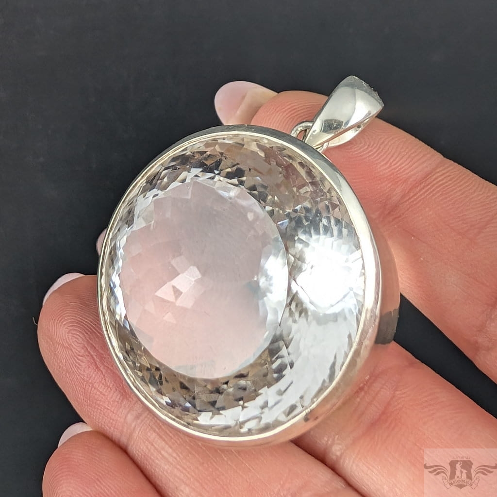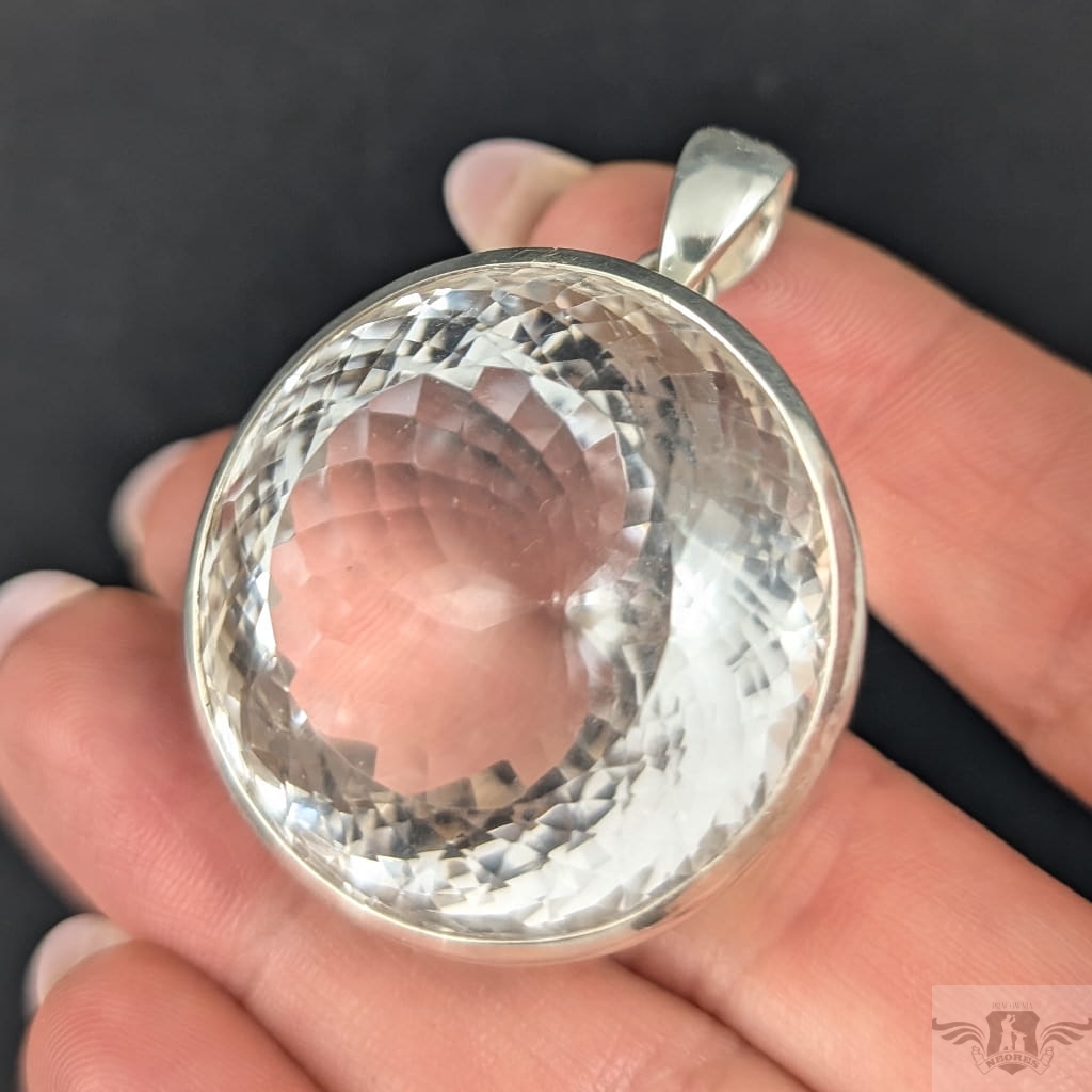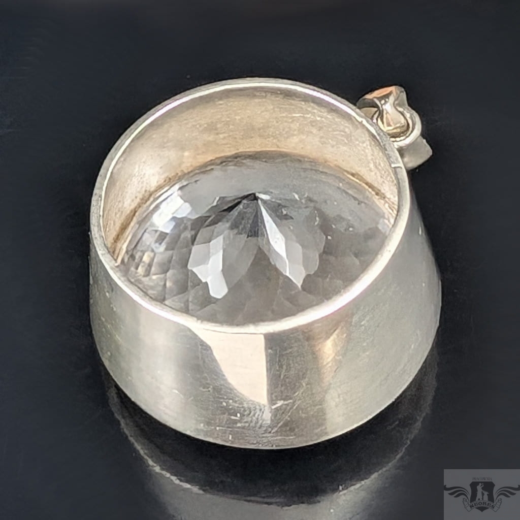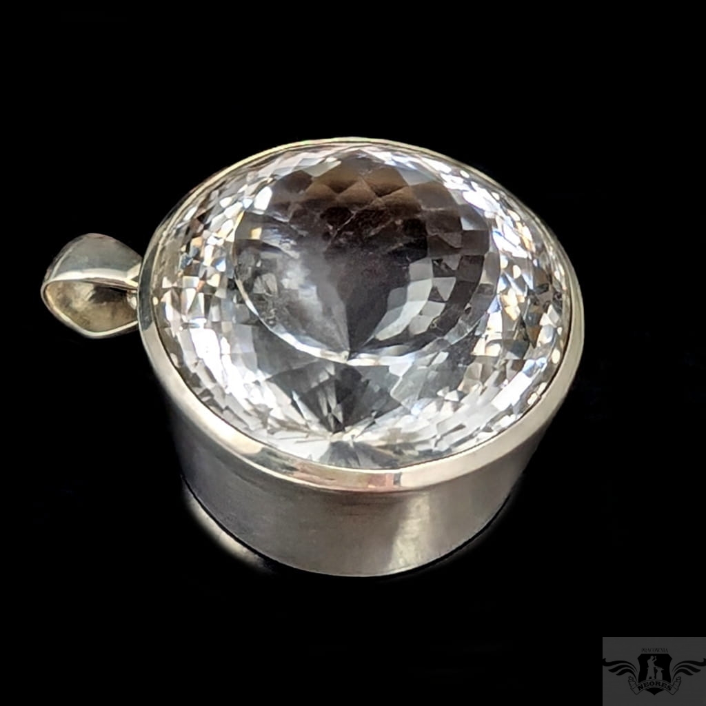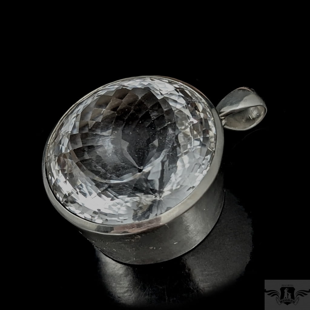 Wisior z kryształem kwarcu zwanym górskim o nieskazitelnej czystości. Niezwykłe, ultraczyste lustro minerału spotęgowane precyzyjnym szlifem. Przepiękny, duzy okaz. Kryształ oprawiony w srebro pr.925. Średnica całego wisiora 33mm, grubość 22 mm. Długość z krawatką 48 mm. Waga 48 gramów. Otwarty tył wisiora ukazuje niezwykłe piękno kamienia w pełnej krasie. Wykonany przez dostawcę kamieni. Wisior zapakowany w ozdobne pudełeczko.