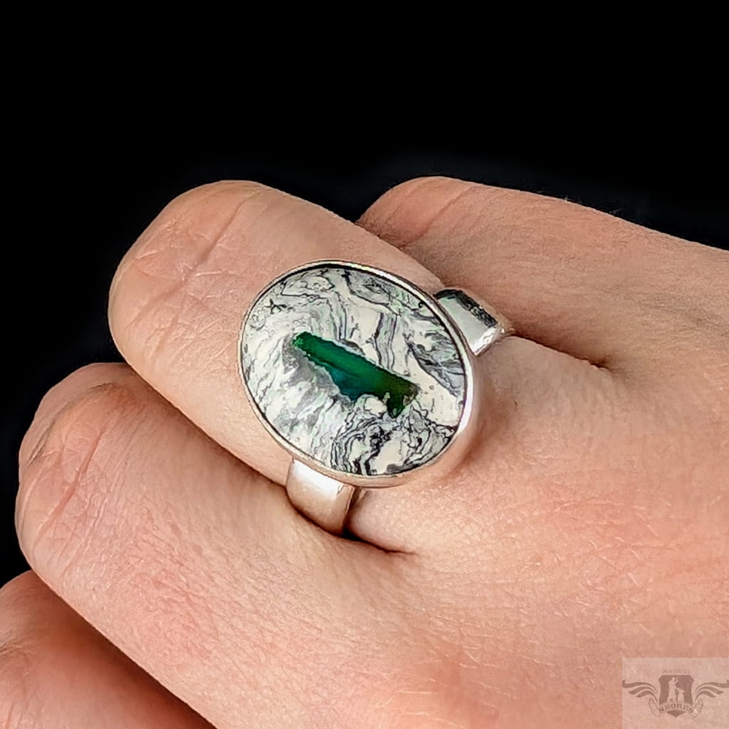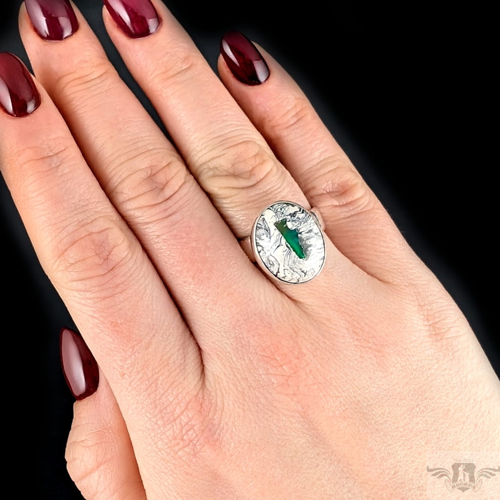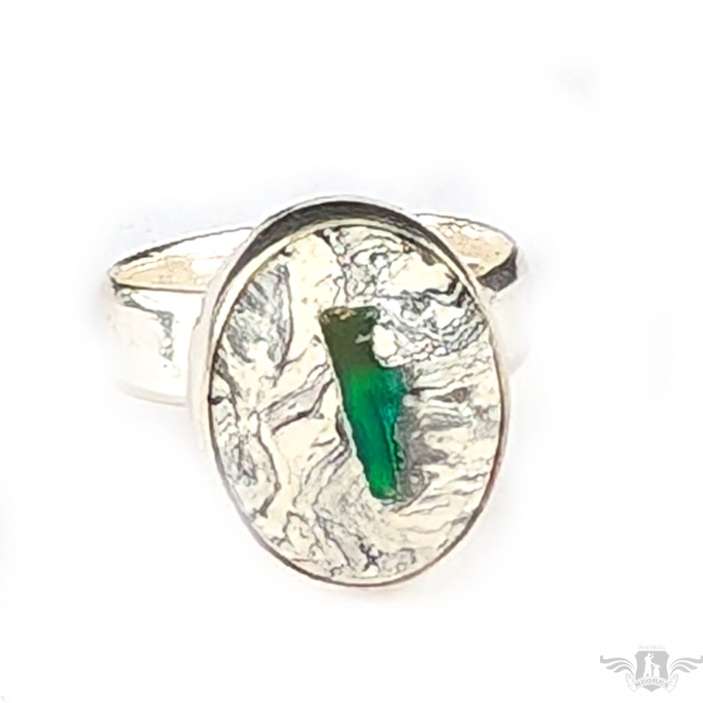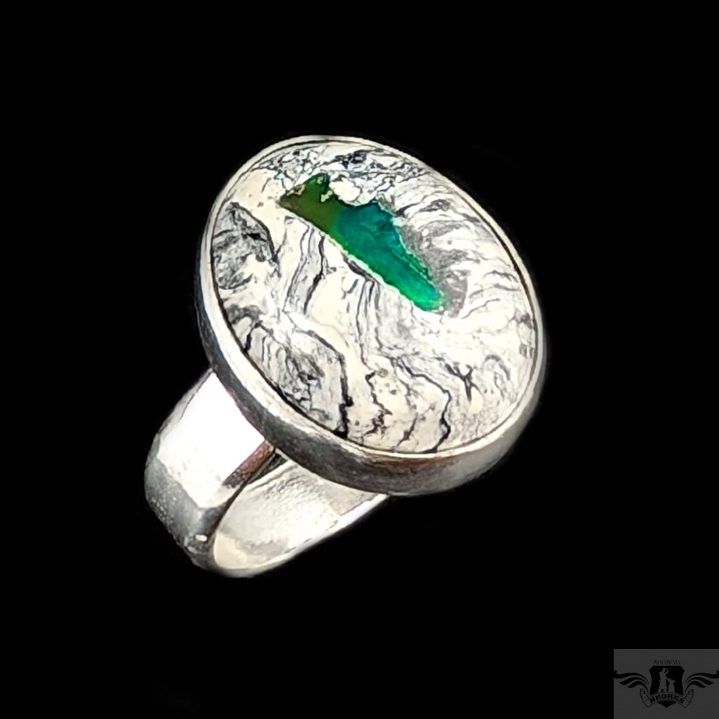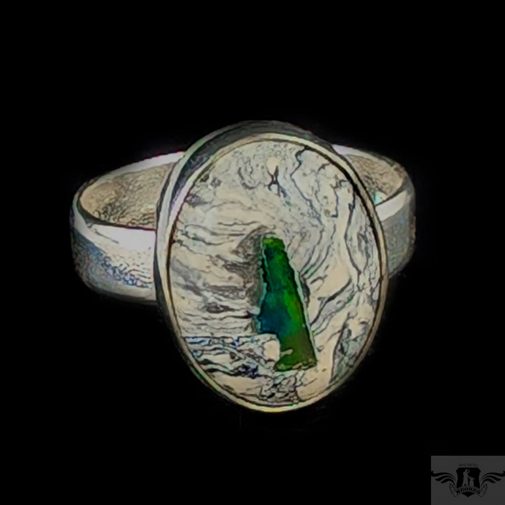 Pierścionek oprawionym w srebro pr. 925 naturalnym opalem z Meksyku, tzw Cantera. Zdjęcia nie oddają piękna kamienia, jest zjawiskowo piękny, wewnątrz surowej, biało-czarnej skały macierzystej iskrzy opalizujący opal właściwy w kolorach zieleni i niebieskiego. Rozmiar jubilerski jest regulowany w szerokim zakresie (10-25), obrączka szeroka na 5 mm. Proszę napisać, na jaki rozmiar dopasować. Waga pierścienia 7,5 g. Wymiary oprawy 18 x 15 mm.