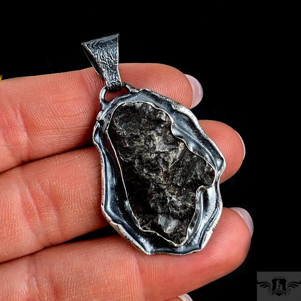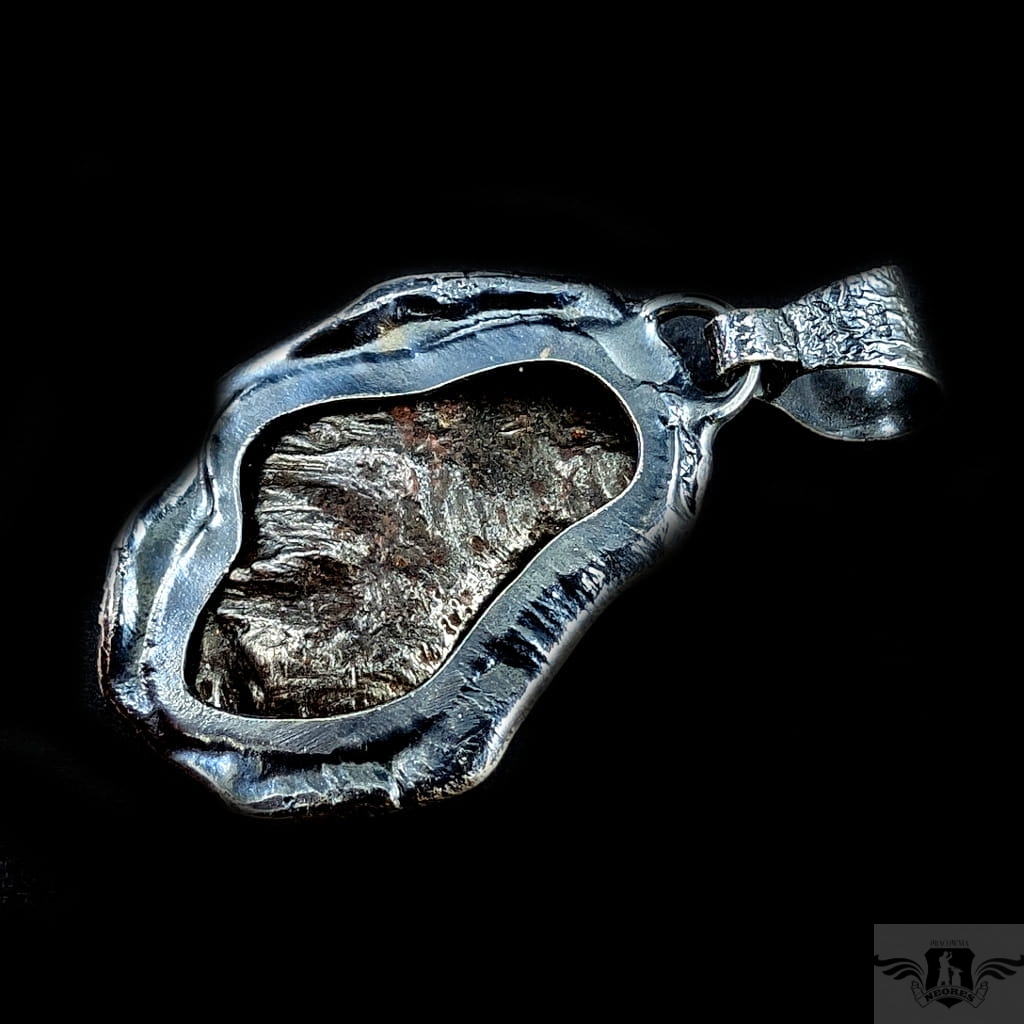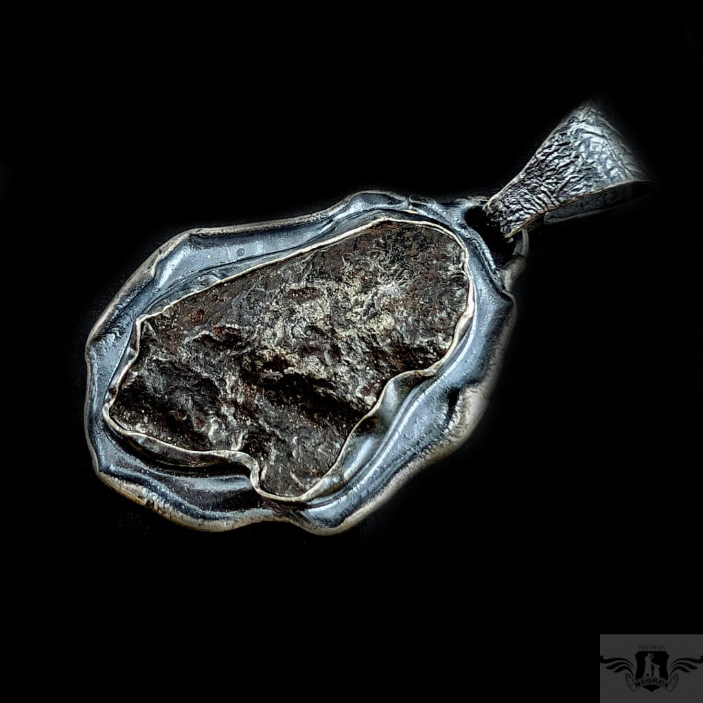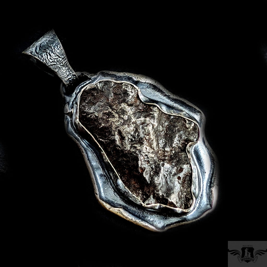 Wyjątkowy wisior z okazałym, meteorytem żelaznym Campo del Cielo, który znaleziono w 1576 roku w Argentynie. Meteorytom przypisywane są magiczne właściwości talizmanów. Z pewnością jest to niebanalny materiał jubilerski w ciekawy sposób zakomponowany w srebro.Uniwersalny,dla niego lub dla niej. Oprawa srebra pr 925 ma 37 x 27 mm, z krawatką długosć 48 mm, Waga wisiora 12 g. Wisior zostanie zapakowany w ozdobne pudełeczko.