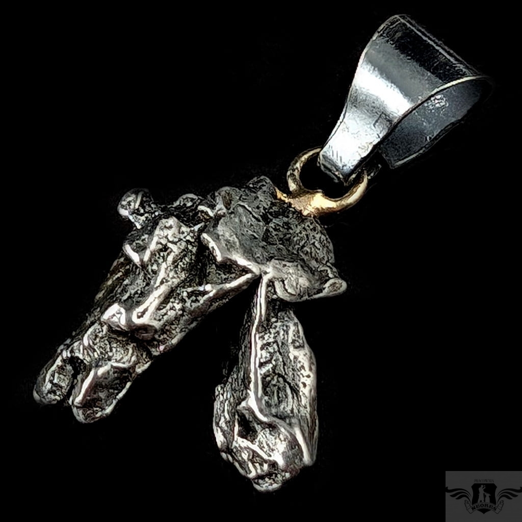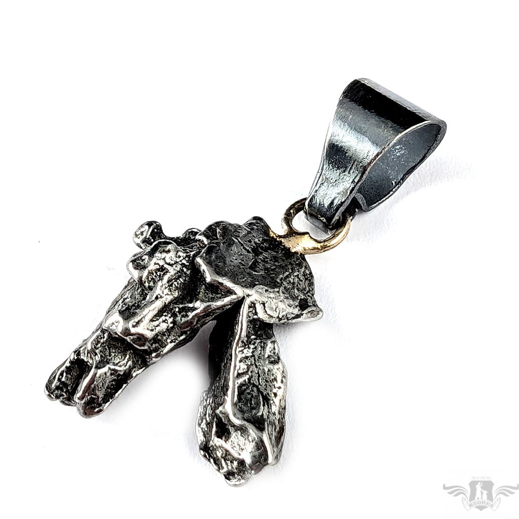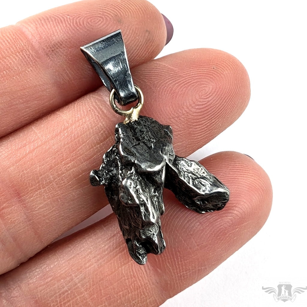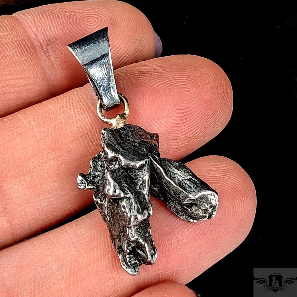 Wyjątkowy wisior z okazałym, meteorytem żelaznym Campo del Cielo, który znaleziono w 1576 roku w Argentynie. Meteorytom przypisywane są magiczne właściwości talizmanów. Z pewnością jest to niebanalny materiał jubilerski. Uniwersalny,dla niego lub dla niej. Do meteorytu dołączona jest jego metryka. Wymiaty 19 x 17 mm, z krawatką z oksydowanego srebra długosć 33 mm, Waga wisiora 6 g. Wisior zostanie zapakowany w ozdobne pudełeczko.