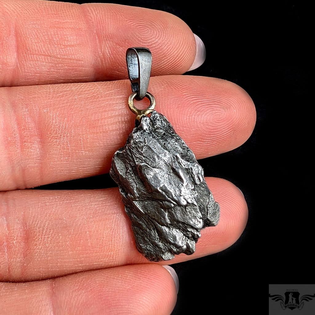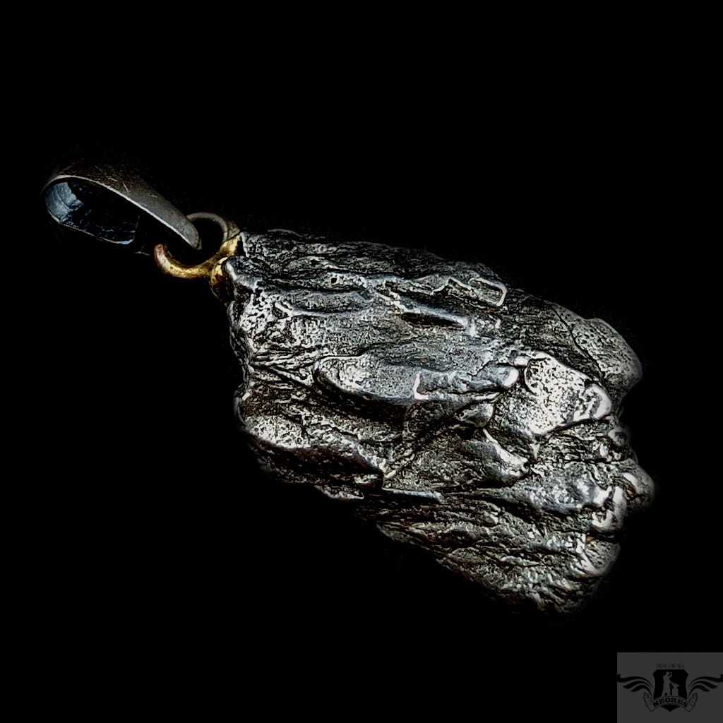 Wyjątkowy wisior z okazałym meteorytem żelaznym Campo del Cielo, który znaleziono w 1576 roku w Argentynie. Meteorytom przypisywane są magiczne właściwości talizmanów. Z pewnością jest to niebanalny materiał jubilerski w ciekawy sposób zakomponowany w srebro.Uniwersalny,dla niego lub dla niej. Wymiaty 25 x 15 mm, z krawatką z oksydowanego srebra długosć 37mm, Waga wisiora 7,5 g. Wisior zostanie zapakowany w ozdobne pudełeczko.