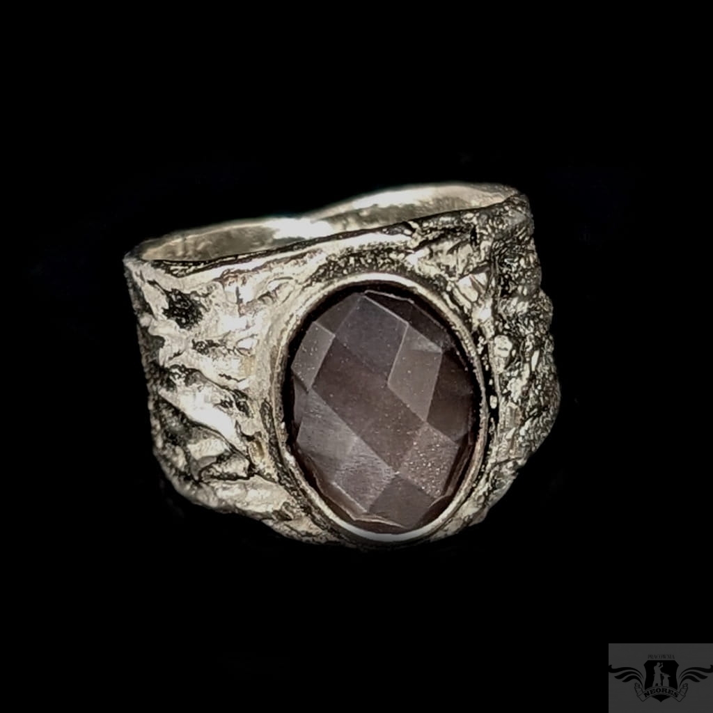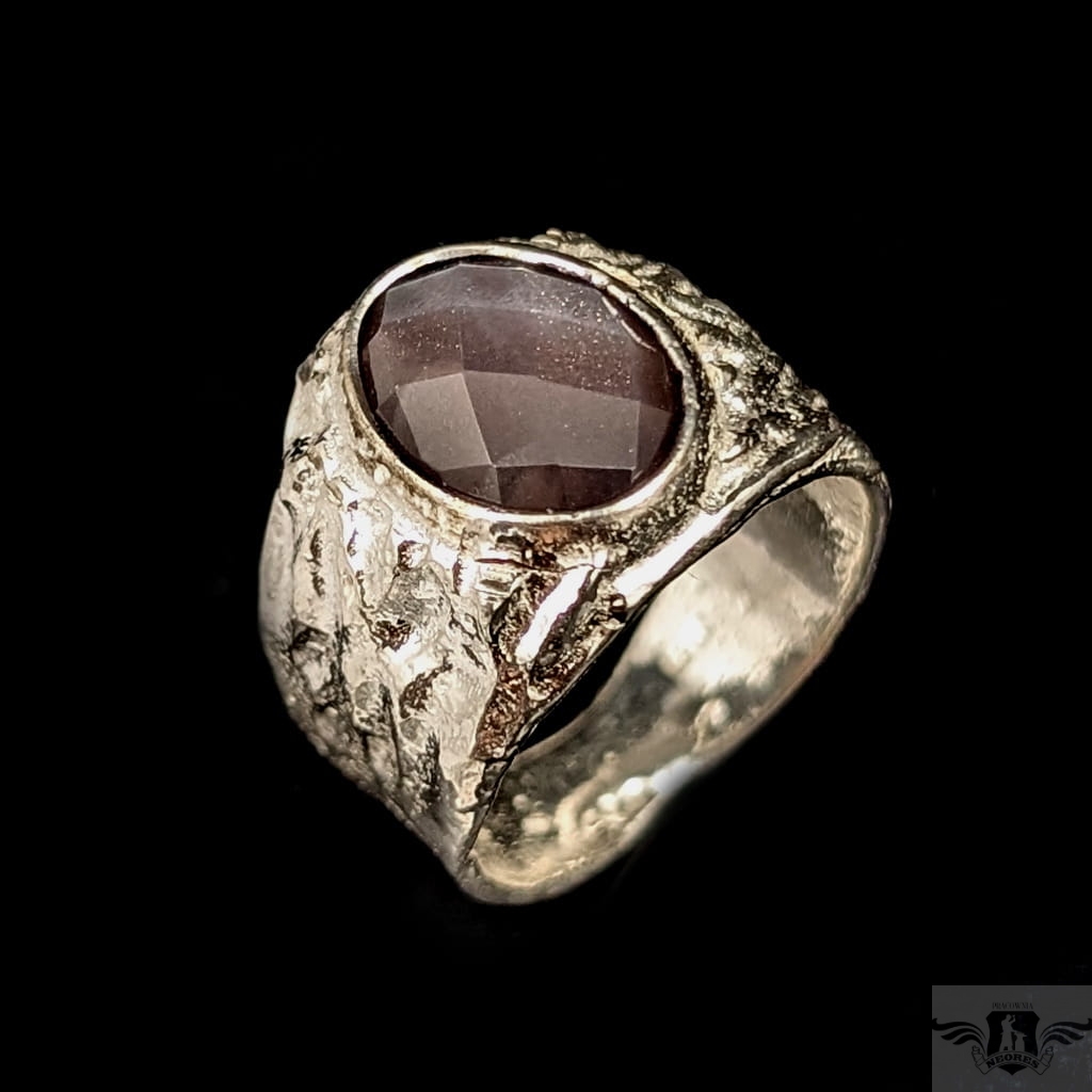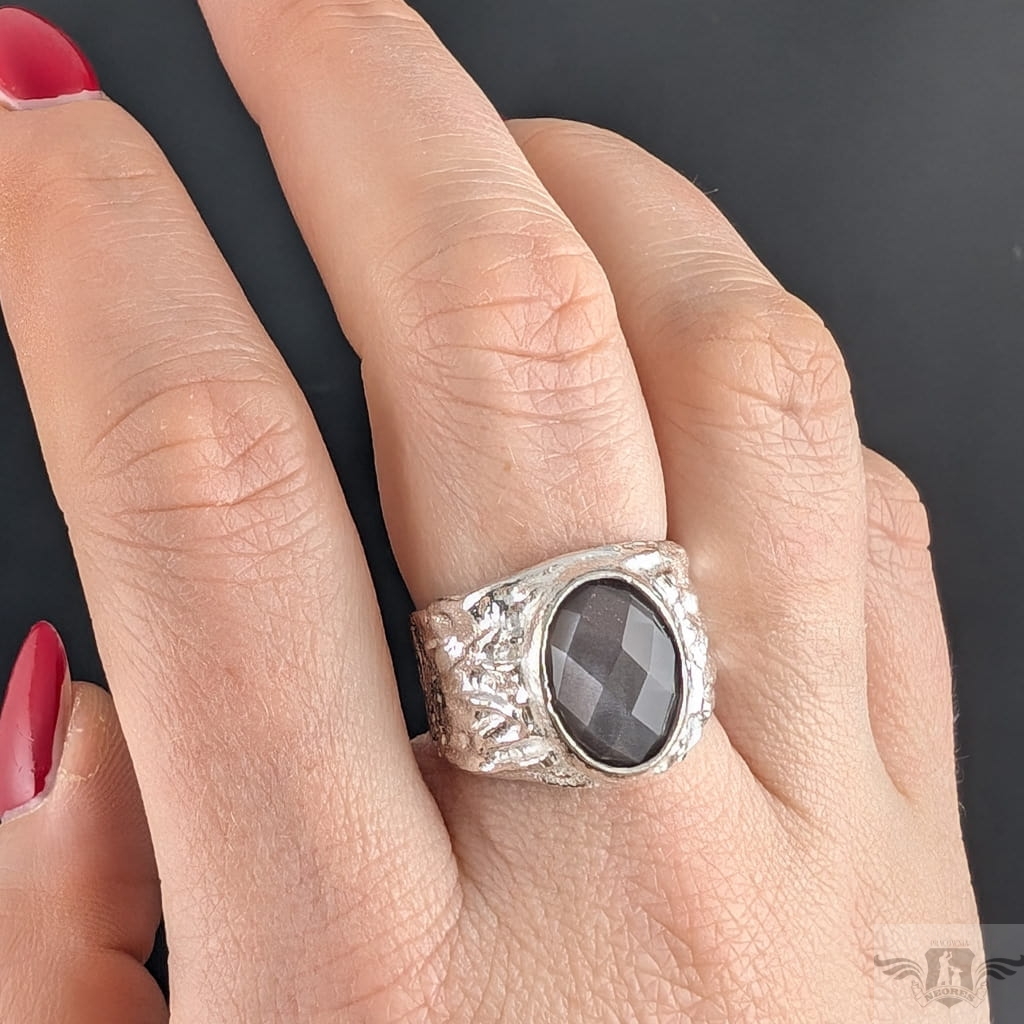 Pierścień z oprawionym w srebrną, szeroką obrączkę pięknym, fasetowanym kamieniem księżycowym w rzadkim odcieniu. Oprawa wykonana ze srebra pr.925. Wymiary oprawy kamienia 13 x 12 mm, w najszerszym miejscu obrączka ma 16 mm. Waga 13 g. Rozmiar jubilerski 19, mogę powiększyć na max. 20. Pierścionek wysyłamy w ozdobnym pudełeczku.