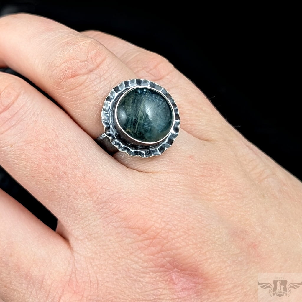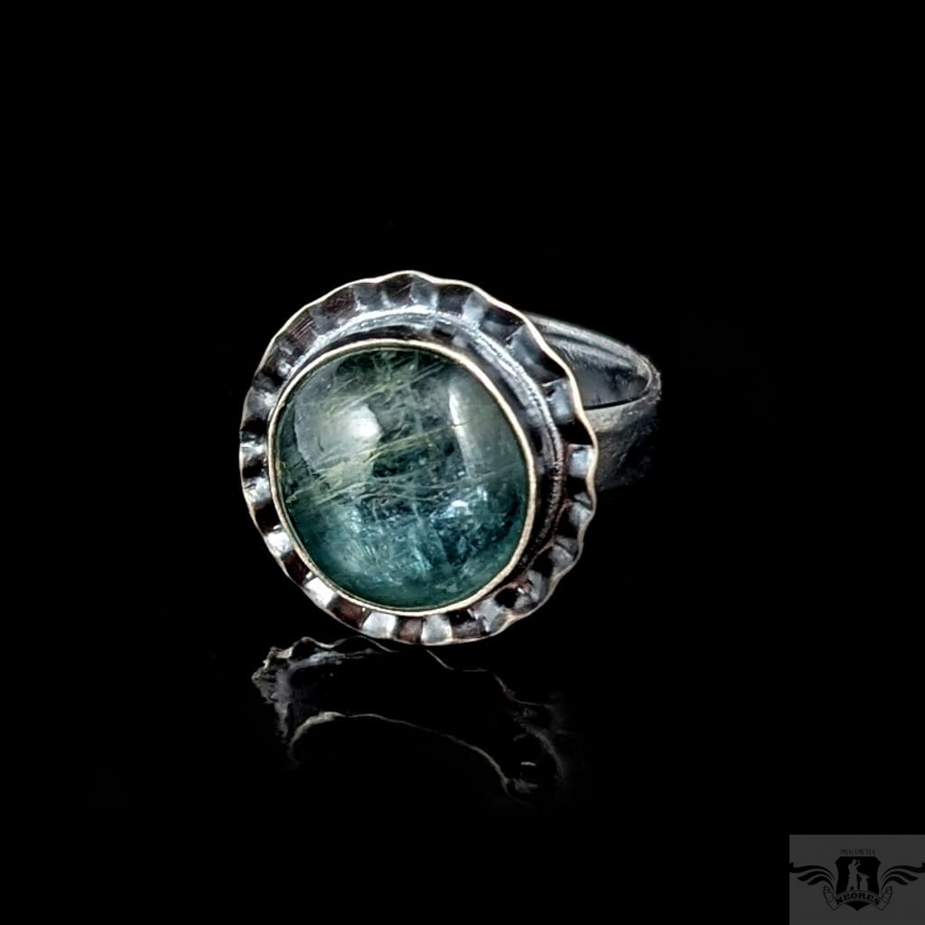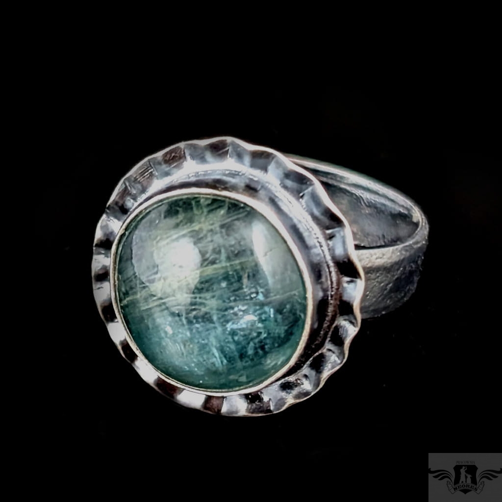 Pierścionek wykonany z oksydowanego srebra próby 925 oraz pięknego kyanitu o rzadkiej morskiej barwie. Wymiary oprawy kamienia 18 mm. Rozmiar jubilerski regulowany w szerkim zakresie, proszę napisać, na jaki dopasowac. Waga 7,6 grama. Pierścień zostanie zapakowany w ozdobne pudełeczko.