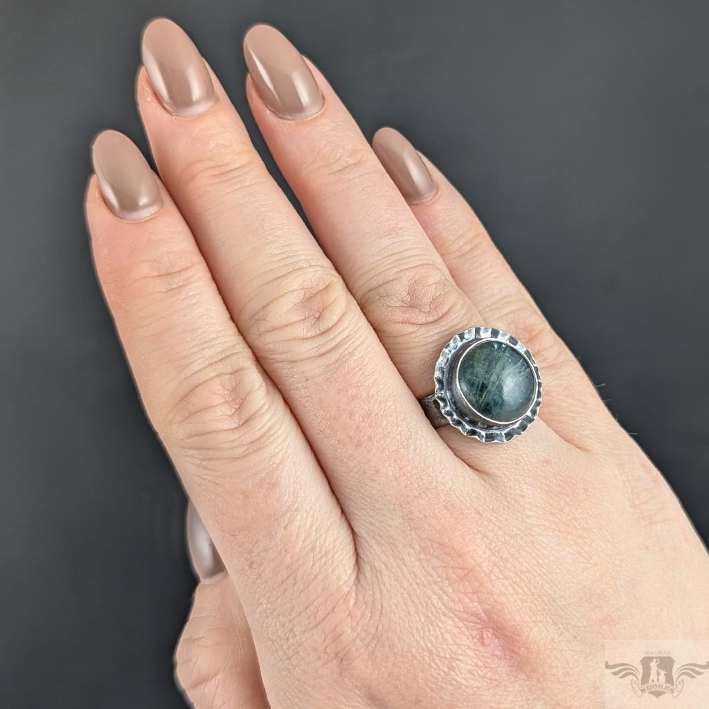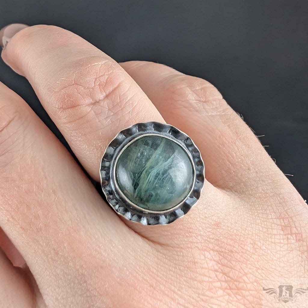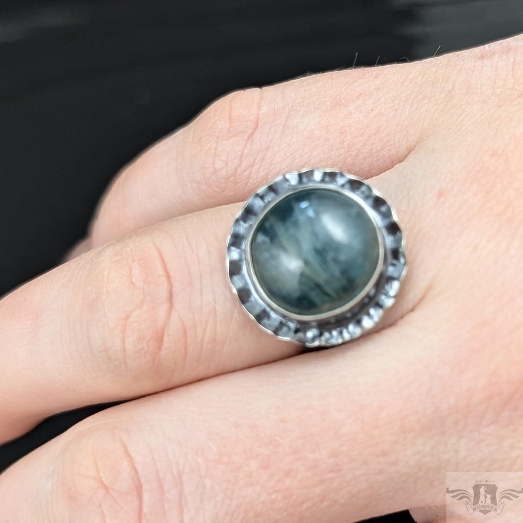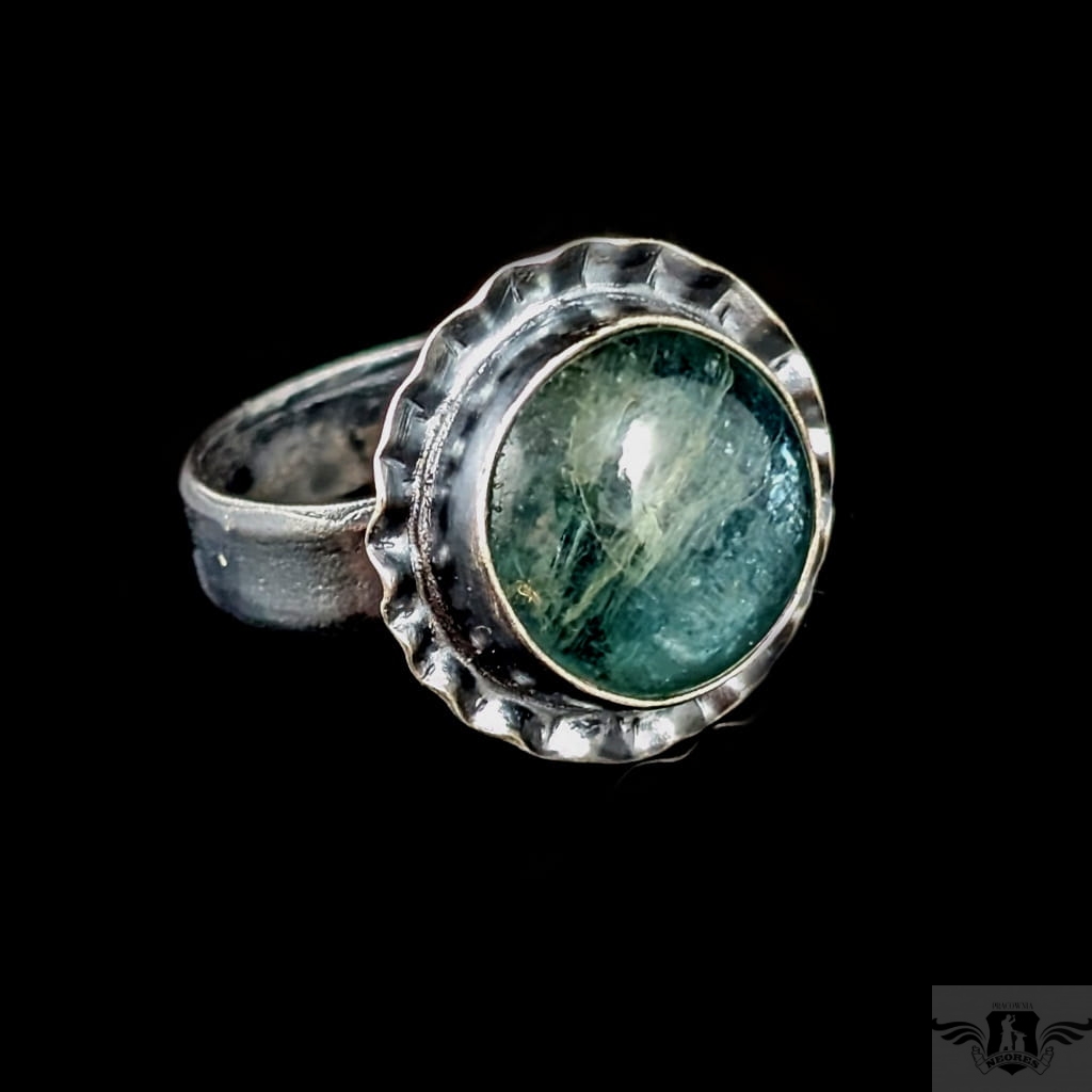 Pierścionek wykonany z oksydowanego srebra próby 925 oraz pięknego kyanitu o rzadkiej morskiej barwie. Wymiary oprawy kamienia 18 mm. Rozmiar jubilerski regulowany w szerkim zakresie, proszę napisać, na jaki dopasowac. Waga 7,6 grama. Pierścień zostanie zapakowany w ozdobne pudełeczko.