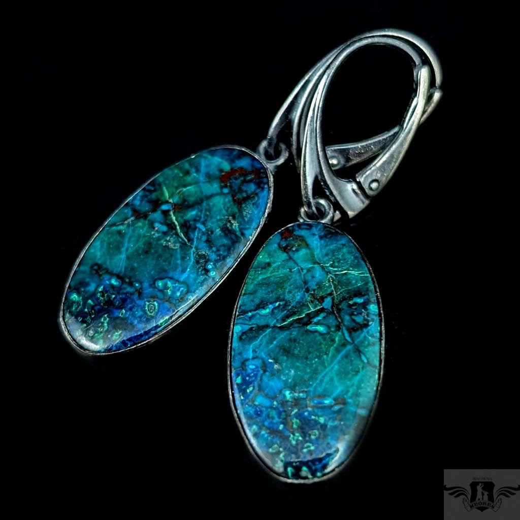 Piękne azuryty oprawione w oksydowane srebro próby 925. Wymiary całej oprawy 23 x 13 mm. Długość z biglami 42 mm. Waga jednego 4,8 g. Zostaną zapakowane w ozdobne pudełeczko.