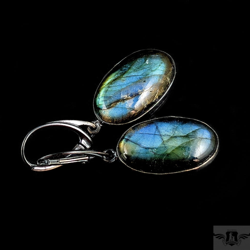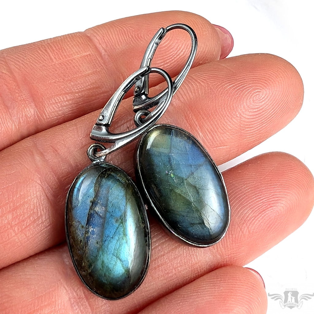 Kolczyki wykonane z oksydowanego srebra próby 925 oraz pięknych labradorytów. Długość całkowita z biglami 40 mm, wymiary elementów z kamieniami 20 x 12 mm. Waga jednego kolczyka 4,75 grama. Kolczyki zostaną zapakowane w ozdobne pudełeczko.