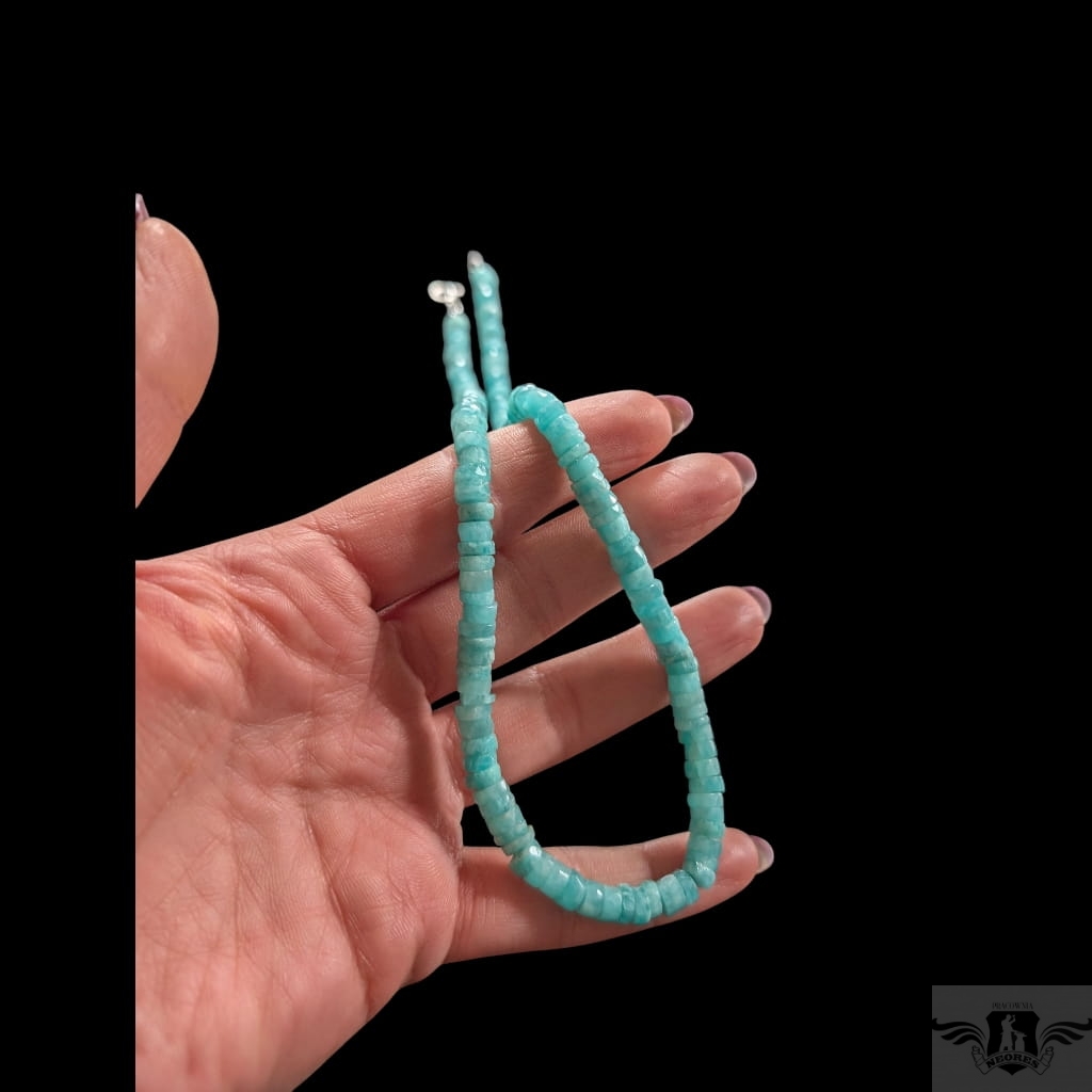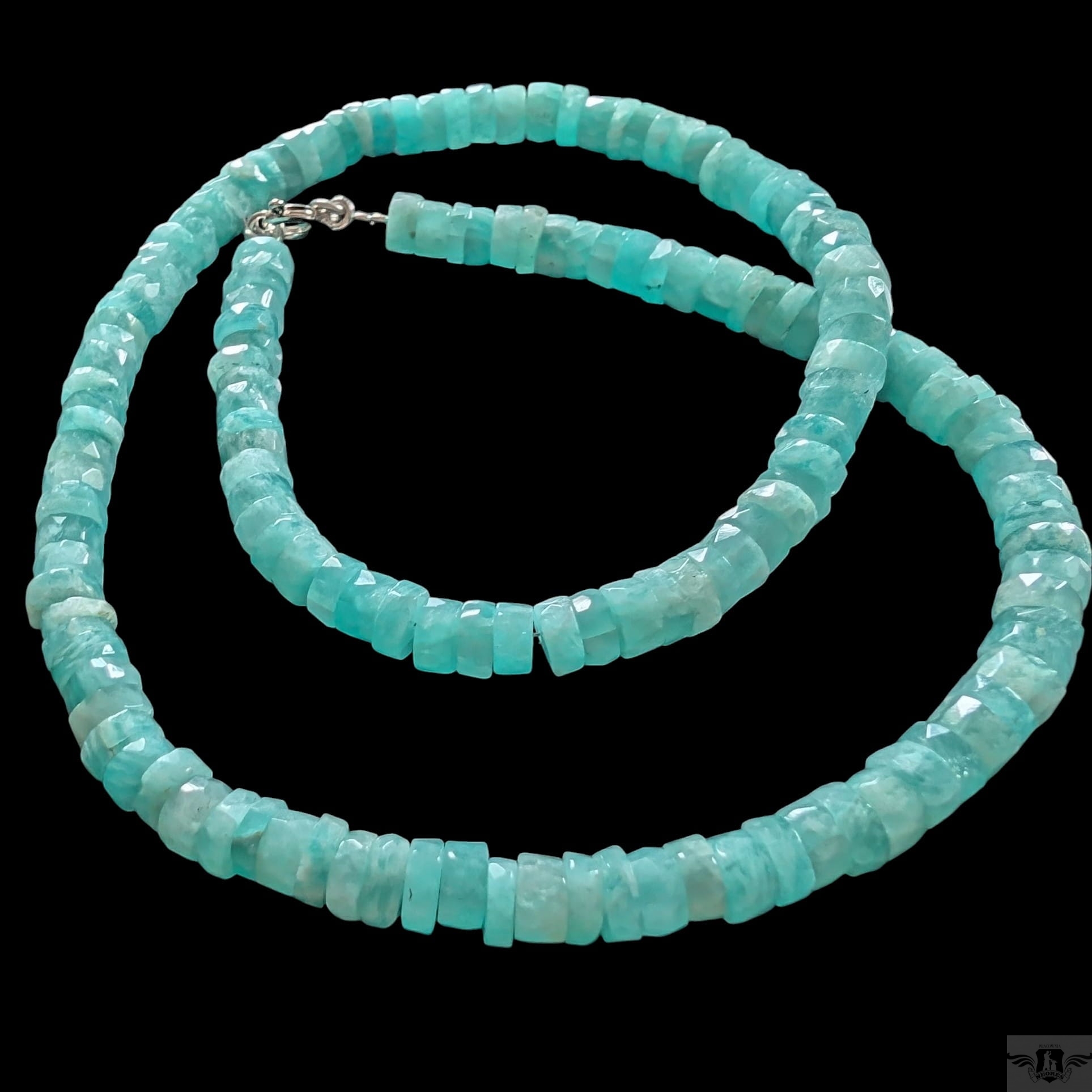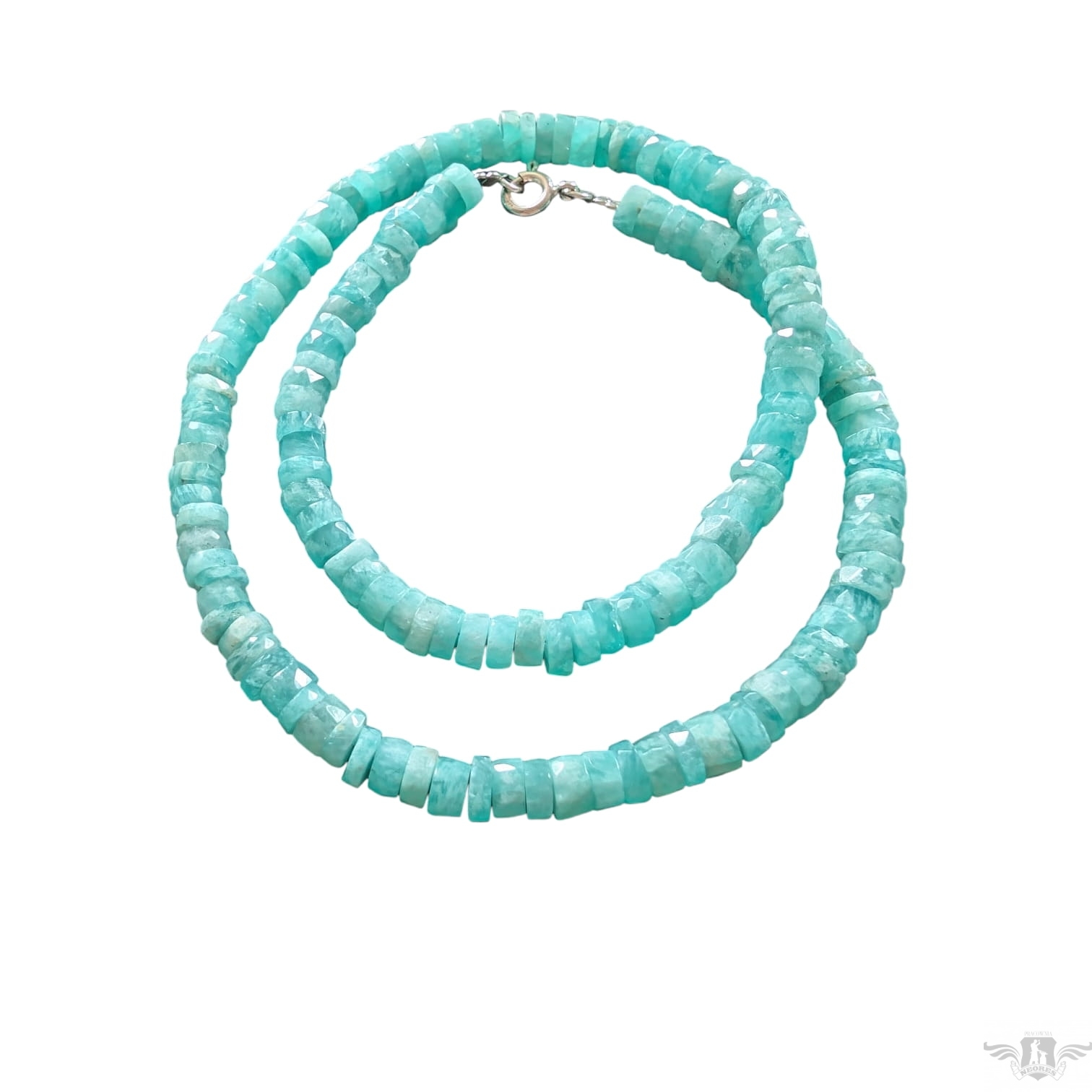 Naszyjnik z fasetowanych amazonitów, kamienie pięknie połyskują. Zapięcie srebro 925. Grubość 6 mm, długość naszyjnika 45 cm. Piękny, świetlisty letni kolor. Naszyjniki robimy sami. Zapakowany w ozdobne pudełeczko.