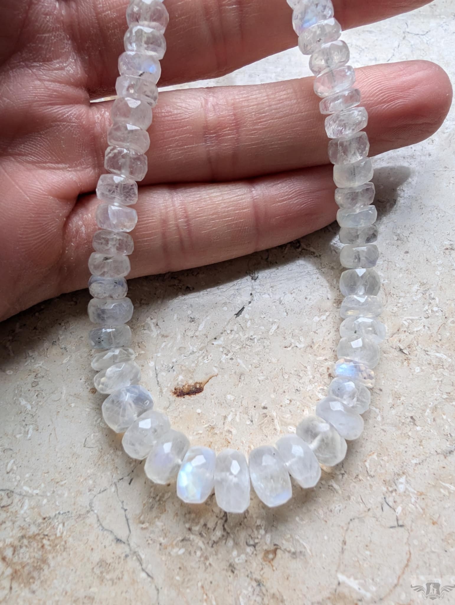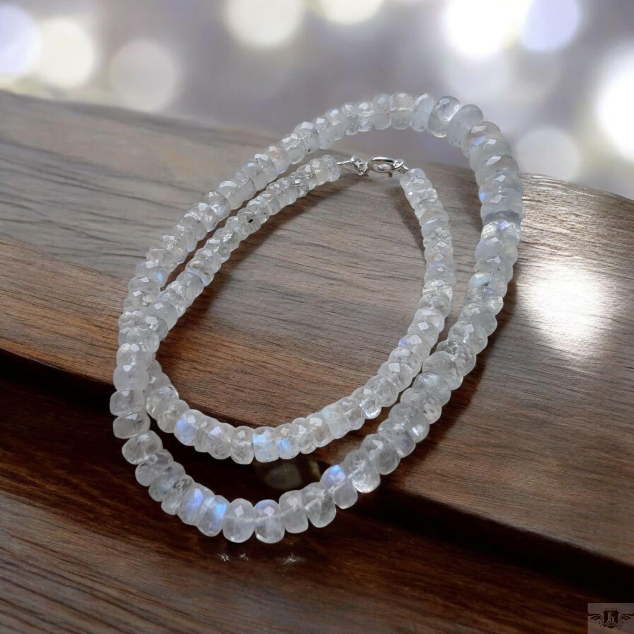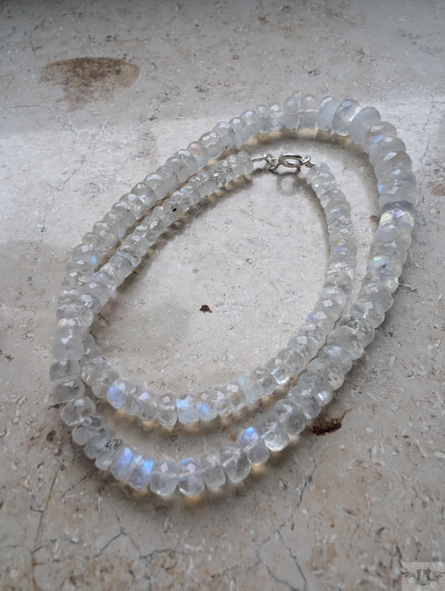 Naszyjnik wykonany ze starannie wyselekcjonowanych, fasetowanych kamieni księżycowych, świetna jakość. Grubość 9 mm, długość 48 cm. Polecam, piękne kamienie. Naszyjniki wykonujemy sami.