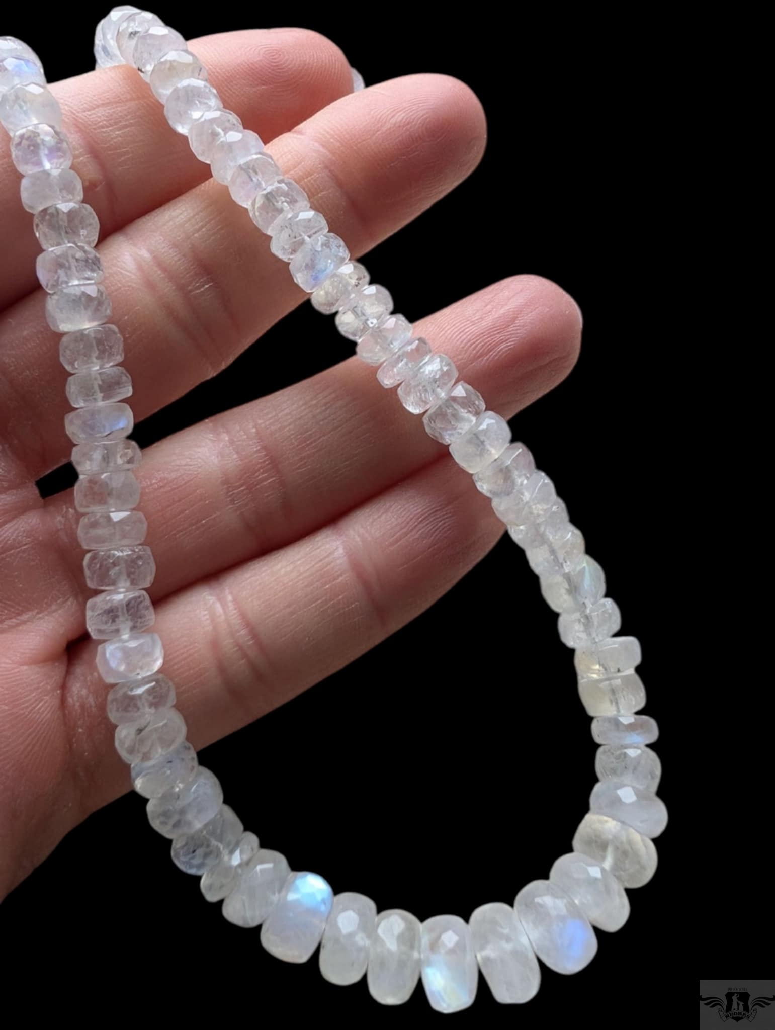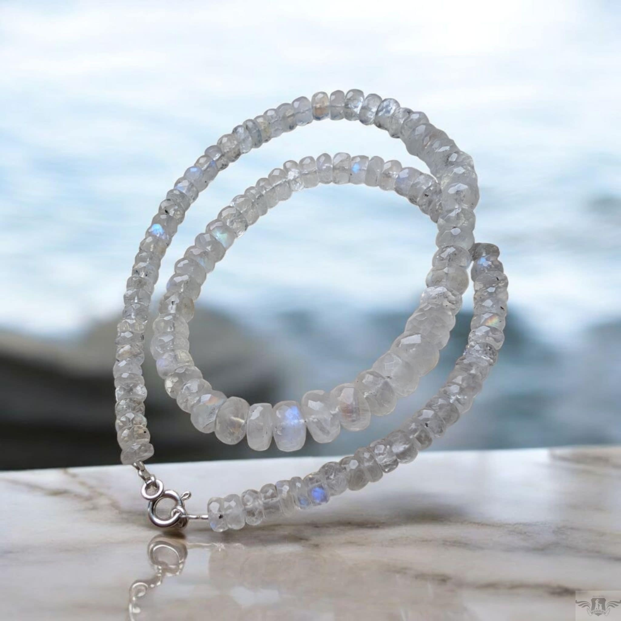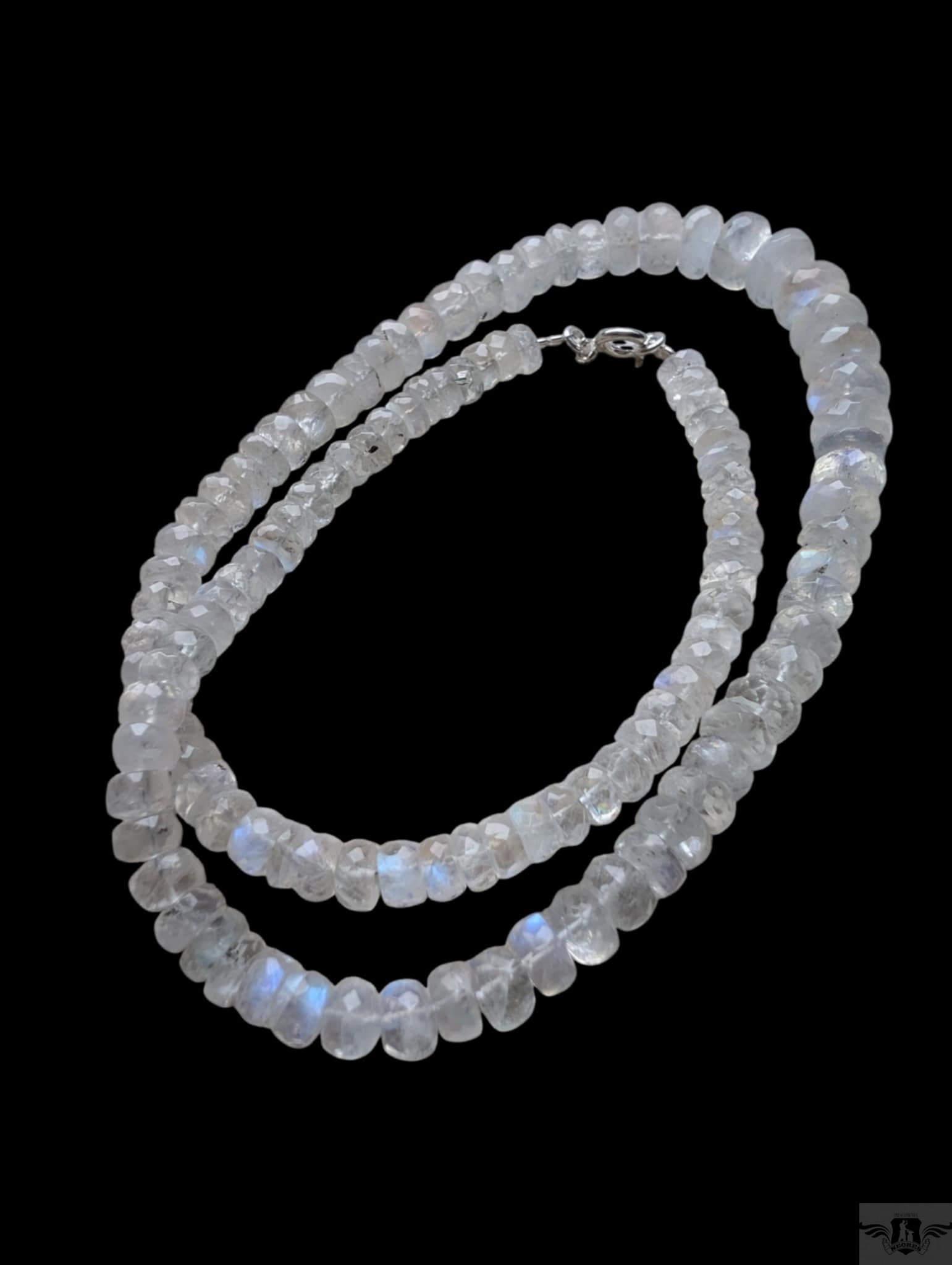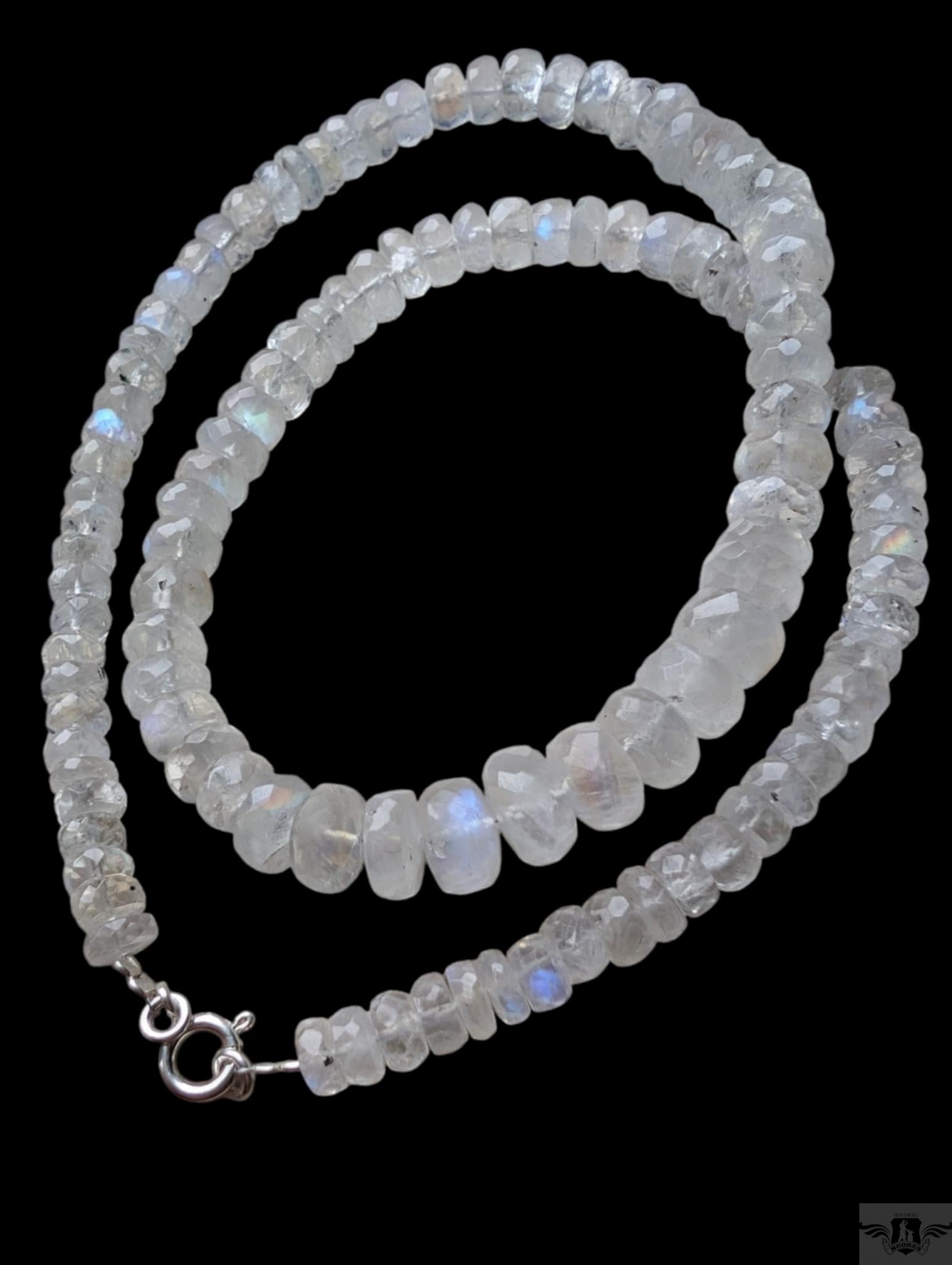 Naszyjnik wykonany ze starannie wyselekcjonowanych, fasetowanych kamieni księżycowych, świetna jakość. Grubość 9 mm, długość 48 cm. Polecam, piękne kamienie. Naszyjniki wykonujemy sami.
