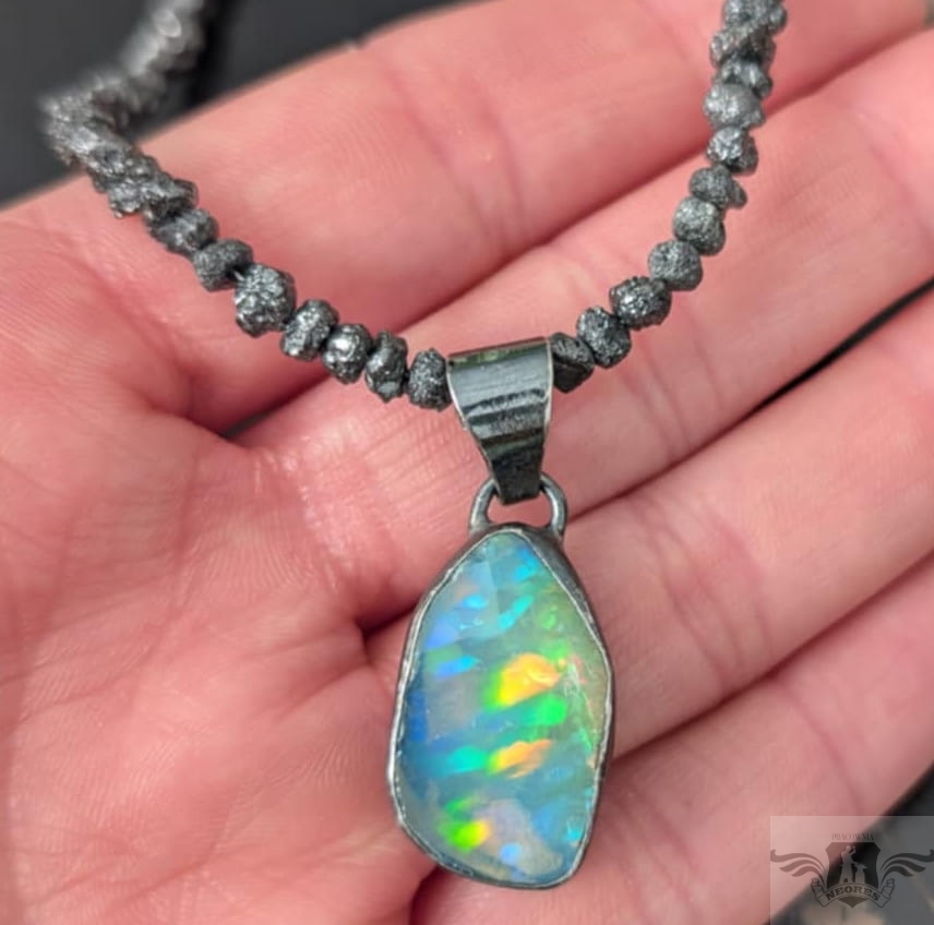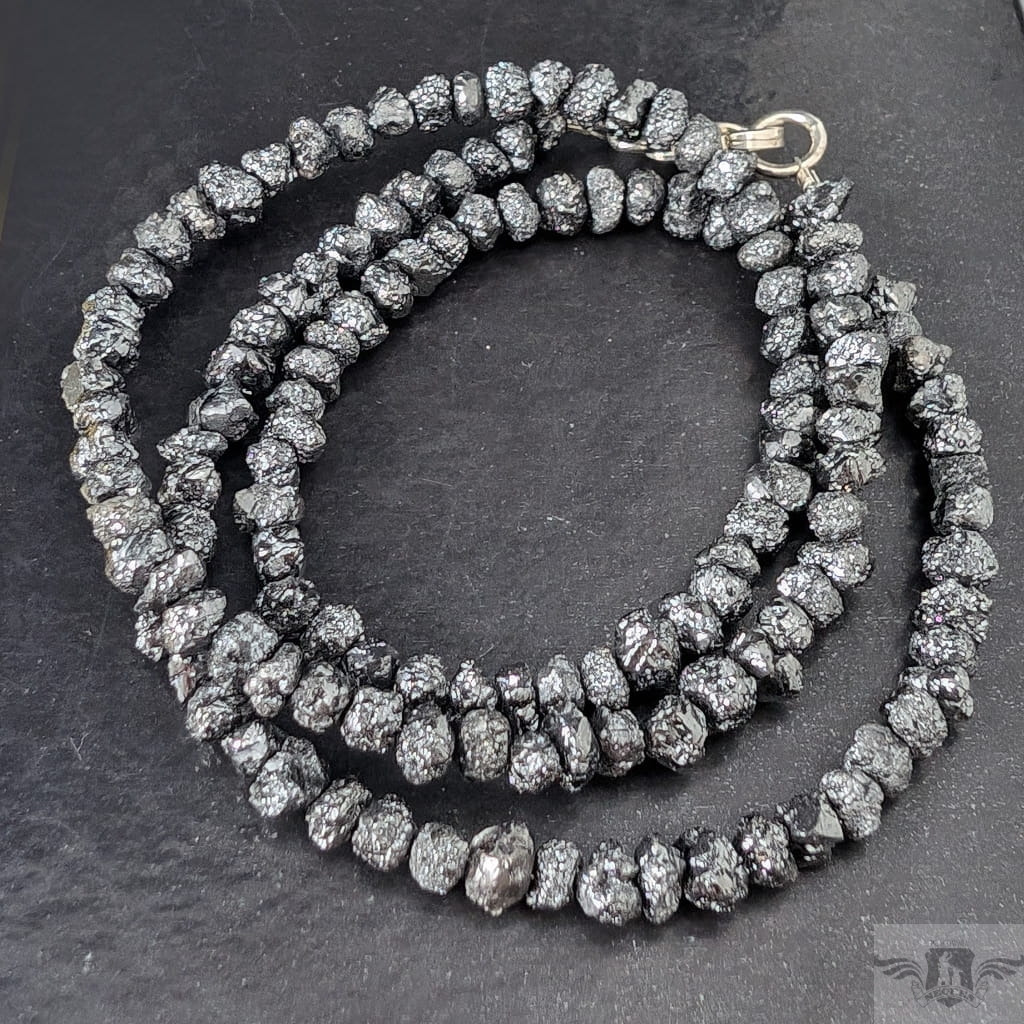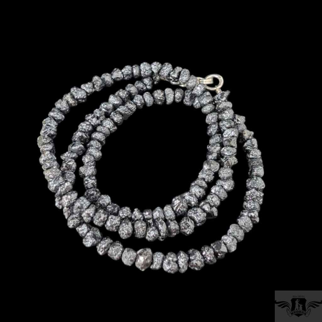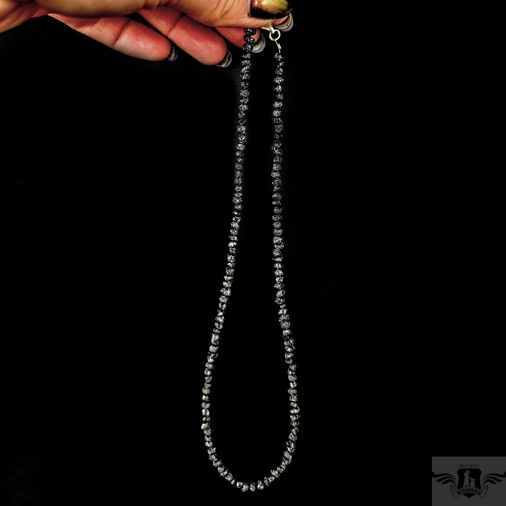 Naszyjnik z surowych, czarnych diamentów, kamienie pięknie połyskują. Zapięcie srebro 925. Grubość 4 mm, długość naszyjnika 44 cm. Idealnie komponuje się z wisiorami z pracowni. Zapakowany w ozdobne pudełeczko.