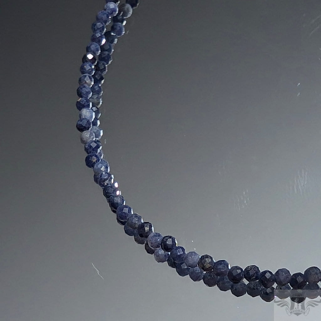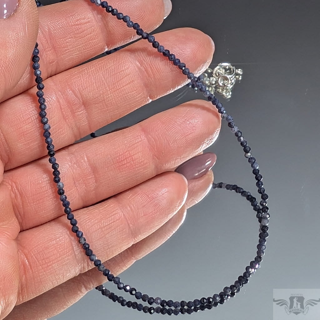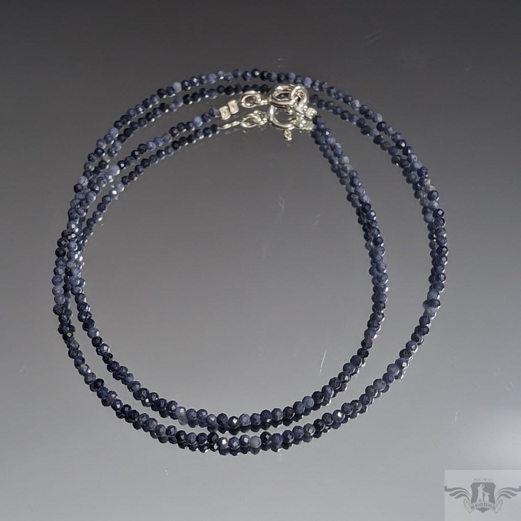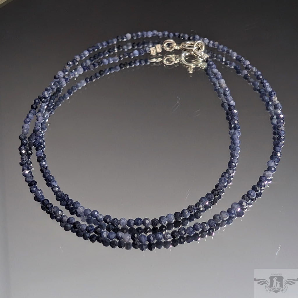 Naszyjnik z fasetowanych szafirów, kamienie pięknie połyskują. Zapięcie srebro 925. Grubość 2 mm, długość naszyjnika 44 cm. Idealnie komponuje się z lekkimi wisiorami z pracowni (do ok 5 g) . Naszyjniki robimy sami.