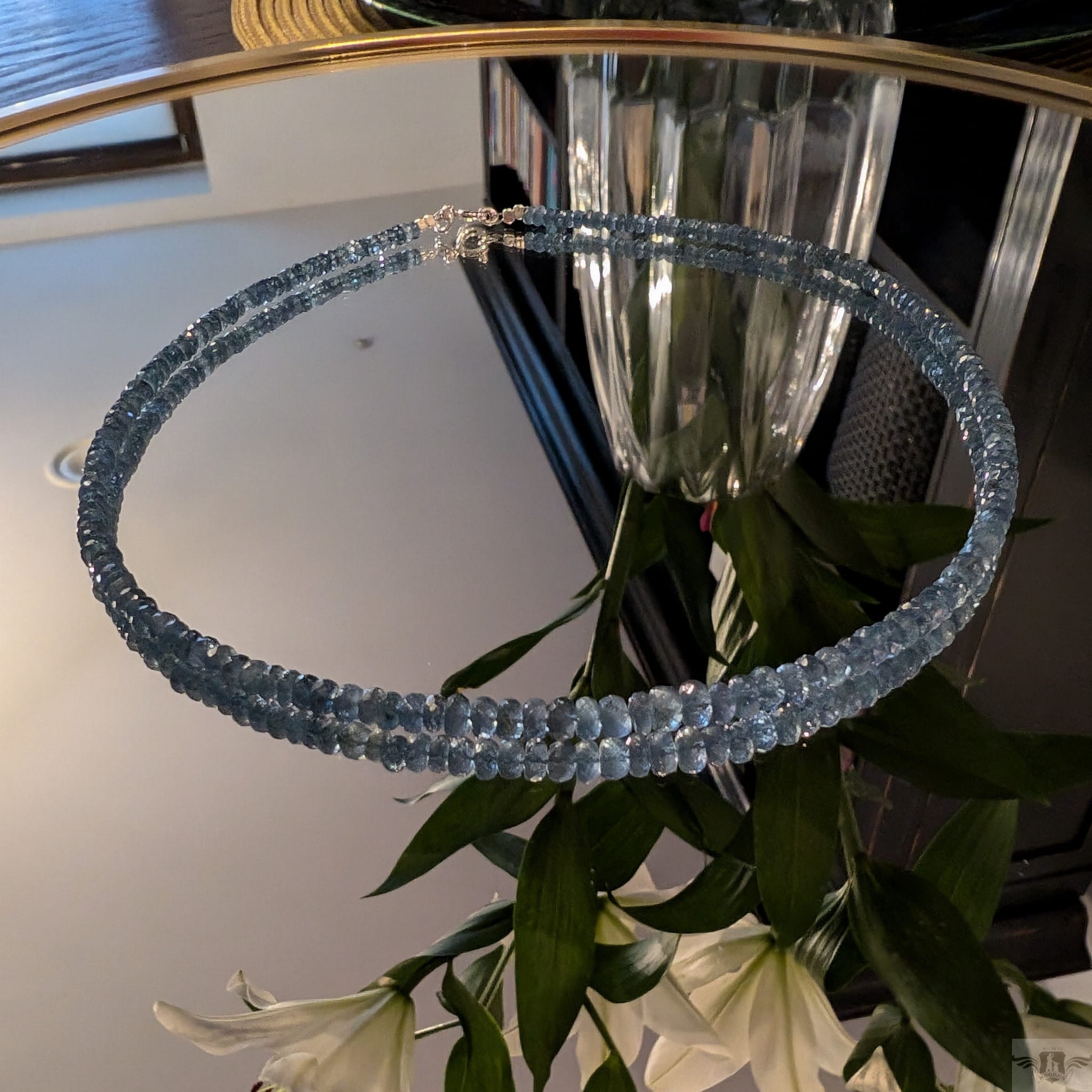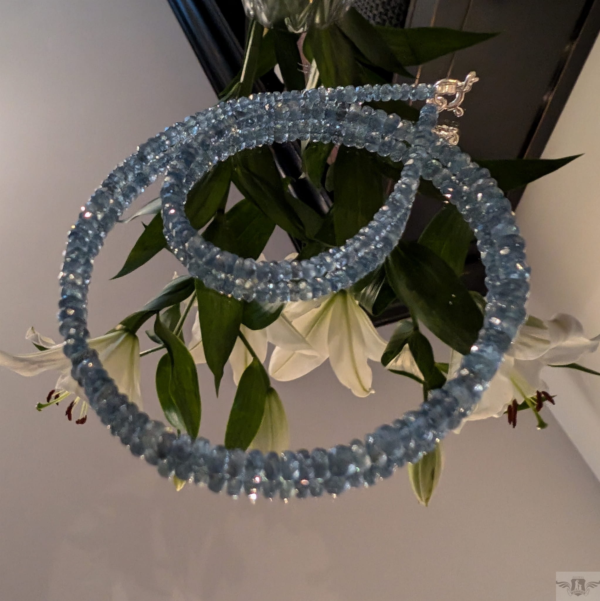 Naszyjnik ze starannie wyselekcjonowanych, fasetowanych akwamarynów o przepięknym odcieniu, świetna jakość. Zapięcie srebro 925. Grubość max 6 mm, długość naszyjnika 46 cm Zapakowany w ozdobne pudełeczko.