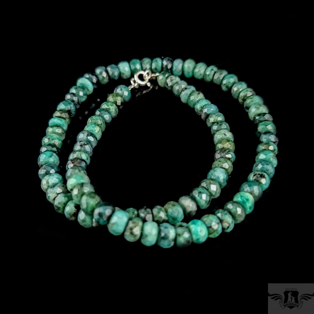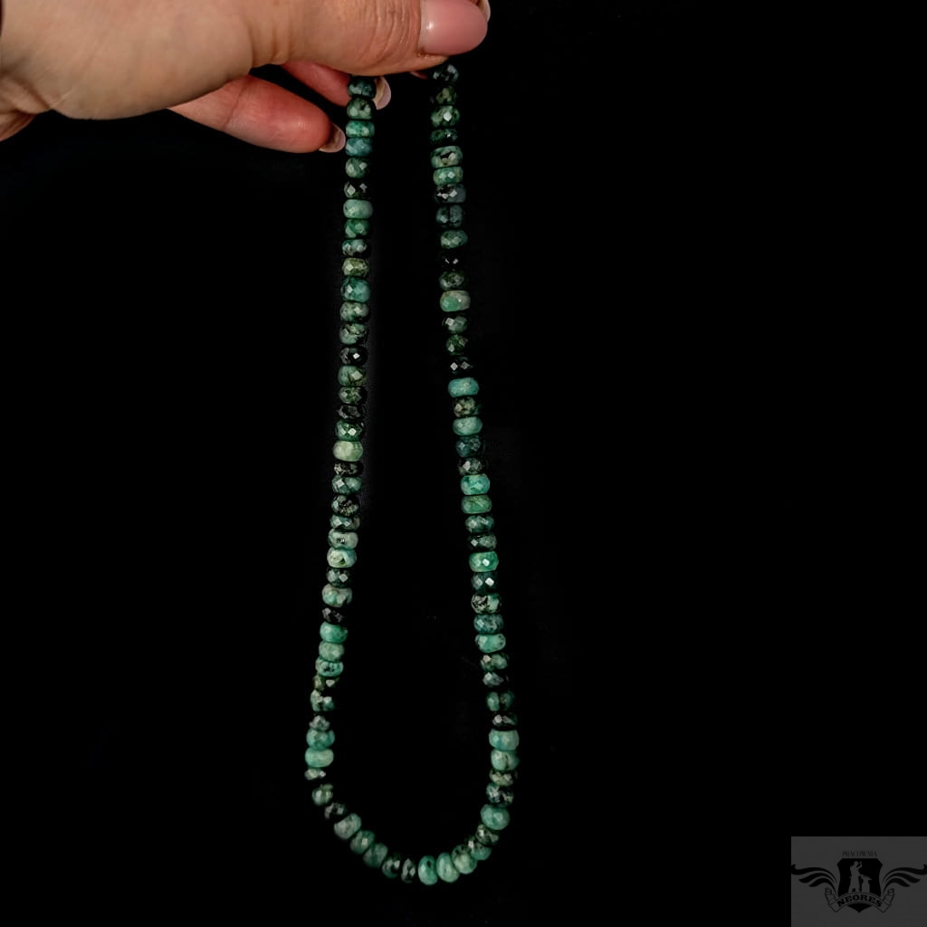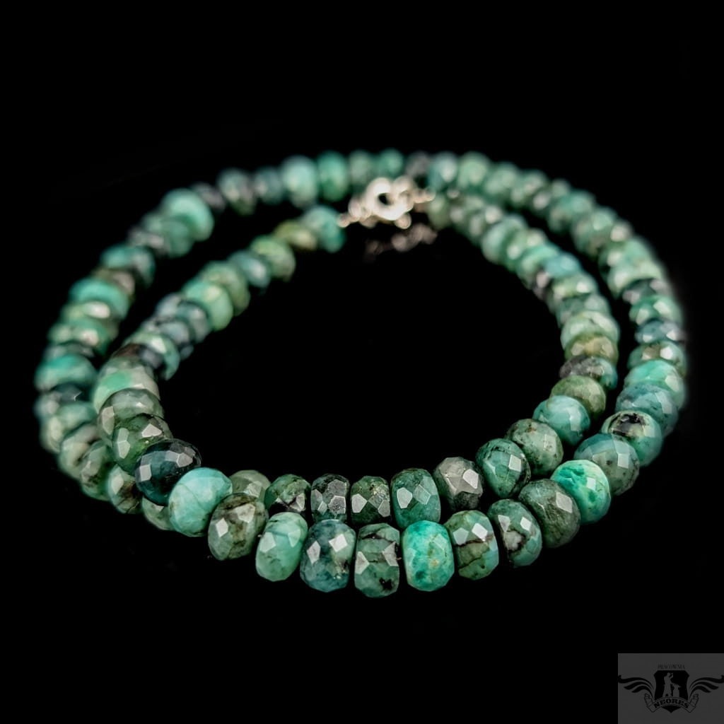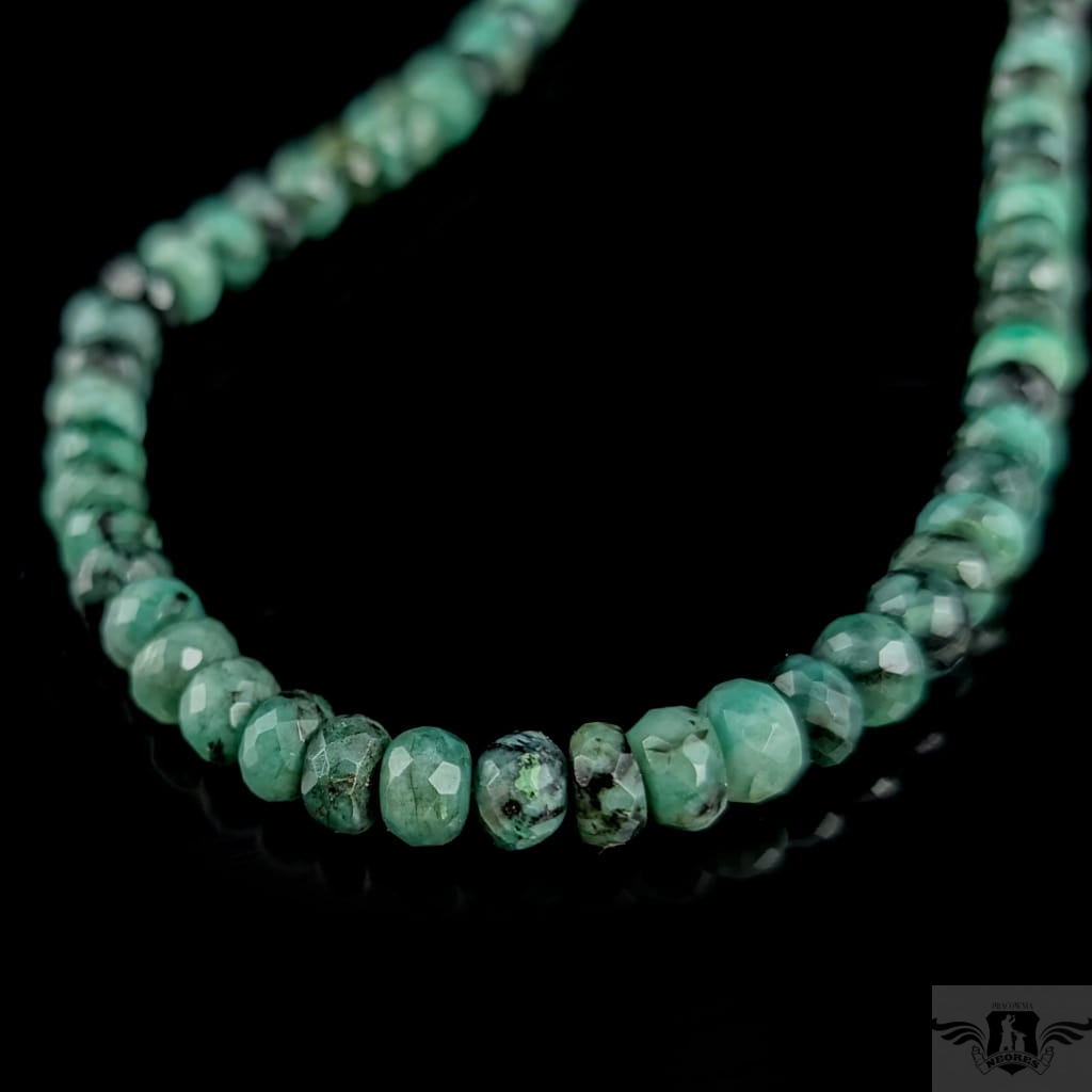 Okazały naszyjnik ze starannie wyselekcjonowanych, fasetowanych szmaragdów o ślicznym odcieni zieleni. Zapięcie srebro 925. Grubość 7 mm, długość naszyjnika 43,5 cm. Zapakowany w ozdobne pudełeczko.