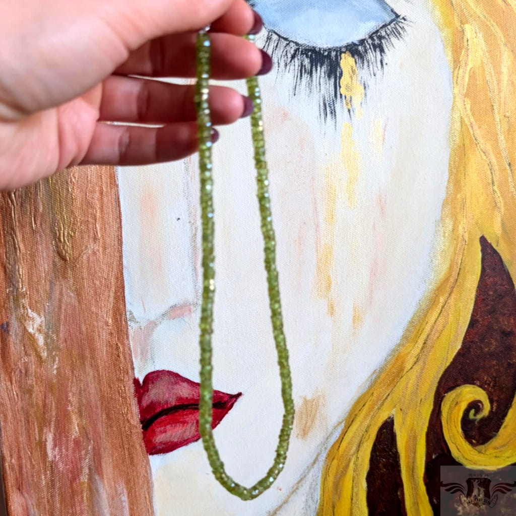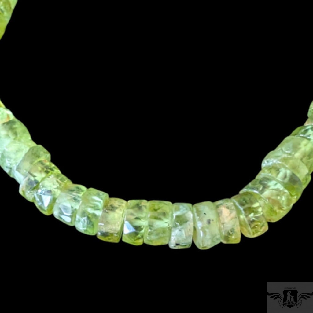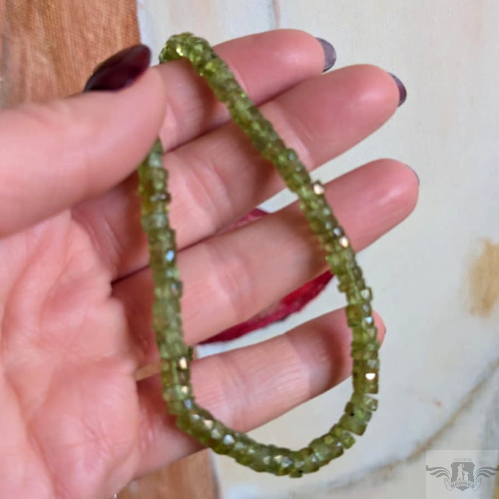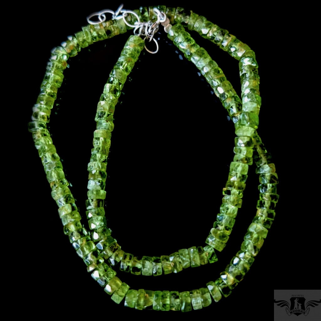 Naszyjnik wykonany ze starannie wyselekcjonowanych, fasetowanych oliwinów o przepięknej barwie soczystej zieleni. Grubość kamieni max 6 mm, długość 44 cm. Srebrny łańcuszek przedłuża obwód do max 50 cm. Polecam, piękne kamienie. Naszyjniki wykonujemy sami.