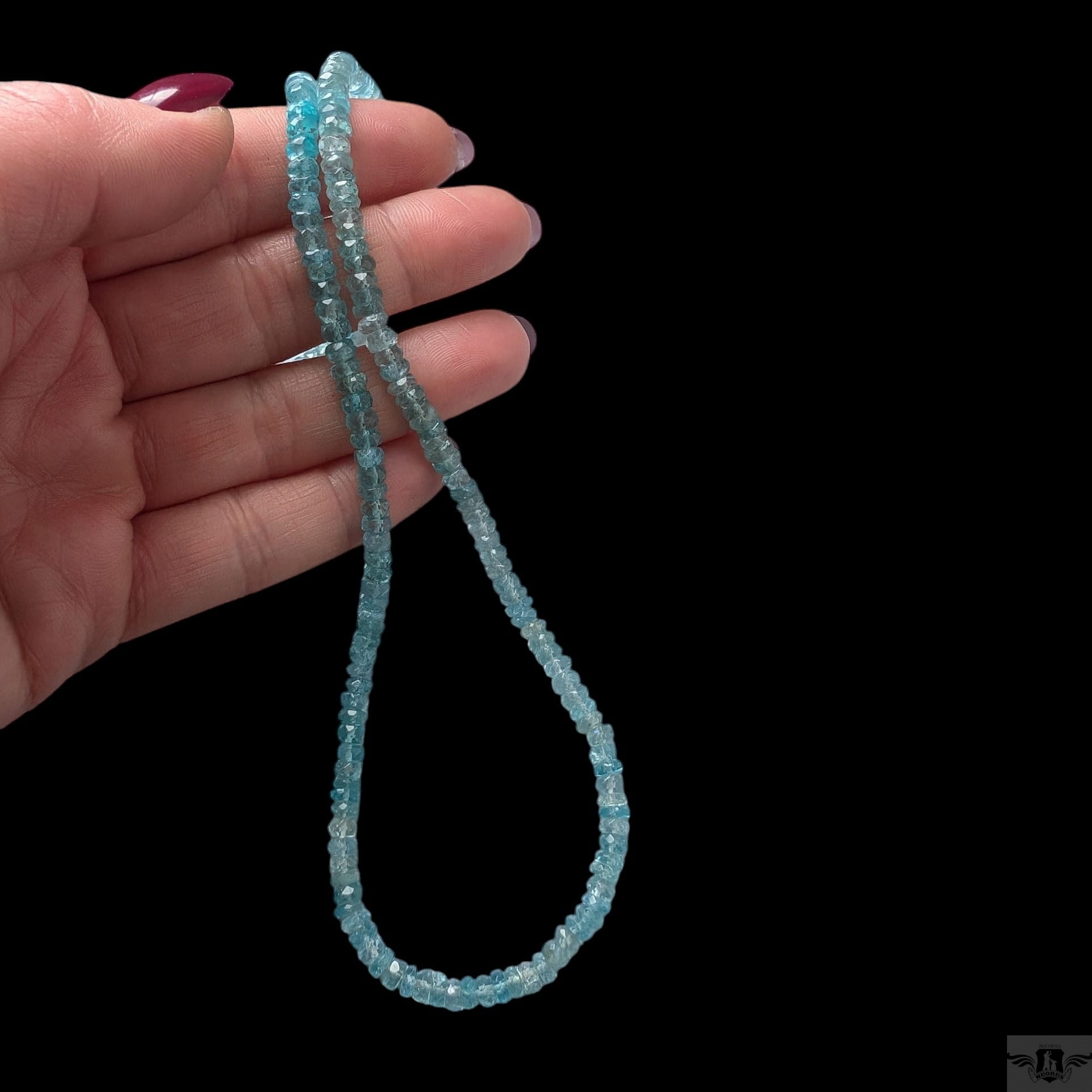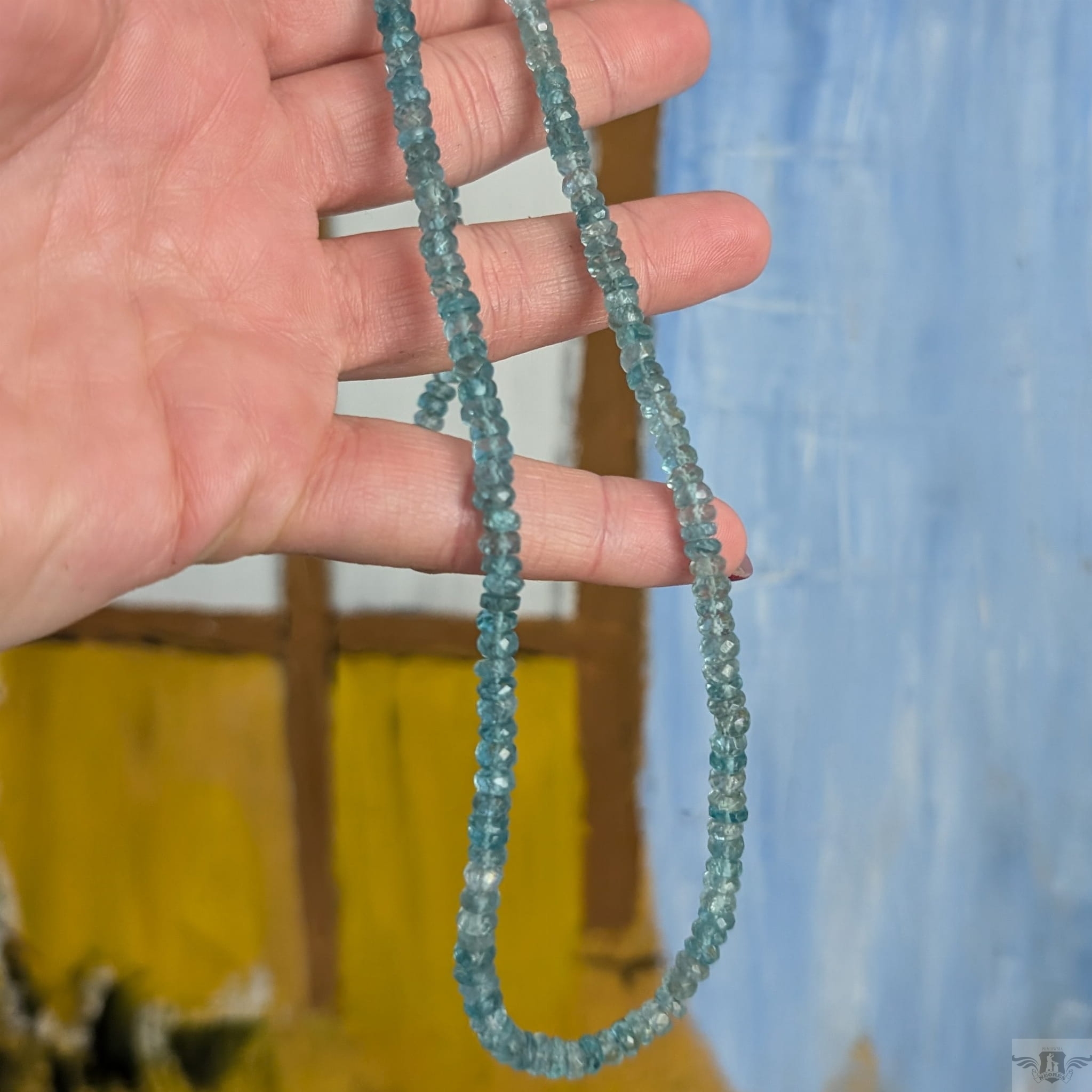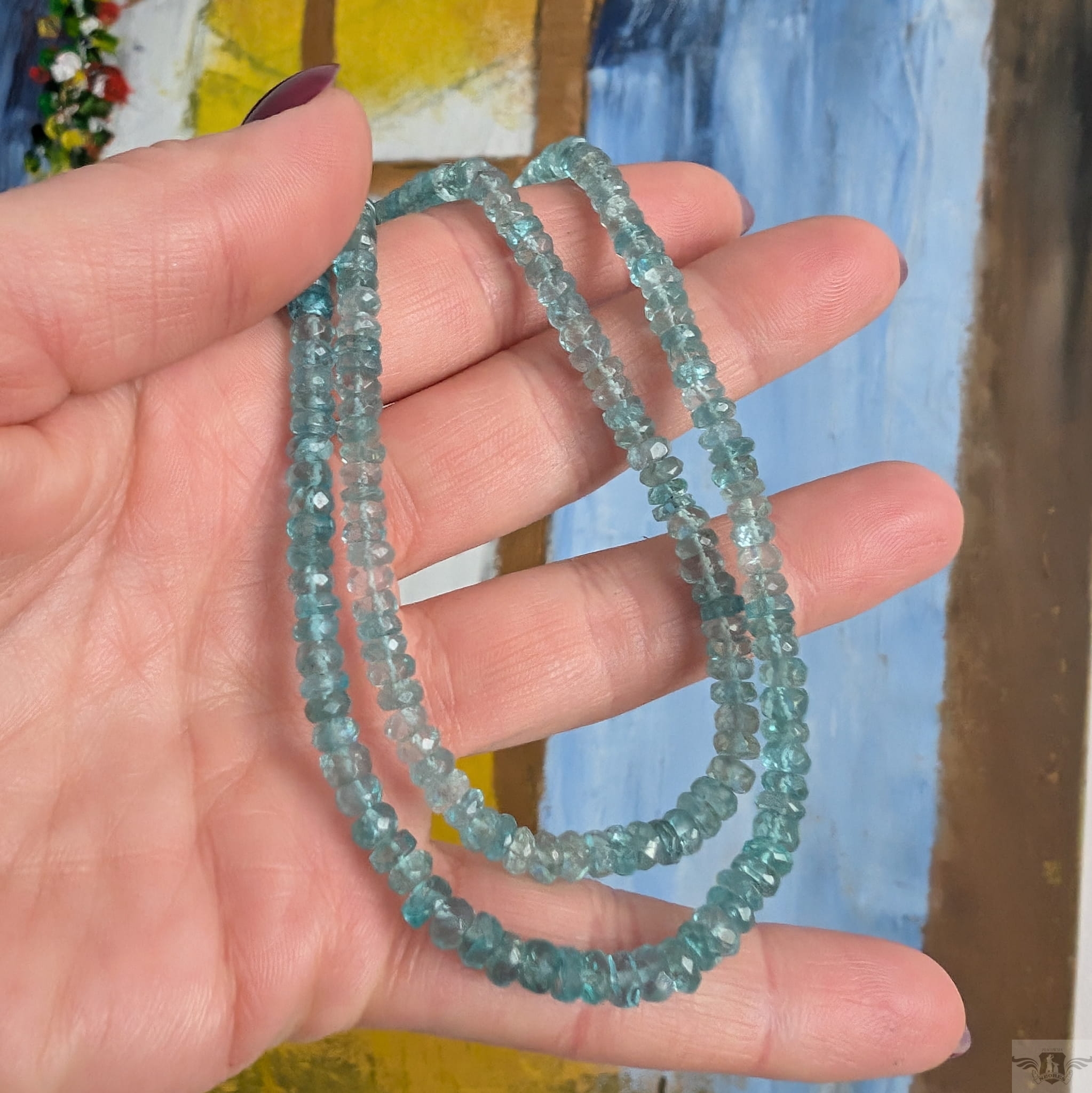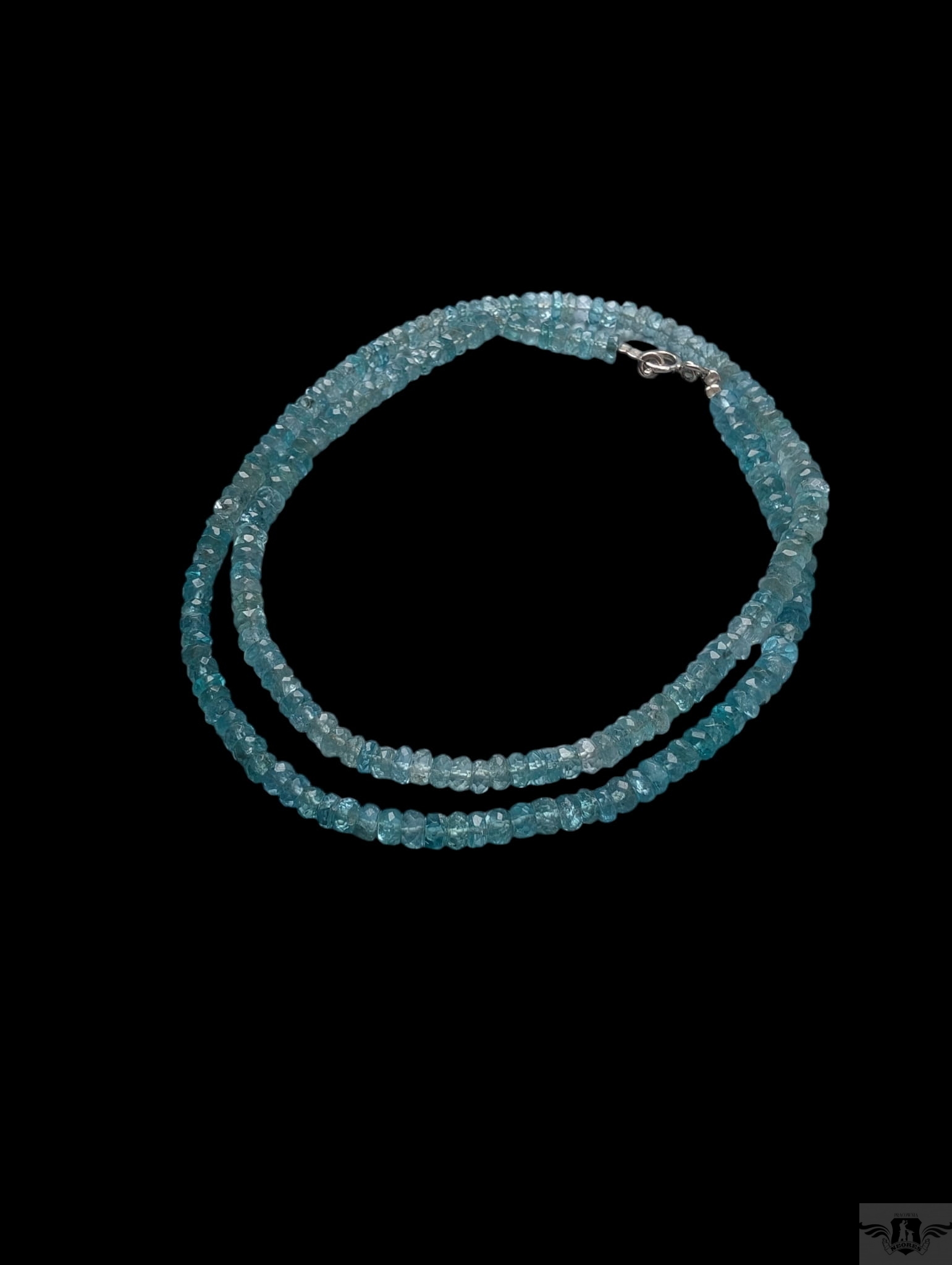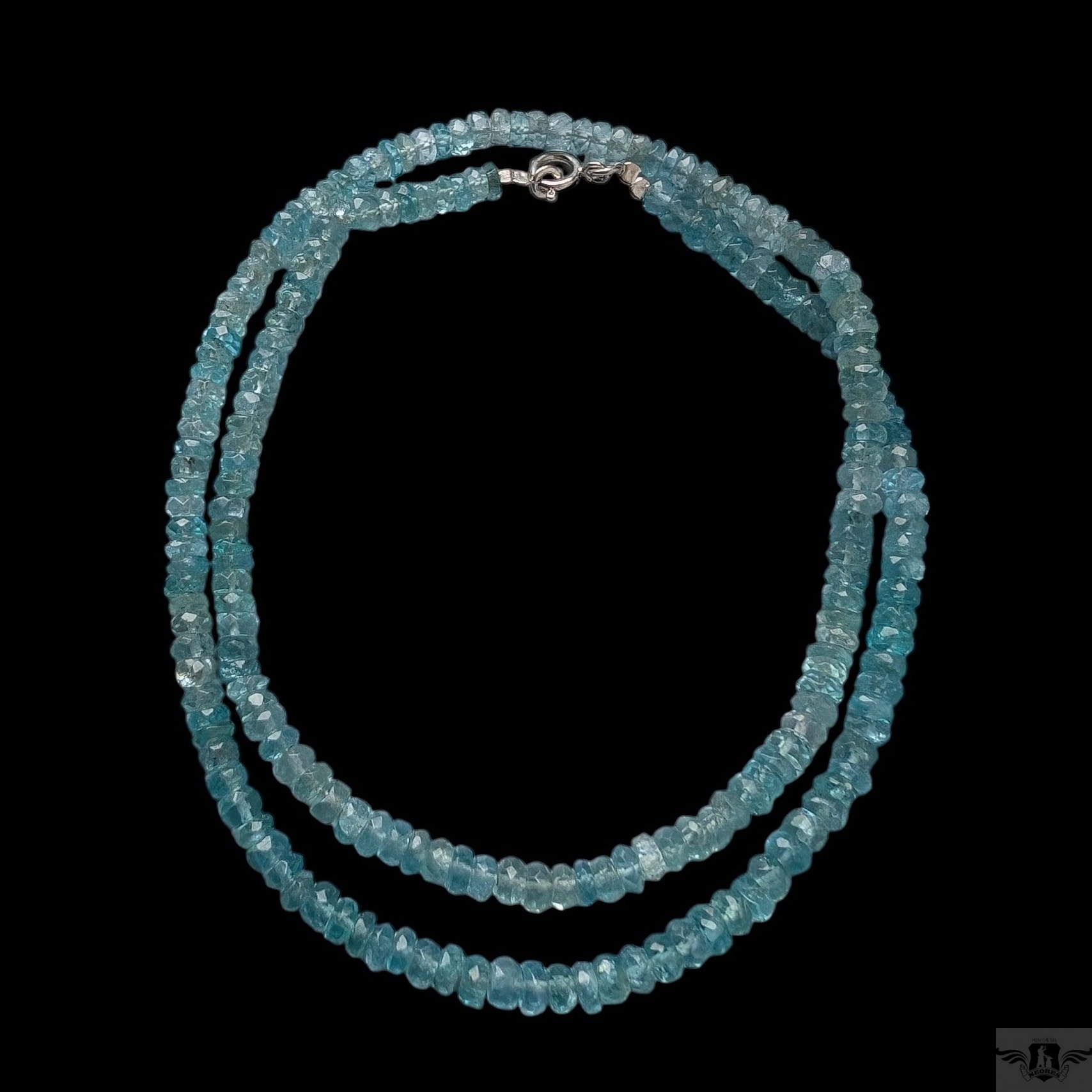 Naszyjnik z fasetowanych, morskich apatytów, kamienie pięknie połyskują. Zapięcie srebro pr 925. Grubość kamieni 5 mm, długość naszyjnika 54 cm. Naszyjniki wykonujemy sami. Jedyny egzemplarz. Zapakowany w ozdobne pudełeczko.