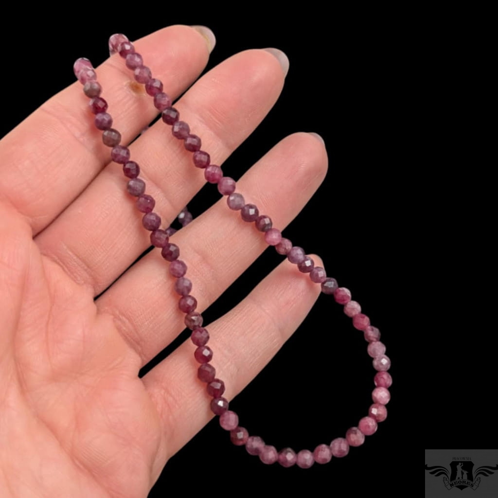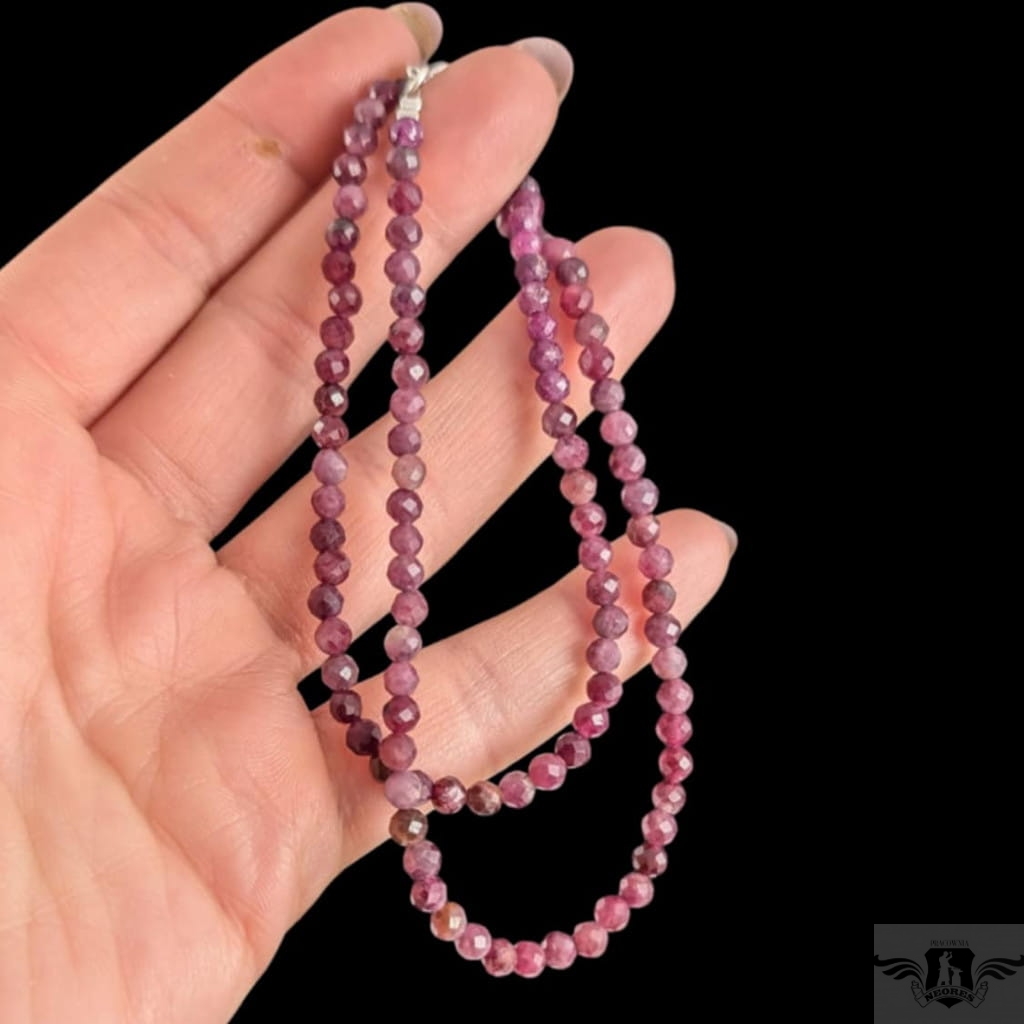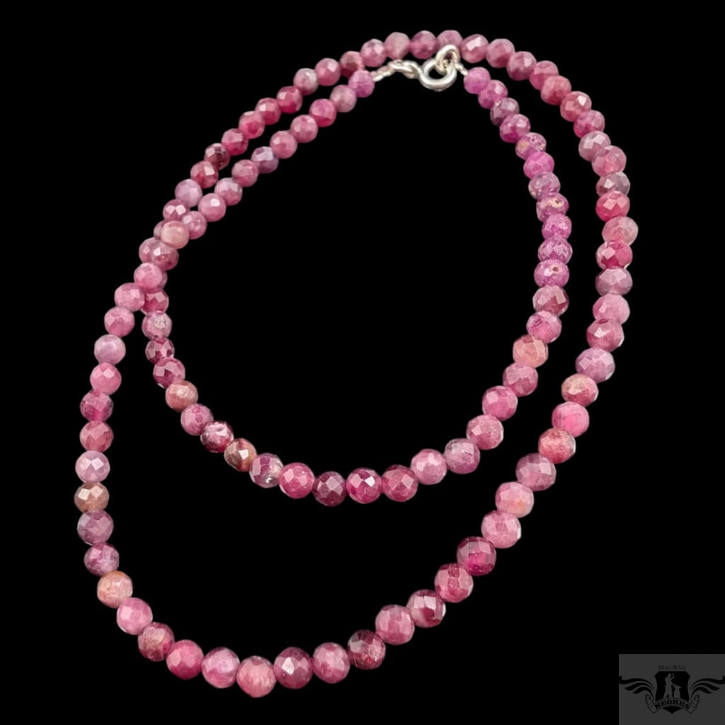 Naszyjnik z fasetowanych, okrągłych rubinów, kamienie pięknie połyskują dzięki precyzyjnemu szlifowi. Zapięcie srebro 925. Grubość 4 mm, długość naszyjnika 45 cm. . Zapakowany w ozdobne pudełeczko