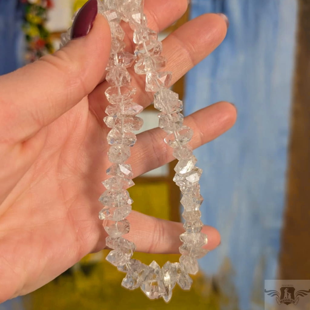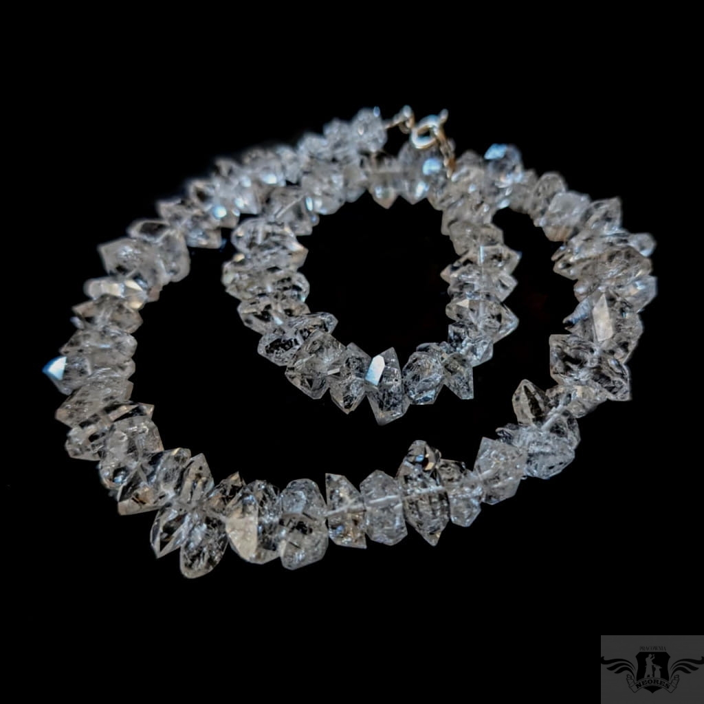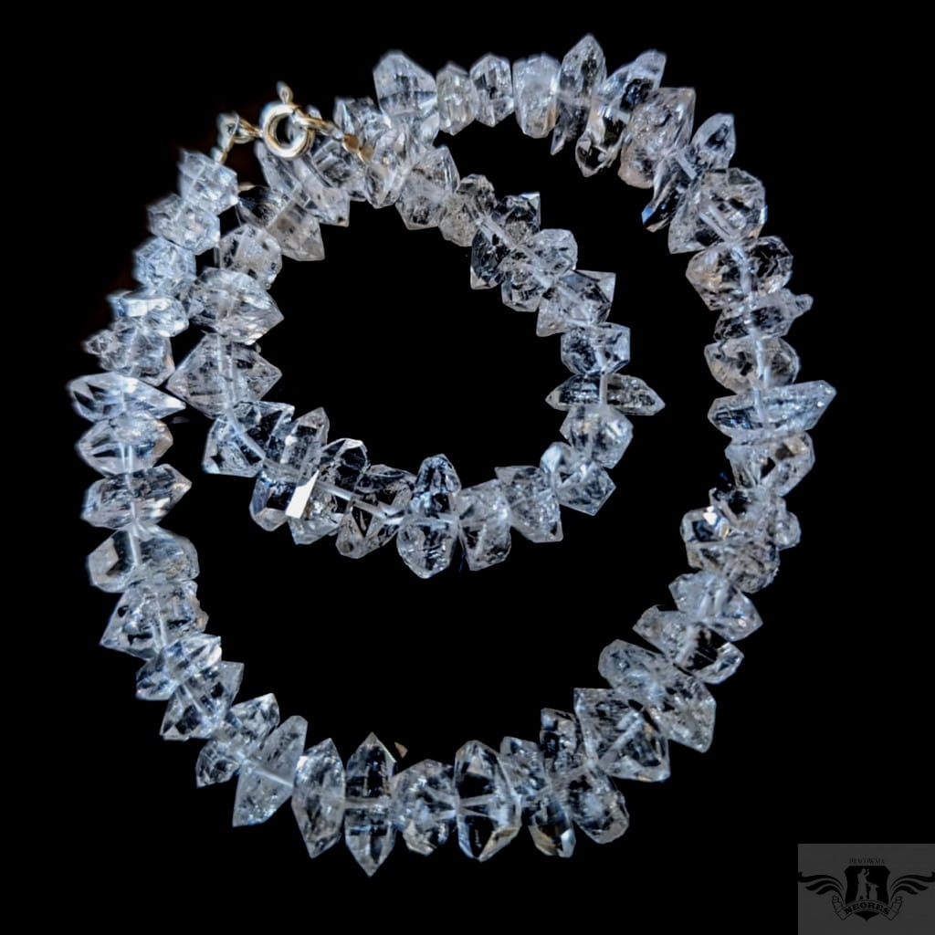 Naszyjnik z przepięknych herkimerów, najczystszej odmiany kwarcu. Kamienie pięknie połyskują. Zapięcie srebro 925. Grubość ok 16 mm, długość naszyjnika 42 cm. Polecam, jest niezwykle piękny.