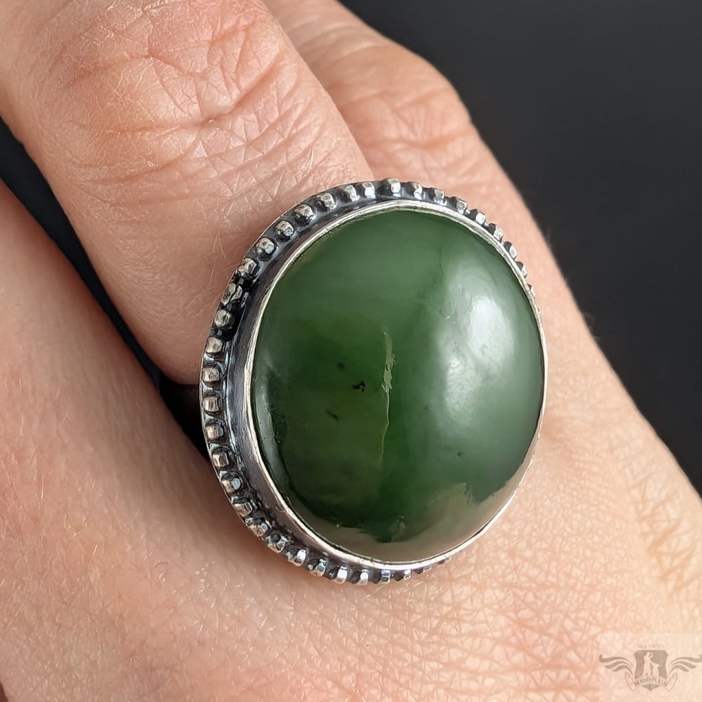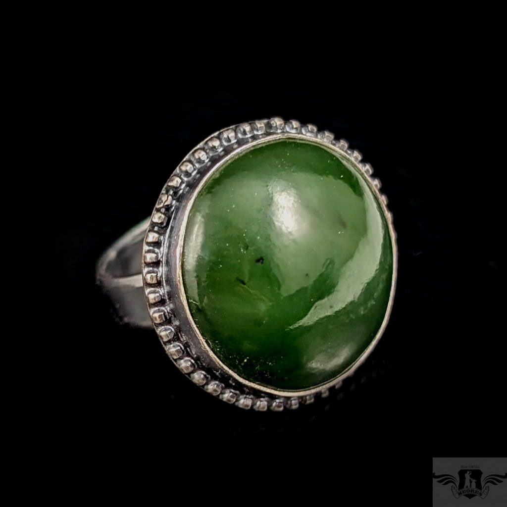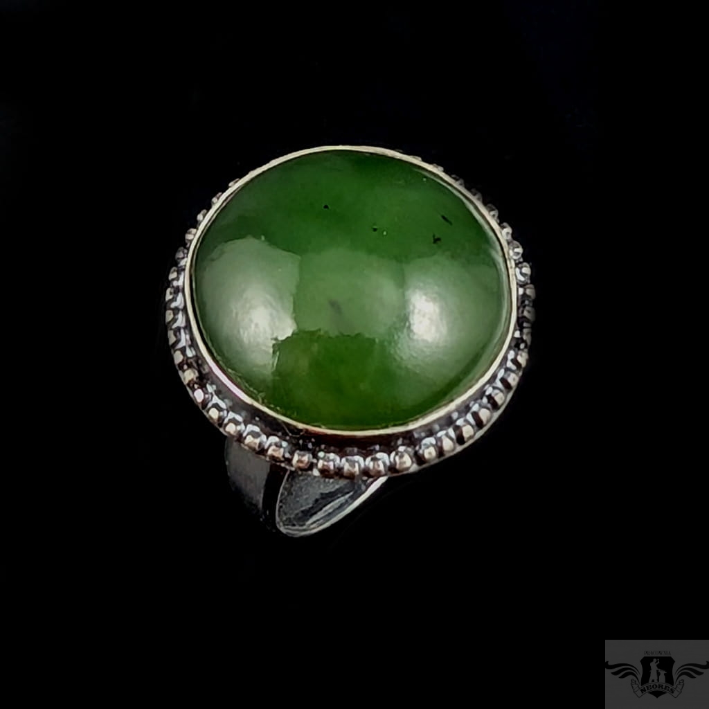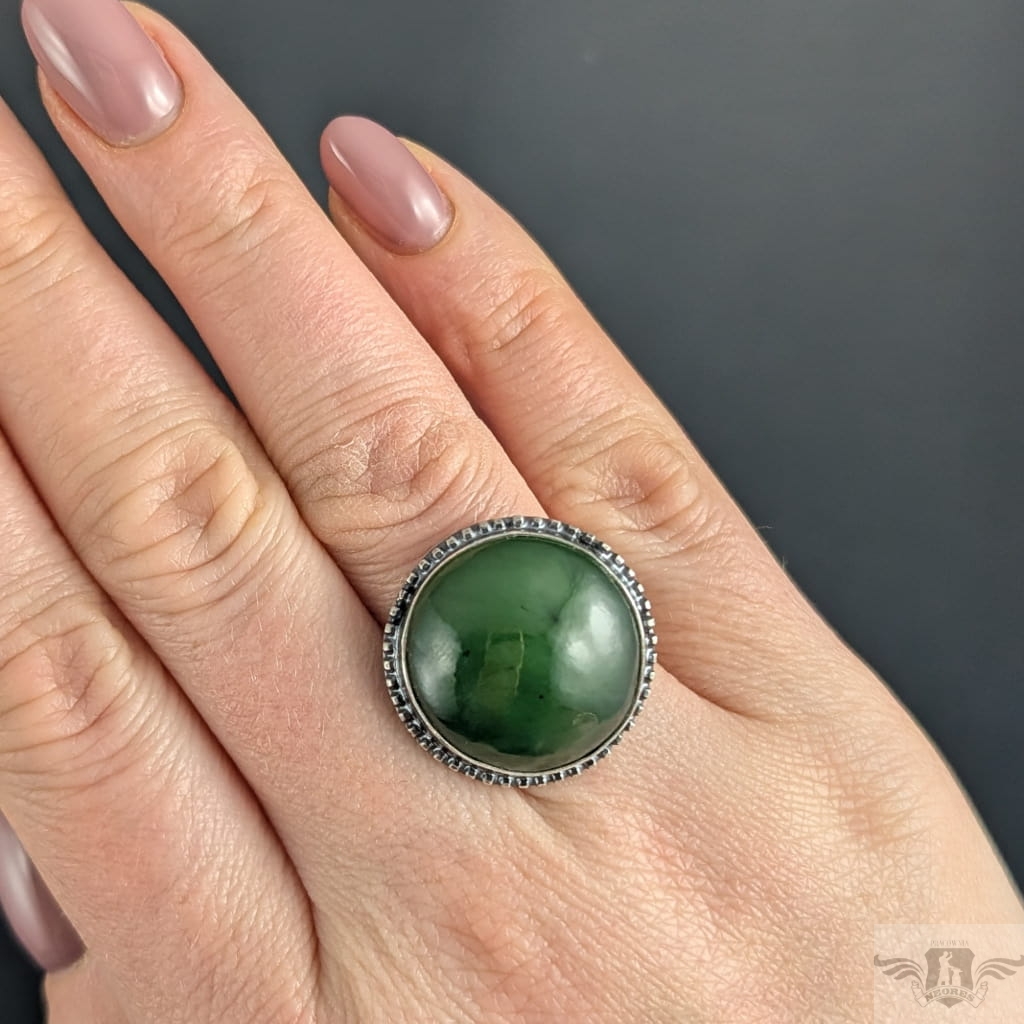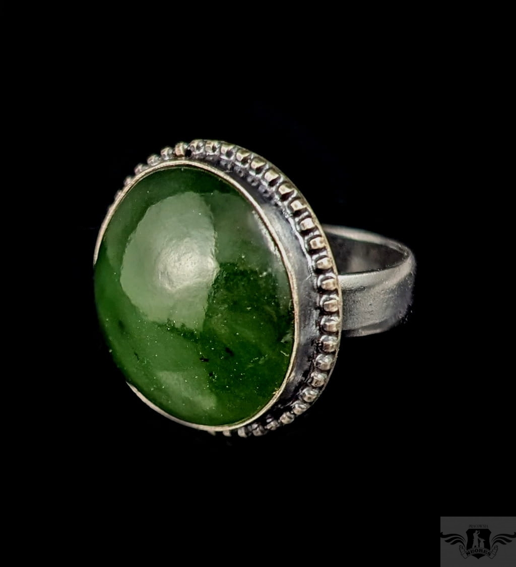 Subtelny retro pierścionek z naturalnym nefrytem. Wymiary oprawy 23 mm. Waga 11,5 grama. Regulowany w szerokim zakresie. Wyjątkowy prezent, wysłany w ozdobnym pudełeczku.