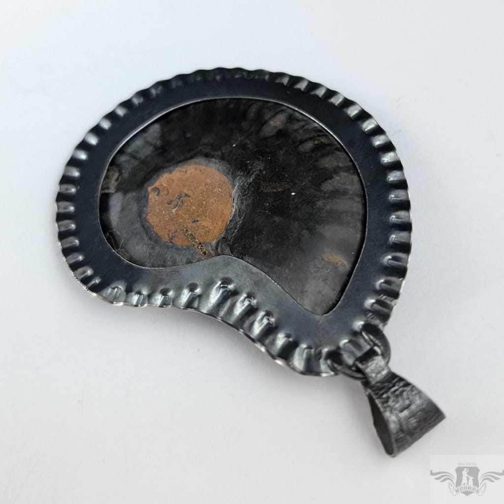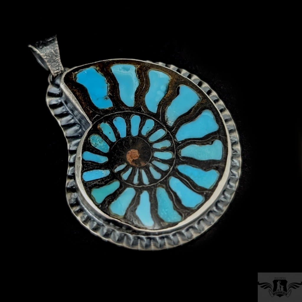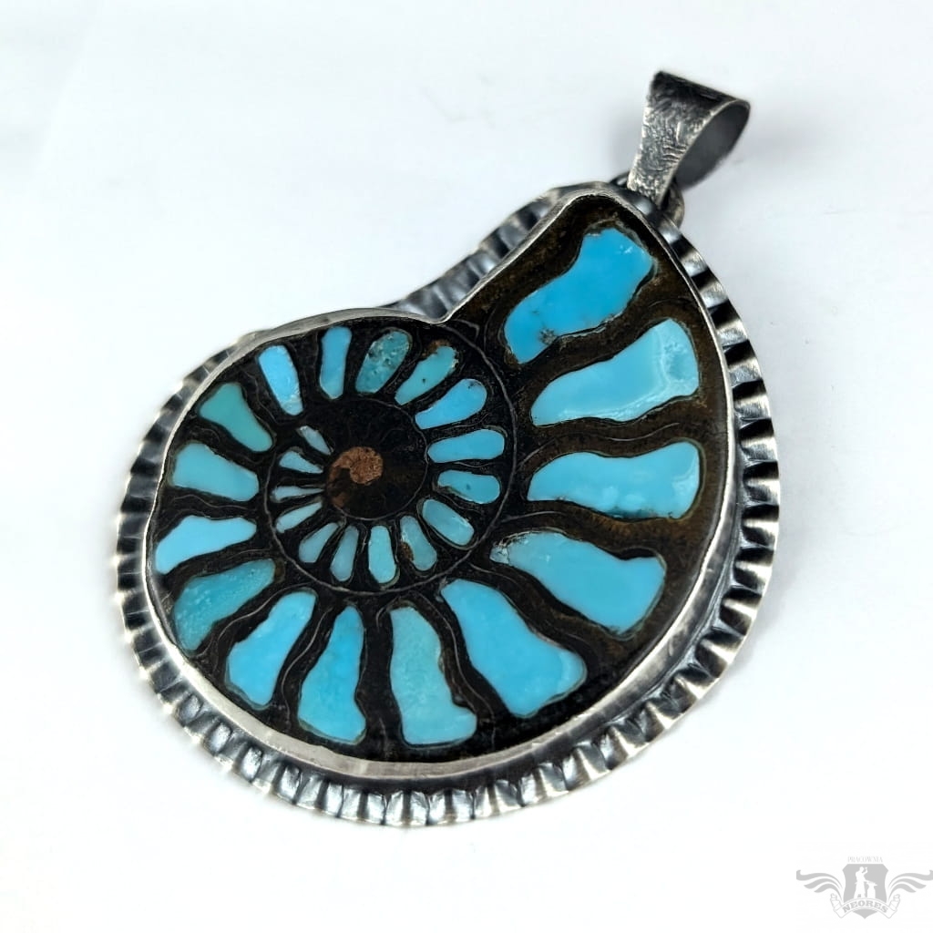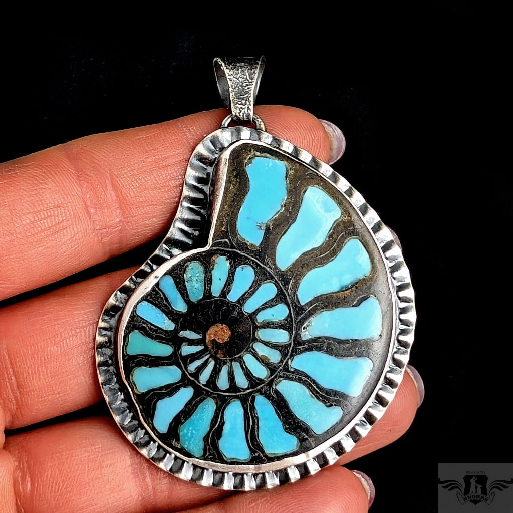 Okazały wisior , piękny amonit, w którego komorach spoczywa inkrustowany turkus. Amonit oprawiony został w srebro próby 925, oksydowane. Wymiary oprawy 55 x 47 mm, z krawatką 70 mm. Waga 22 g. Zostanie zapokowany w ozdobne pudełeczko. W galerii znajduje się wielki pierścień do kompletu.