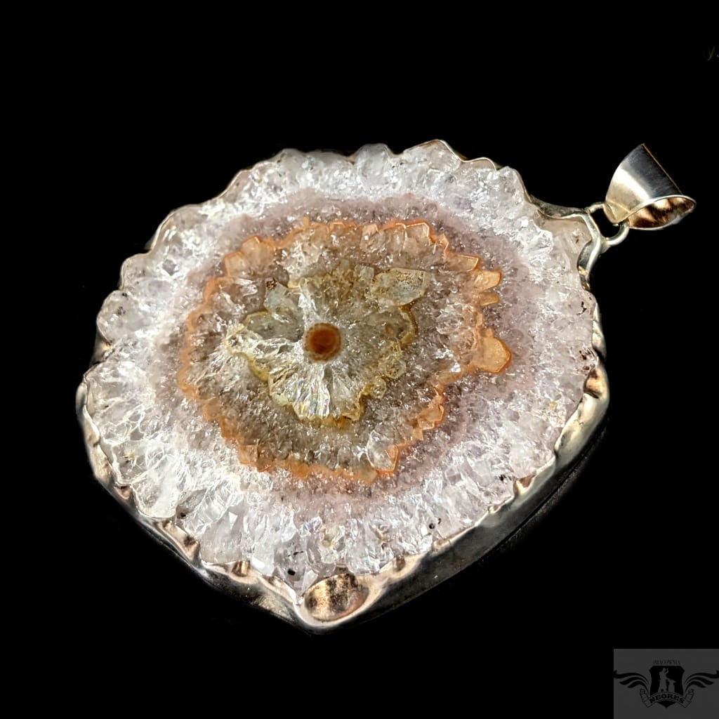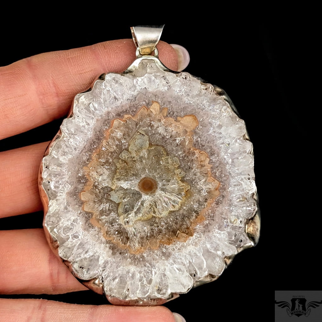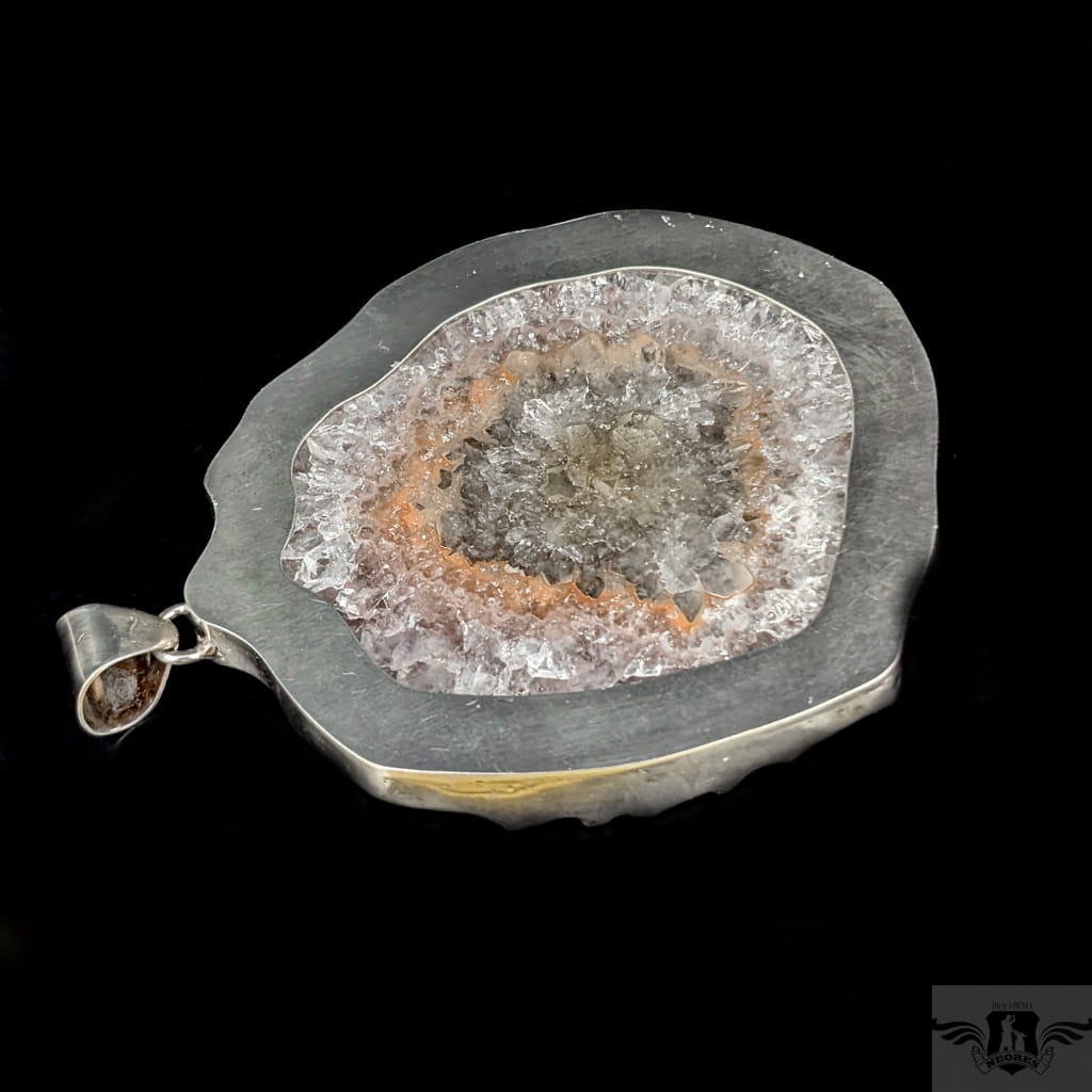 Ogromny wisior z pięknym solar kwarcem. Minerał oprawiony w srebro pr.925. Wymiary oprawy 71 x 61 mm, waga 76,6 g. Tył wisiora otwarty, ukazuje piękno całego minerału. Wisior zapakowany w ozdobne pudełeczko