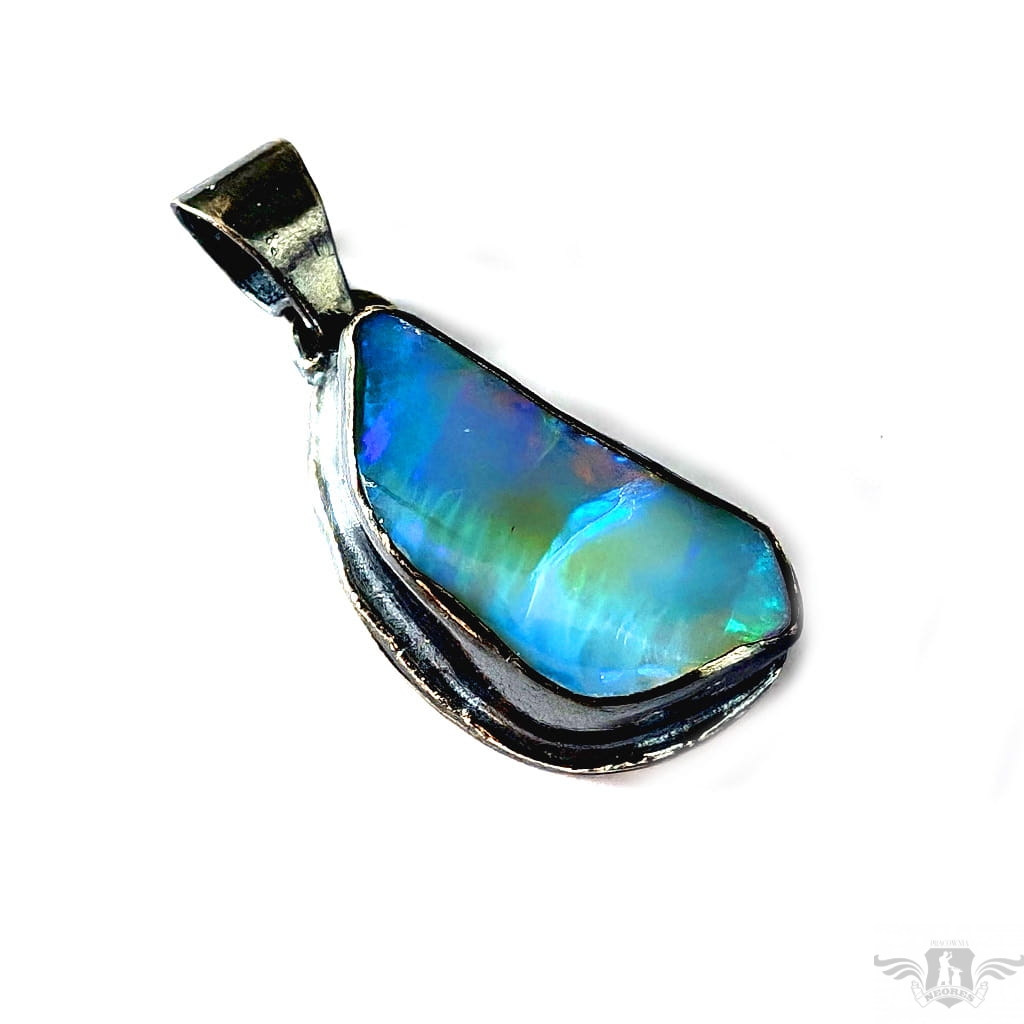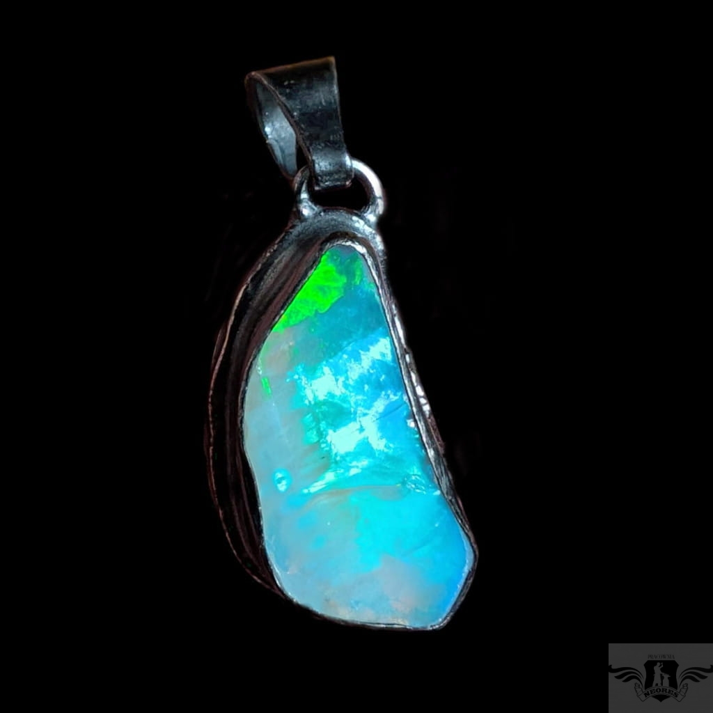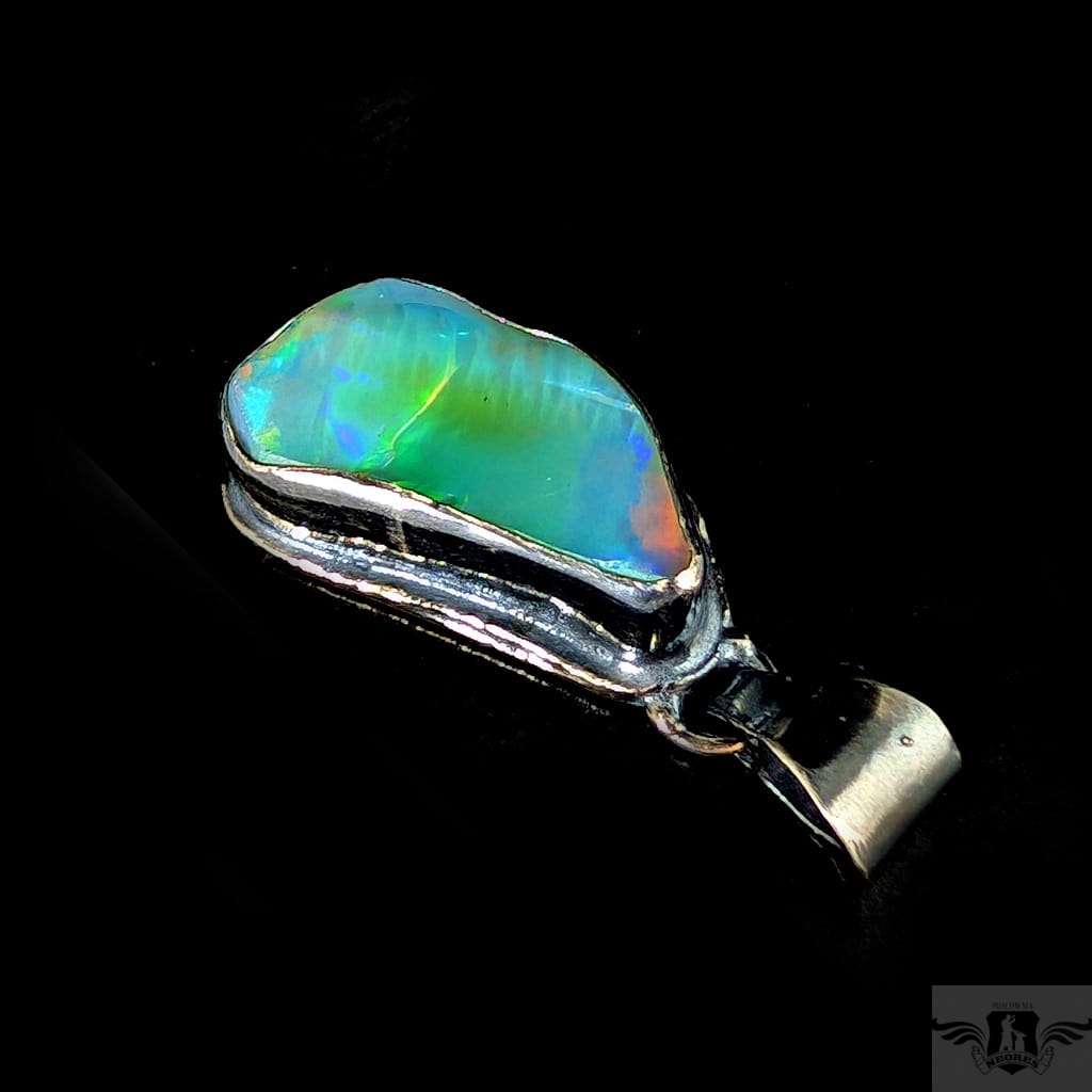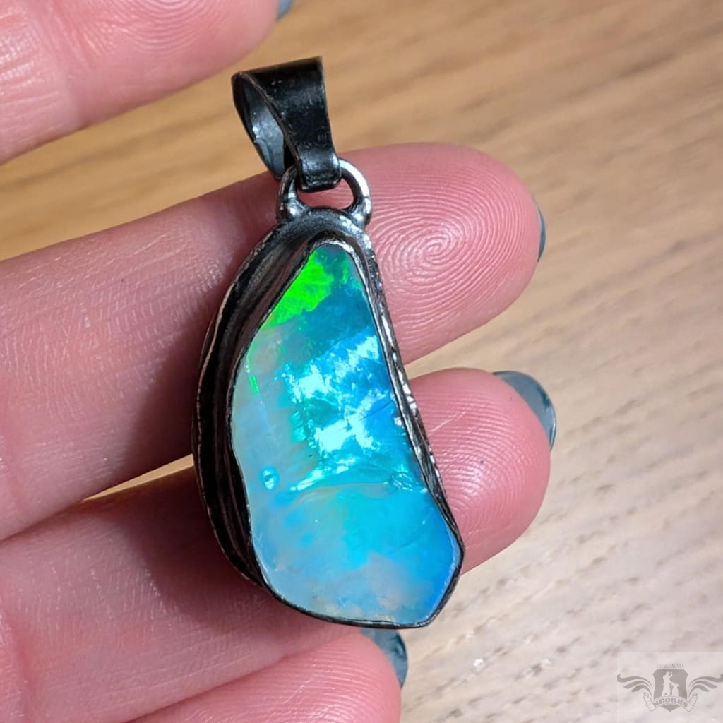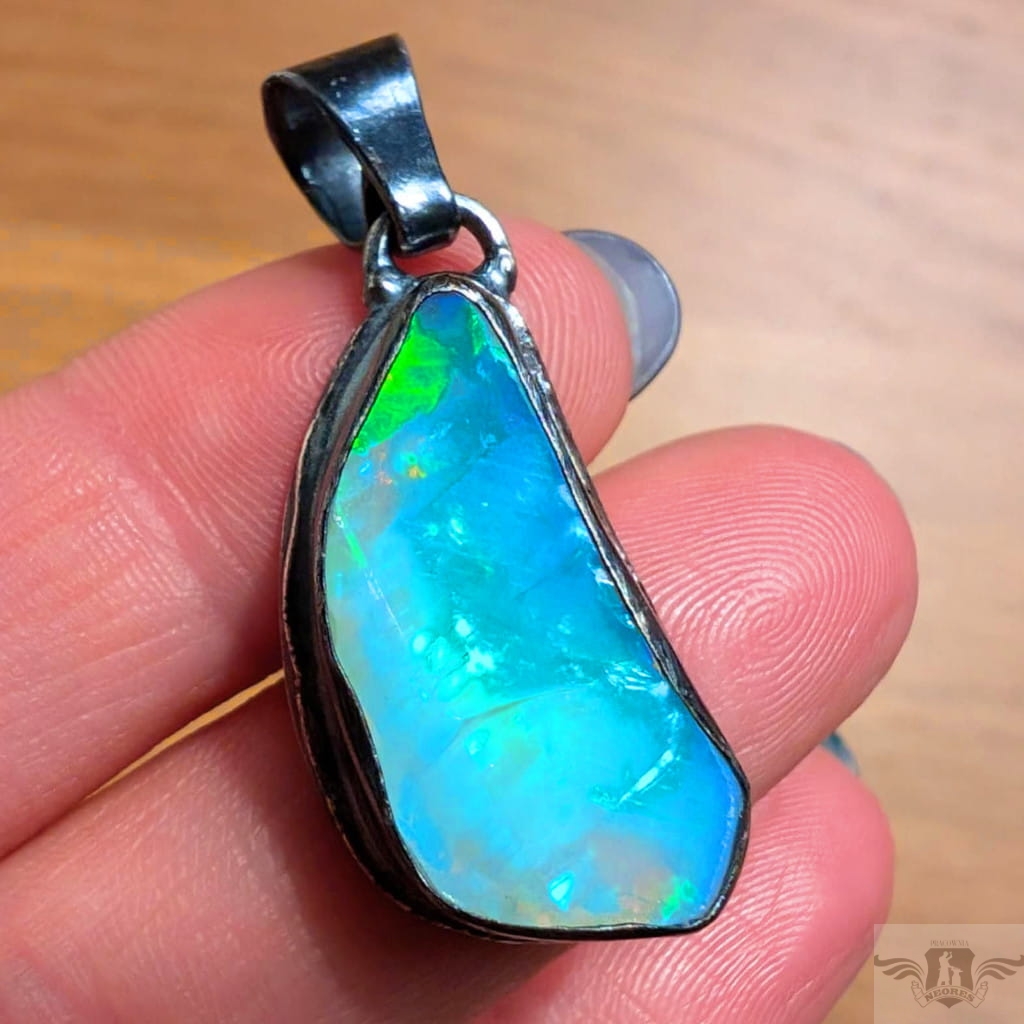 Piękny wisiorek wykonany w całości z oksydowanego srebra oraz dużego, naturalnego opalu z Etiopii. Zjawiskowy okaz o przepięknej opalizacji skrytej pod surową taflą. Wymiary oprawy 27 x 15 mm, długość z krawatką 38mm. Waga 8,5 g. Wisiorek zostanie zapakowany w ozdobne pudełeczko