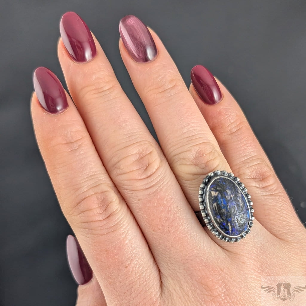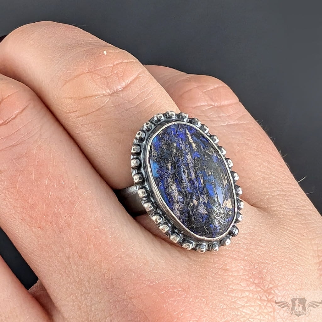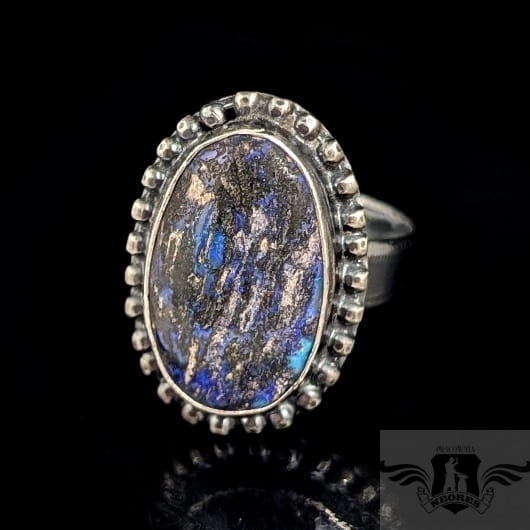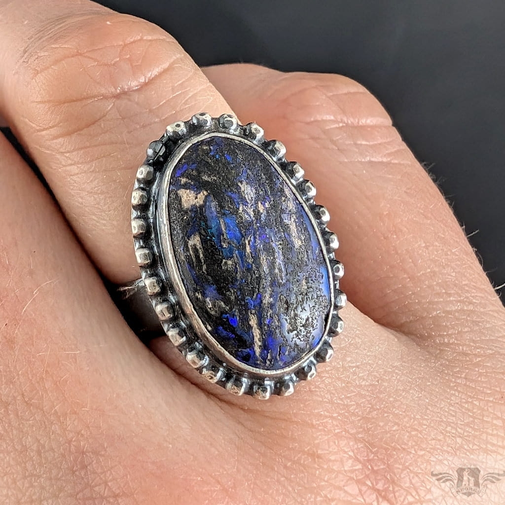Pierścionek z oprawionym w oksydowane srebro próby 925 opalem australijskim typu boulder, Wymiary całej oprawy 23 x 17 mm, rozmiar jubilerski regulowany w szerokim zakresie, po zakupie dopasuję na konkretny. Waga 8 g. Zostanie zapakowany w ozdobne pudełeczo.