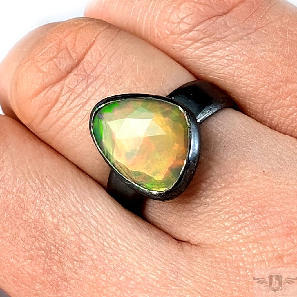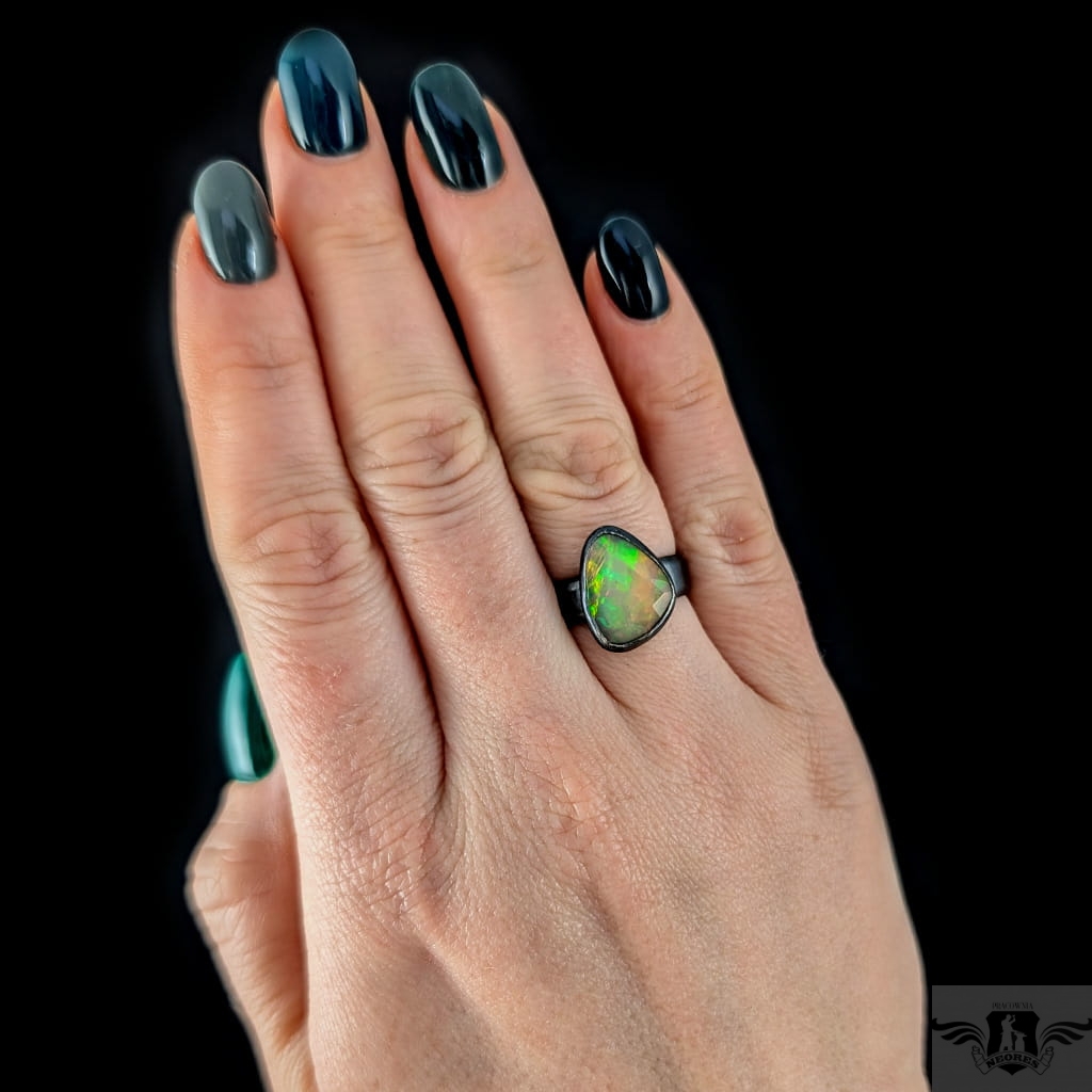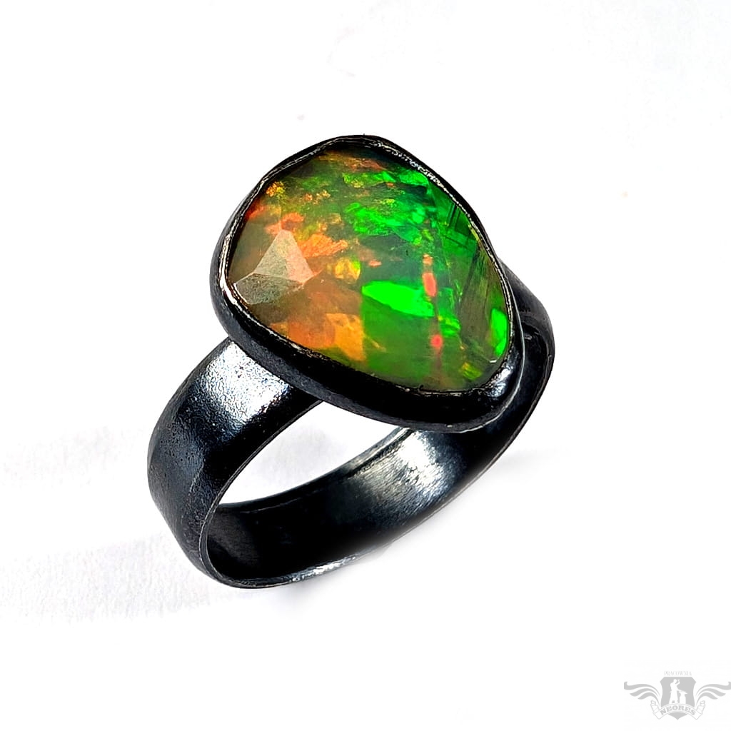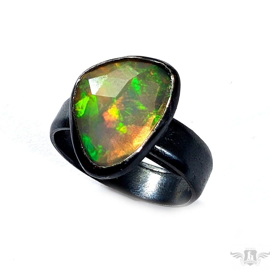 Piękny, surowy pierścień z oprawionym własnoręcznie szlachetnym opalem etiopskim o niezwykle kolorowej tafli dodatkowo spotęgowanej fasetowaniem na całej powierzchni. Kamień o wspaniałej opalizacji barw. Piękno nie do oddania na zdjęciu. Srebro pr.925, oksydowane. Wymiary 15 x 12 mm. Waga 4,6 g. Obrączka regulowana w szerokim zakresie, proszę o kontakt po zakupie, to dopasuję na konkretny rozmiar. Obrączka ma 5 mm szerokości.
