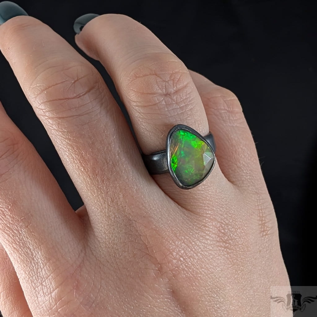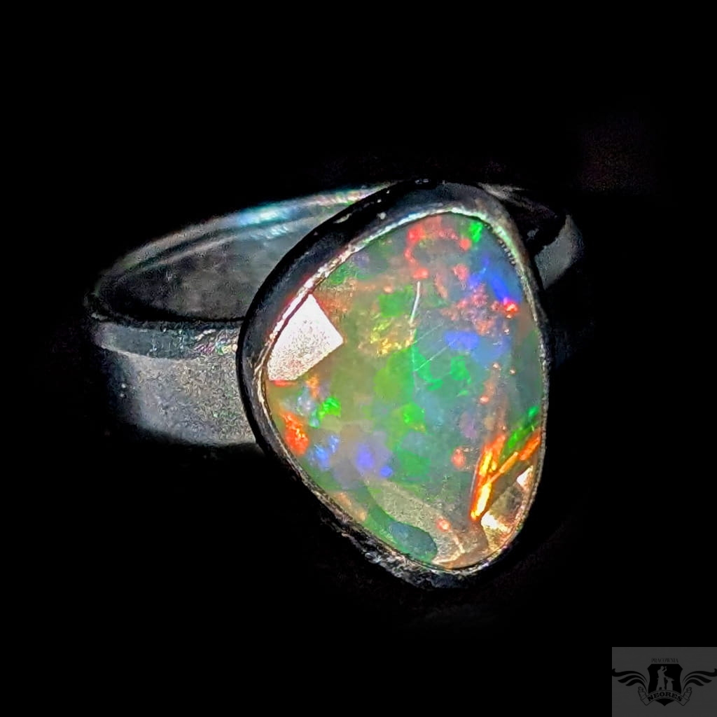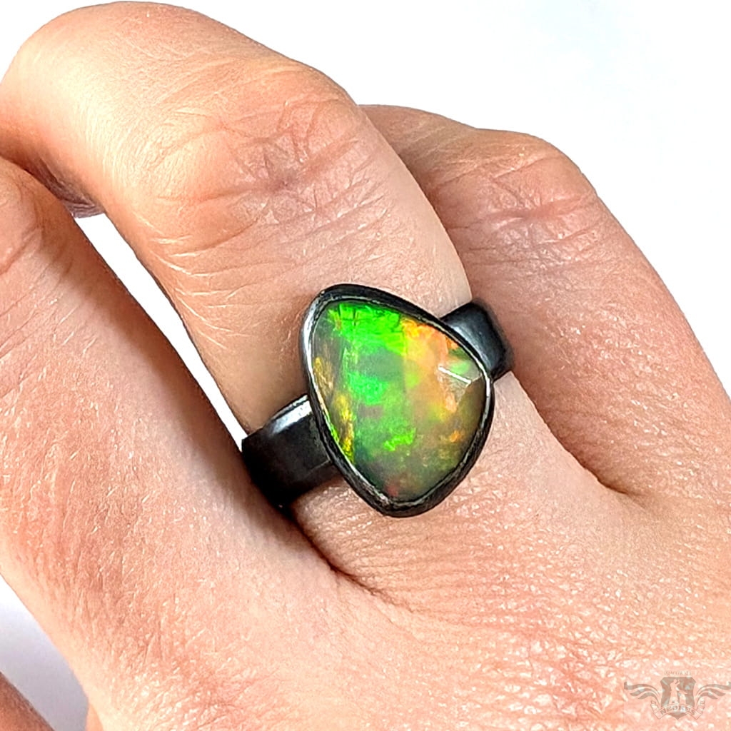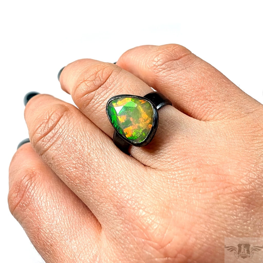 Piękny, surowy pierścień z oprawionym własnoręcznie szlachetnym opalem etiopskim o niezwykle kolorowej tafli dodatkowo spotęgowanej fasetowaniem na całej powierzchni. Kamień o wspaniałej opalizacji barw. Piękno nie do oddania na zdjęciu. Srebro pr.925, oksydowane. Wymiary 15 x 12 mm. Waga 4,6 g. Obrączka regulowana w szerokim zakresie, proszę o kontakt po zakupie, to dopasuję na konkretny rozmiar. Obrączka ma 5 mm szerokości.