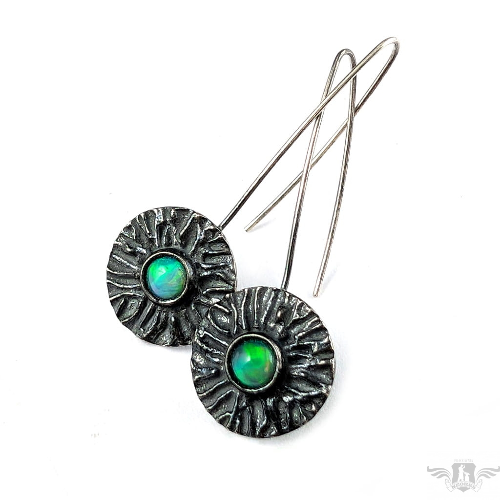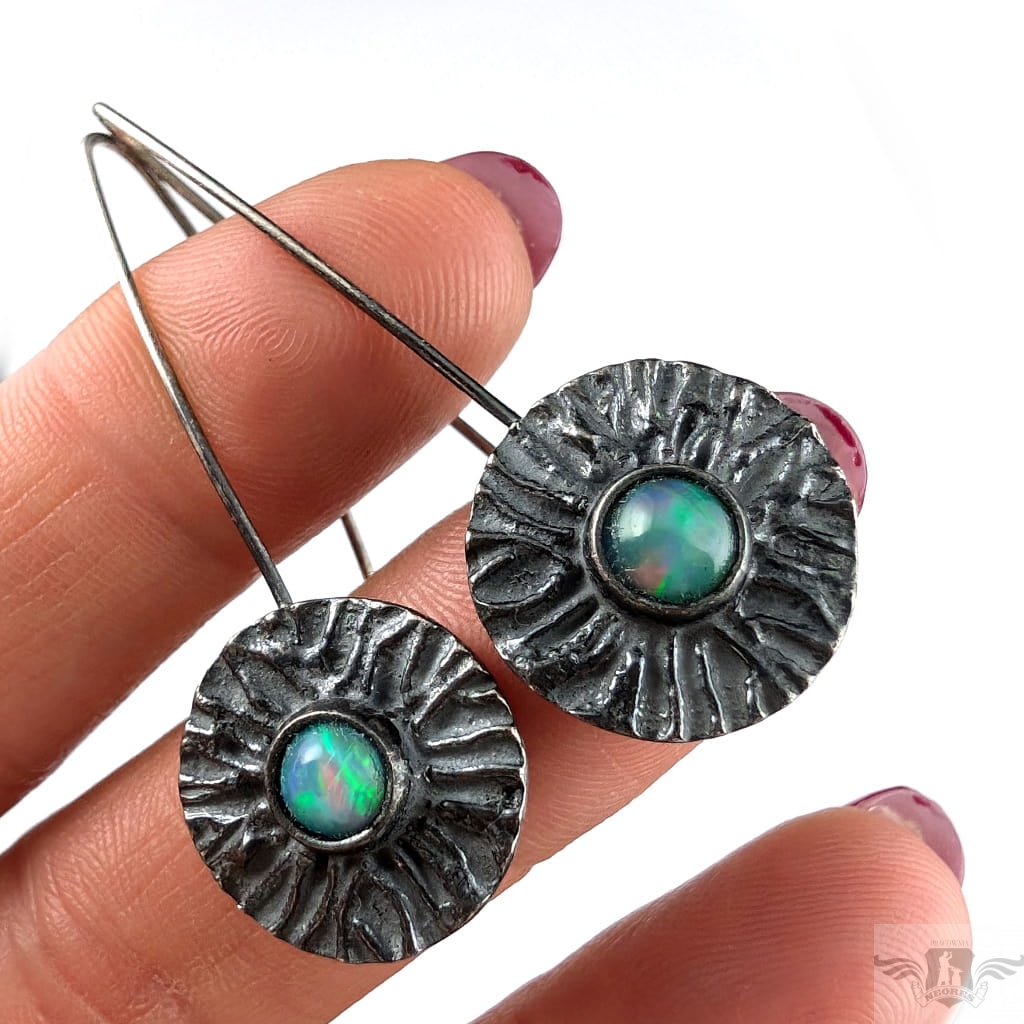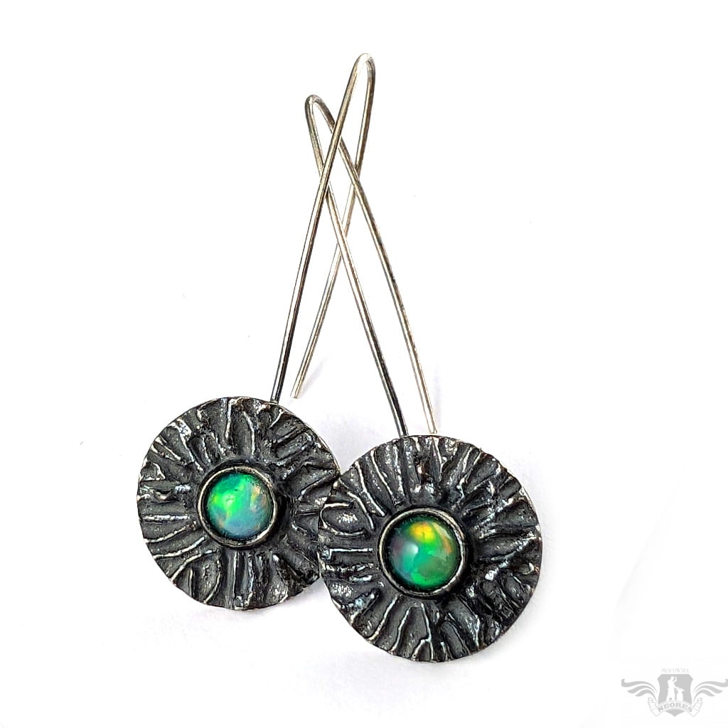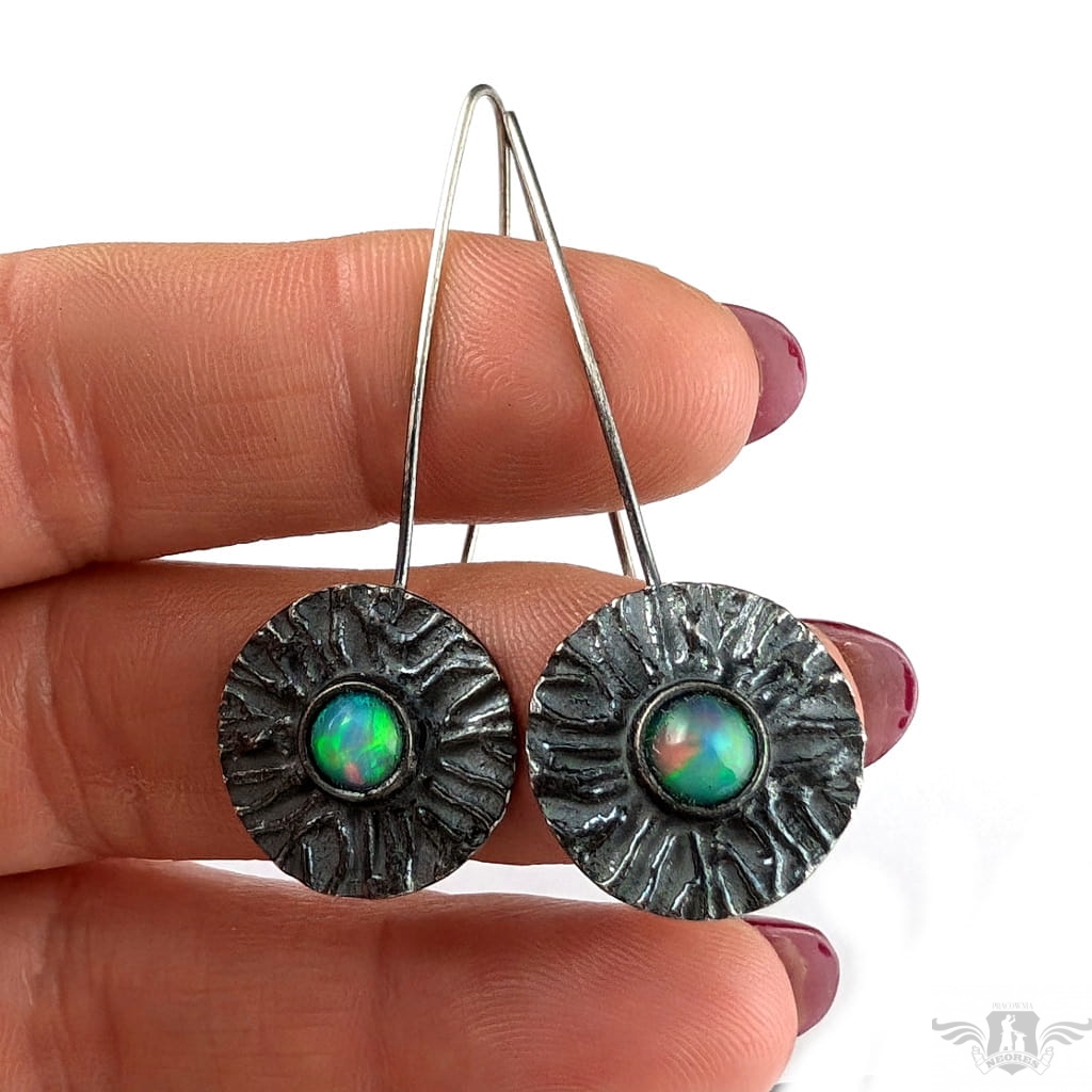 Kolczyki wykonane własnoręcznie z oksydowanego srebra 925 oraz multikolorowych opali z Etiopii. Kamienie zachwycają tęczową opalizacją. Śednica oprawy 18 mm. Długość całości z biglami 48 mm. Leciutkie,waga jednego kolczyka 2,7 grama. Kolczyki zostaną zapakowane w ozdobne pudełeczko